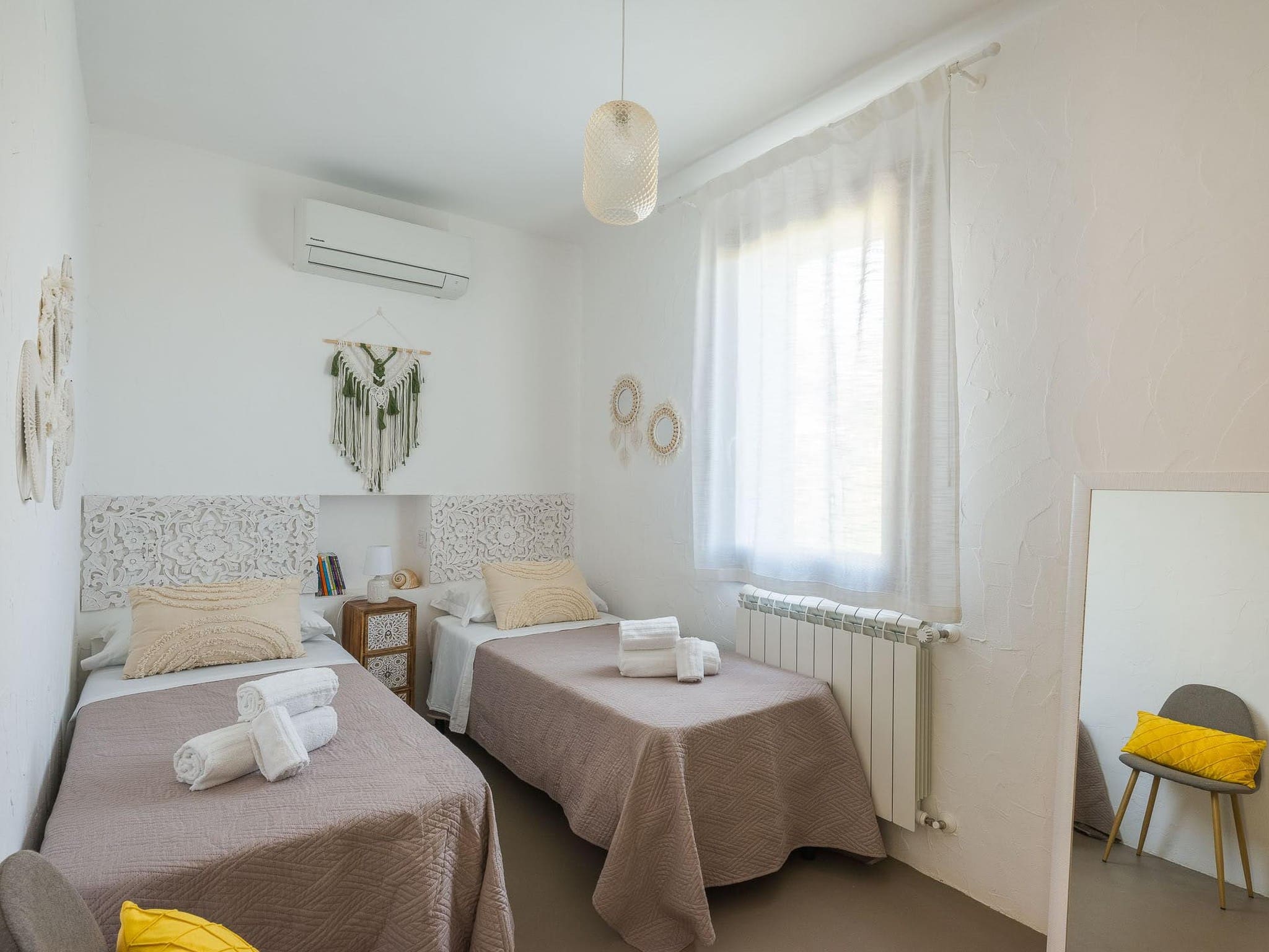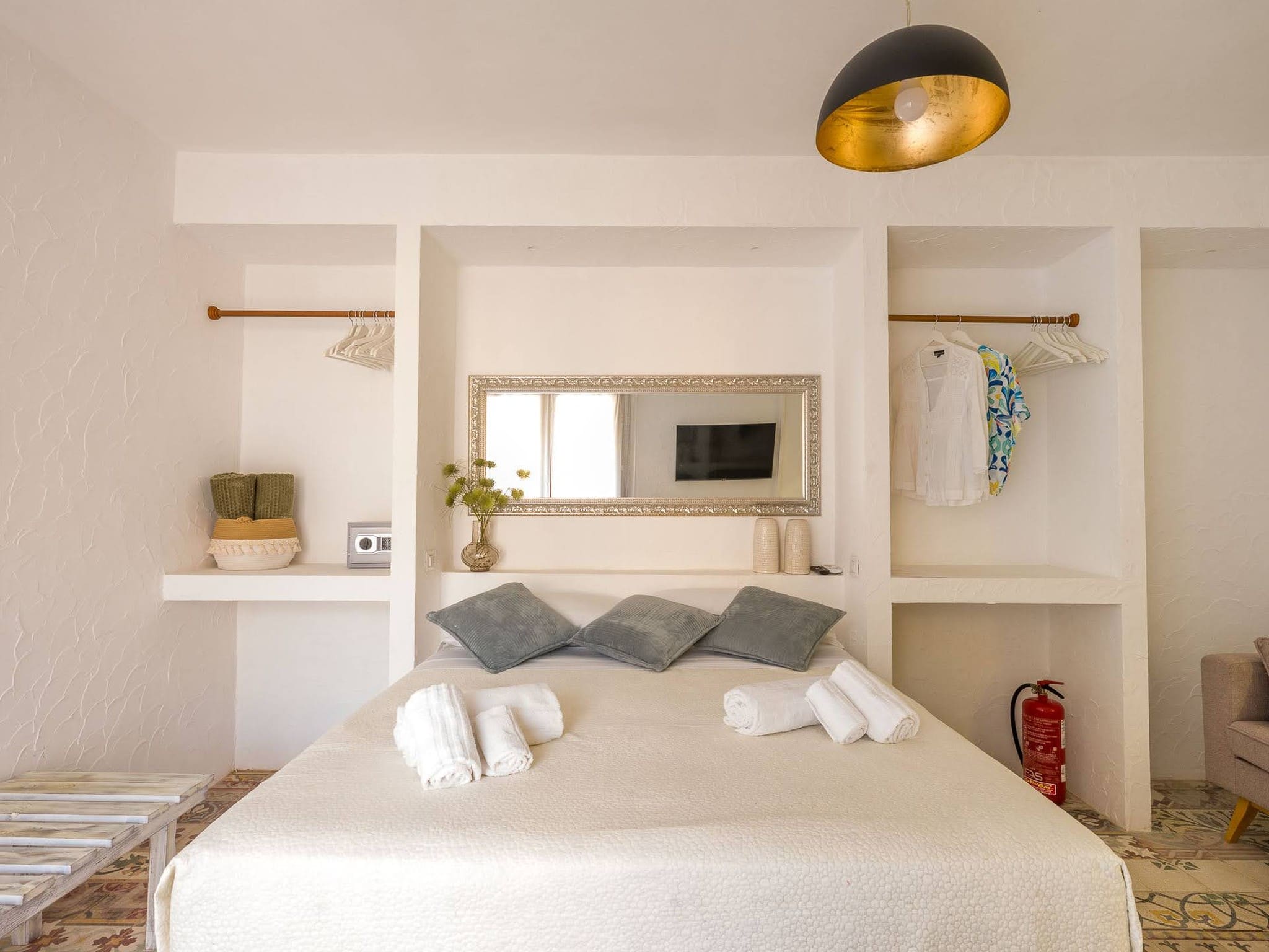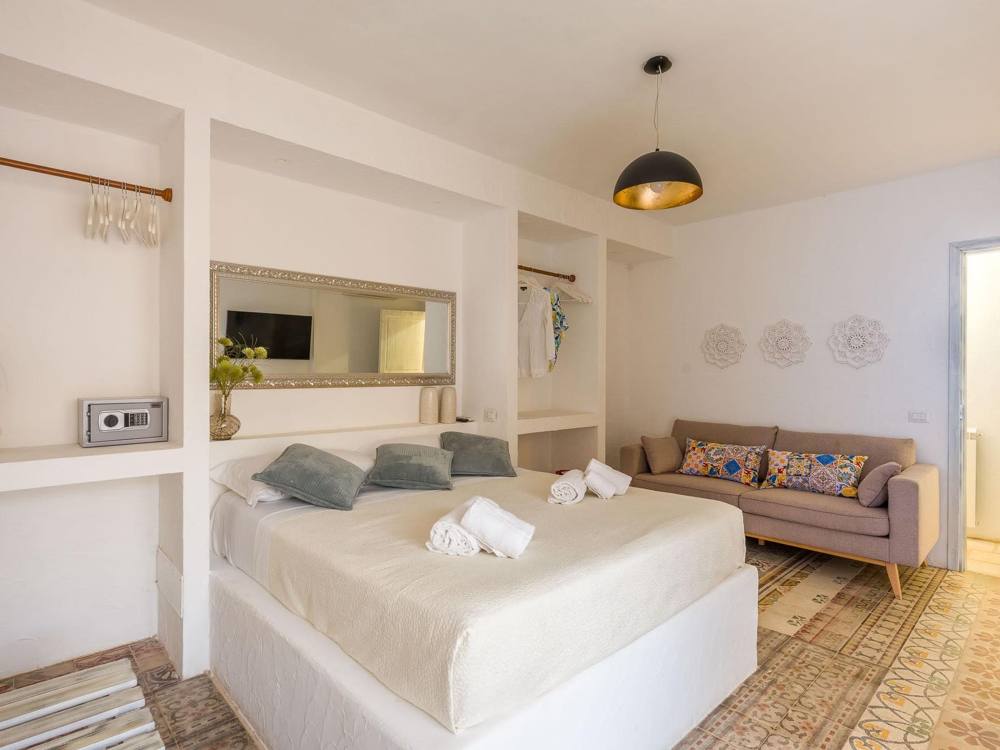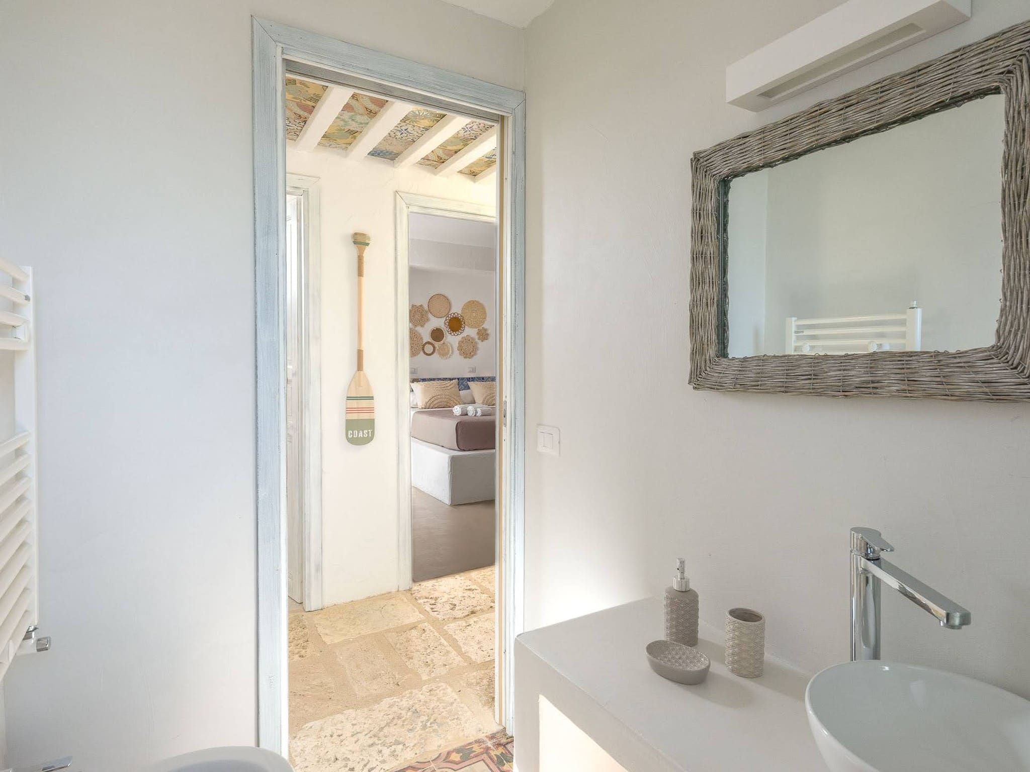 The villa’s interior exudes a bright and rustic charm, perfectly complementing its Mediterranean surroundings. The spacious living areas are designed for comfort and style, featuring stone floors and a seamless blend of traditional and modern elements. The kitchen and living room, though not photographed, maintain the high standard of design seen throughout the home. With four bedrooms and four bathrooms, three of which are conveniently located on the ground floor, this villa ensures accessibility for all guests. The fourth bedroom provides an added layer of privacy on the first floor, complete with its own entrance and a sun-kissed balcony.