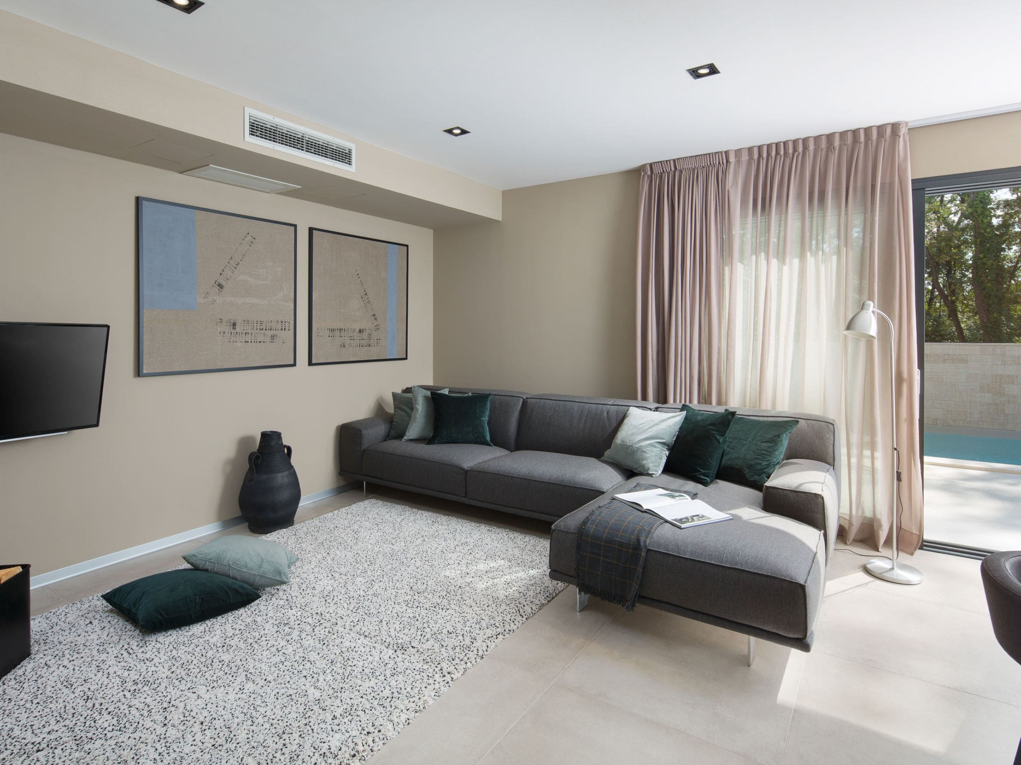 The generous 20-square-metre roofed terrace overlooks the pool area and provides the ideal setting for al fresco dining with the provided barbecue facilities. Comfortable deck chairs and quality terrace furniture create multiple outdoor living zones, while the Mediterranean garden with its lawn areas and carefully selected plants offers a serene backdrop for your Croatian holiday.