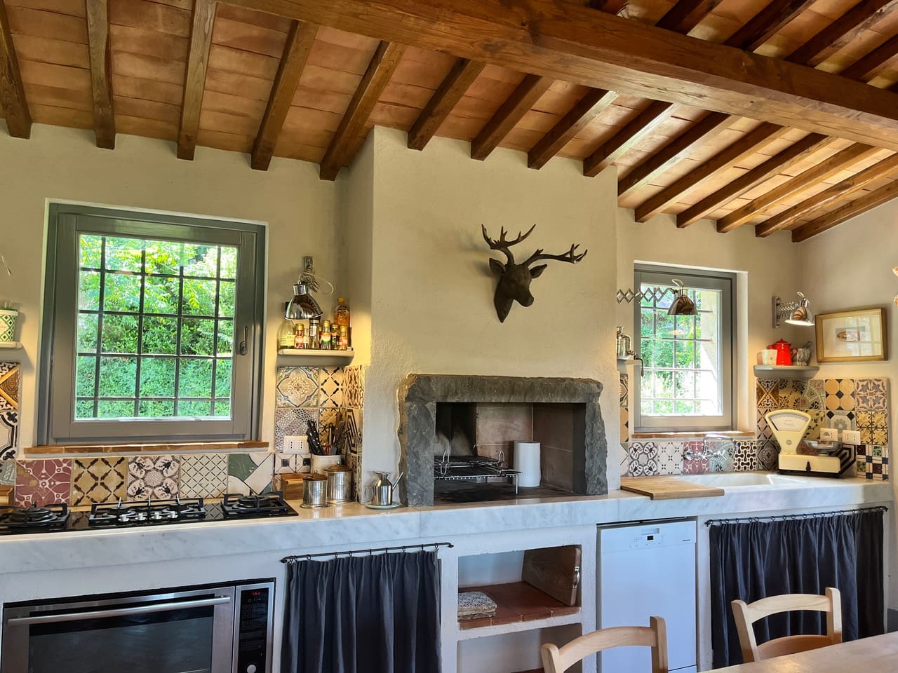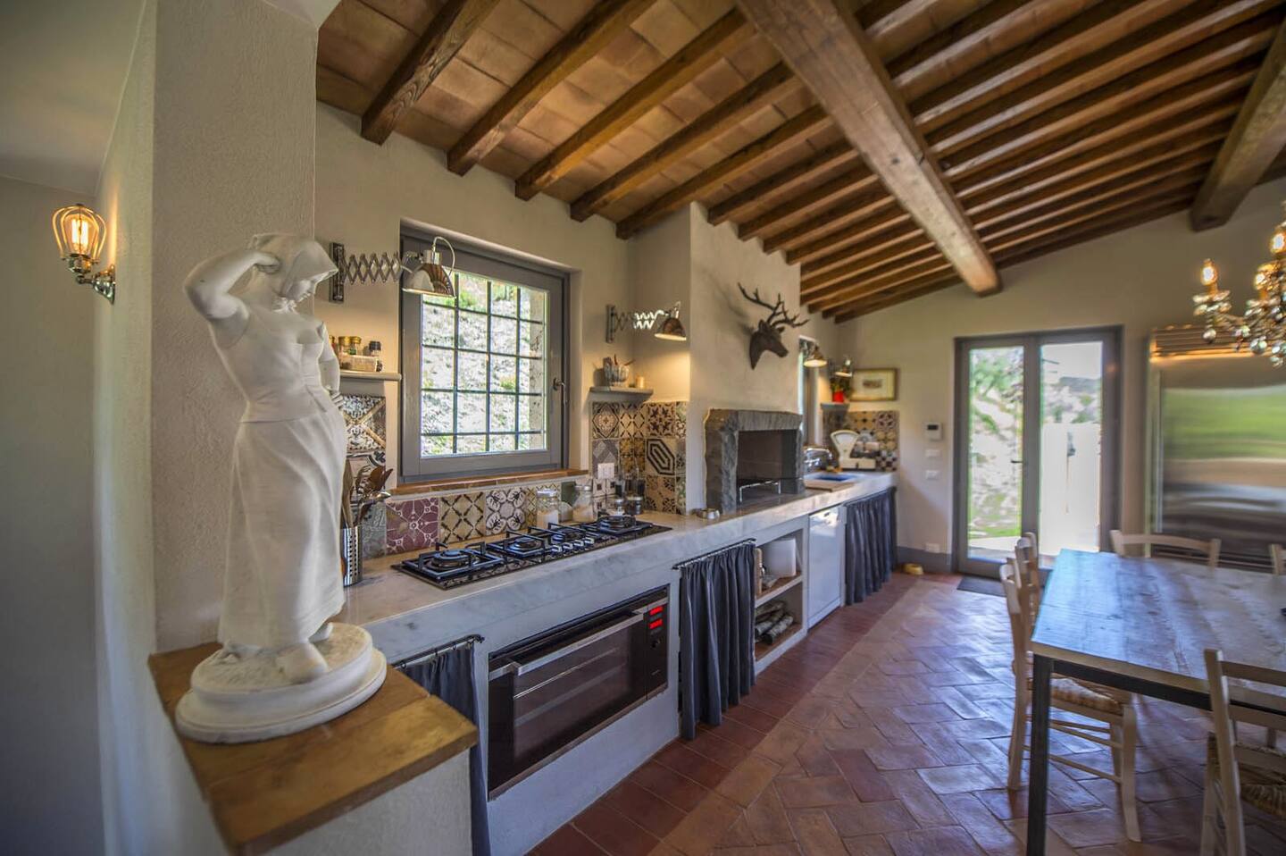 Step into the inviting interiors of Villa Sirocchi Amelia, where exposed wooden beams and terracotta floors meet modern amenities. The open-plan living area, complete with a stone hearth, provides a cozy space for gathering. The kitchen, outfitted with state-of-the-art appliances, invites culinary exploration. Each of the four bedrooms is a sanctuary of comfort, featuring French windows that open onto scenic terraces, with one bedroom offering a private entrance from the garden, ensuring privacy and convenience.