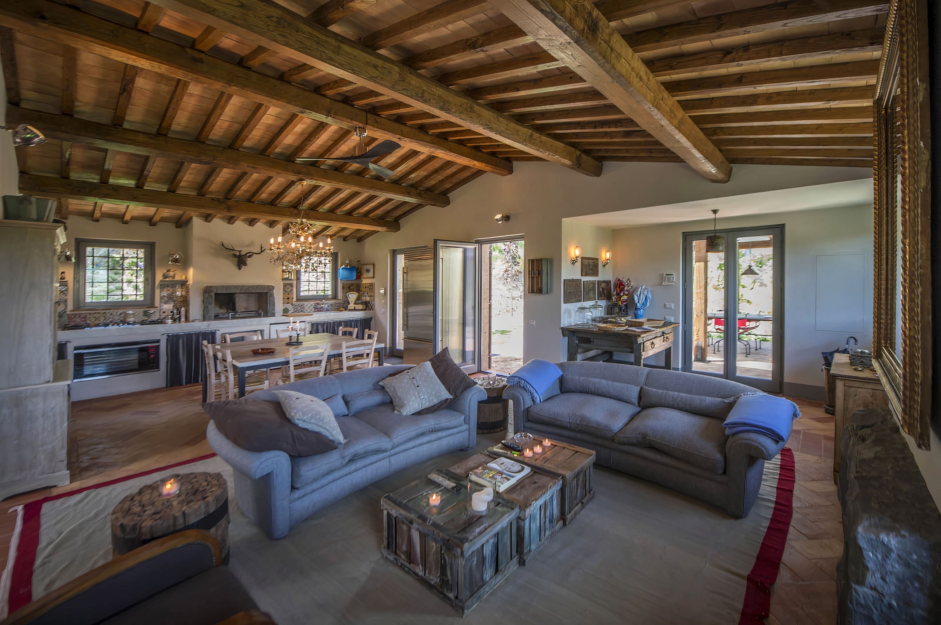 The villa’s outdoor spaces are a testament to its luxurious allure. Relax by the swimming pool, available from June to September, and soak in the panoramic views of the rolling Umbrian landscape. Enjoy alfresco dining under rose-covered pergolas, or unwind in the shaded outdoor lounges that perfectly capture the essence of bucolic living.