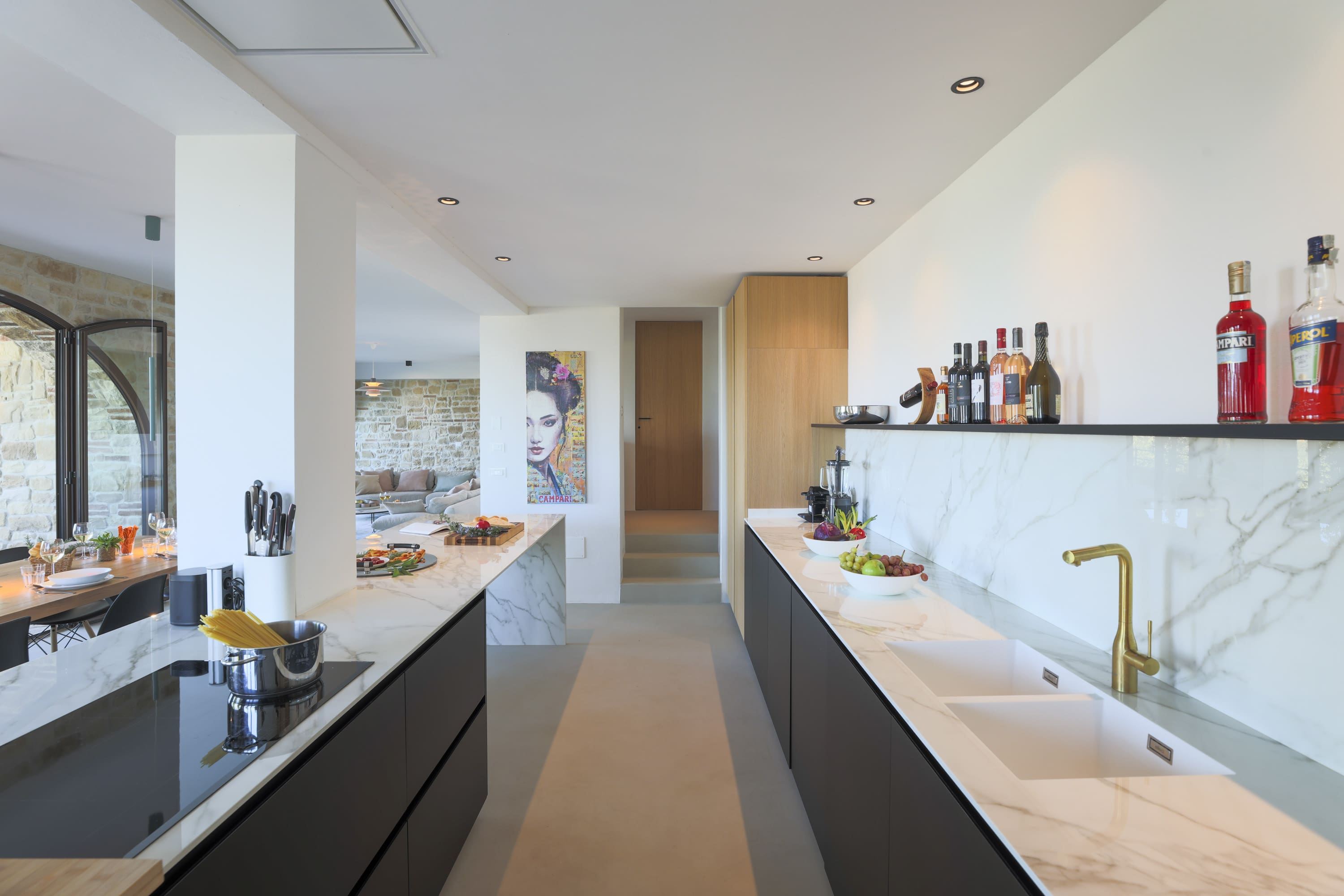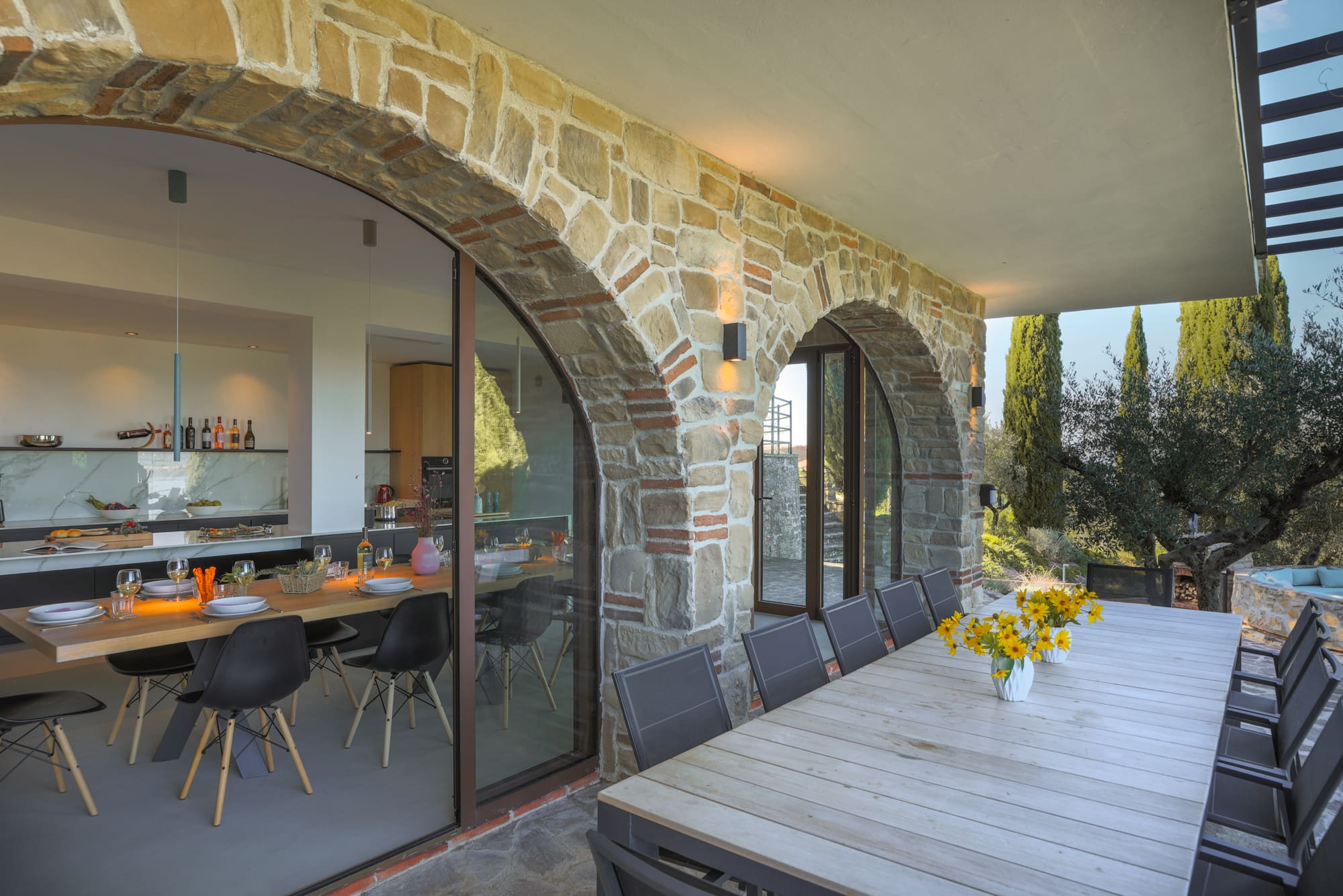 Accommodating up to 12 guests, the villa features five bedrooms and three bathrooms. Parking is available for up to three cars, with an EV charger on-site. The home is accessible via both internal and external stairs. Pets are welcome, ensuring no family member is left behind. Browse our luxury villa rentals in Italy for more properties.