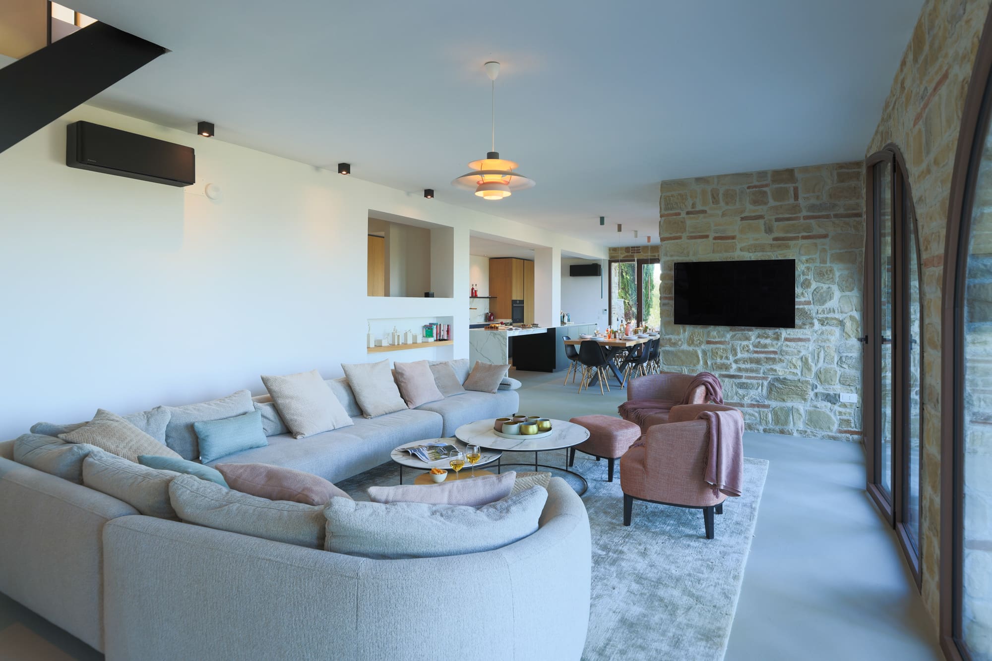 Step inside to discover a harmonious blend of rustic charm and modern comfort. The villa spans two floors, featuring five elegantly appointed bedrooms that can accommodate up to 12 guests. The living spaces are designed for relaxation, with a spacious lounge area and a fully equipped kitchen perfect for culinary adventures. Adaptable sleeping arrangements allow for three double bedrooms to be converted into singles upon request, ensuring flexibility for any group size.