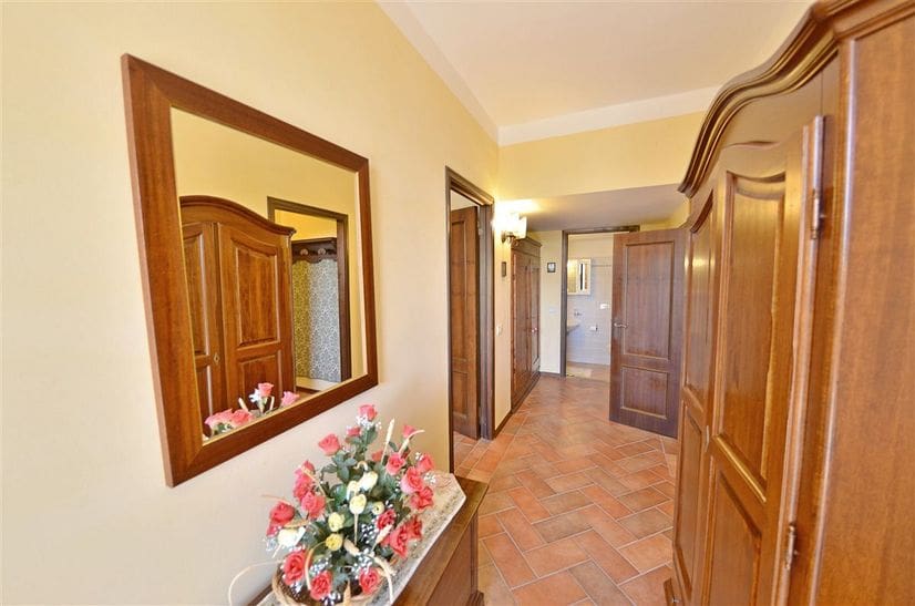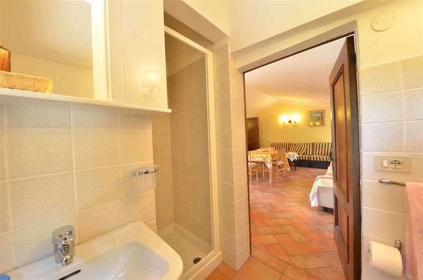 The entrance hall opens into a spacious open-plan living/dining space with a fireplace, satellite TV, stereo and bar area. The glass windows and doors surrounding this room provide wonderful natural light and views. This spacious area opens up onto a furnished terrace that runs along two sides of the villa. It is perfect for enjoying the beautiful Tuscan sunsets.