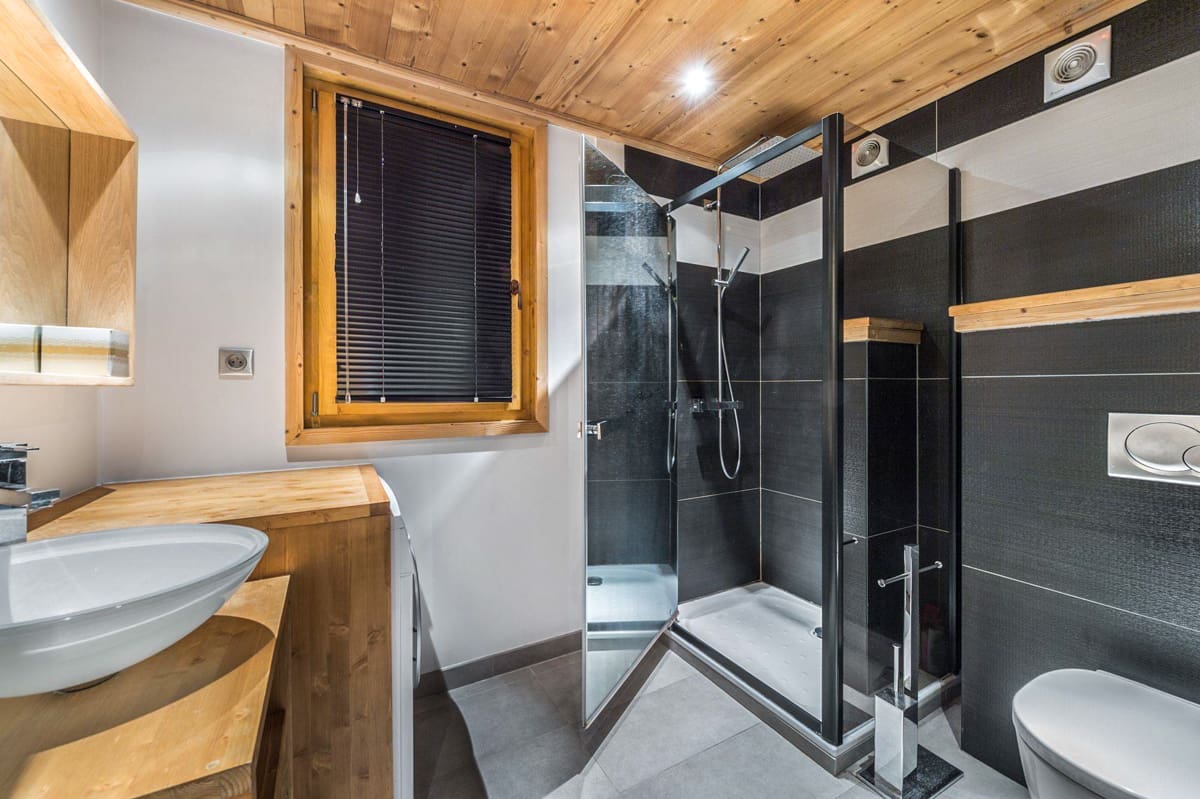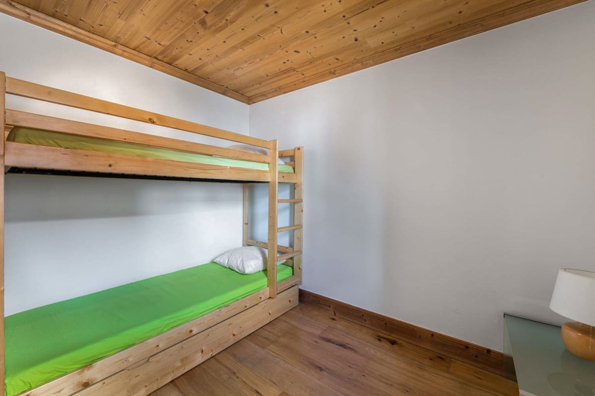 The bedrooms are beautifully decorated with high-quality bedding, plush mattresses, bright Alpine architecture, and soft lighting, creating a cosy and inviting atmosphere. The largest bedroom features a comfortable double bed, access to an outdoor terrace, and a private en-suite bathroom. The remaining bedrooms can each accommodate two guests, with two twin rooms that can be converted into doubles and a children’s room with two bunk beds. Guests have shared access to a spacious shower room and a separate toilet room.