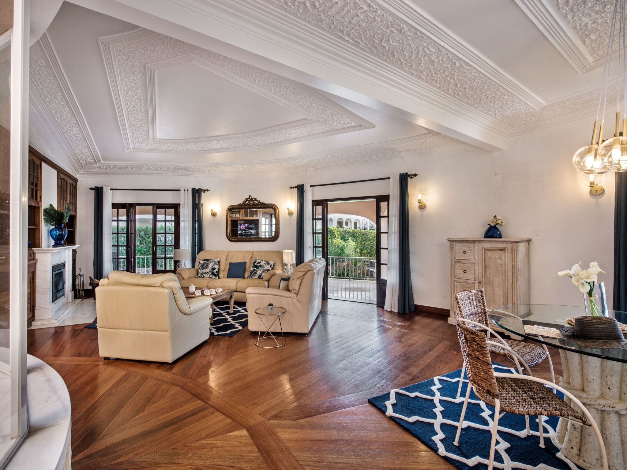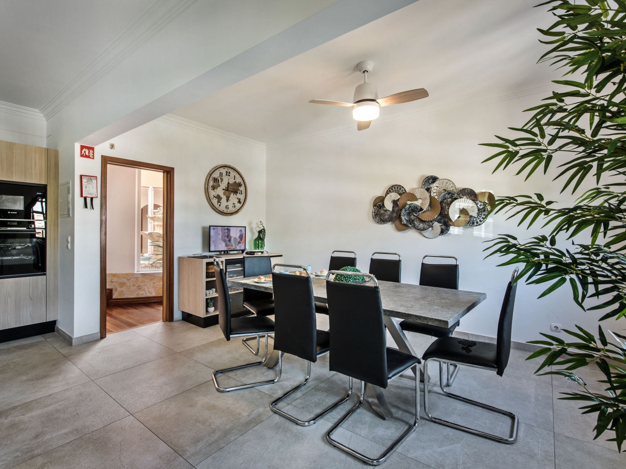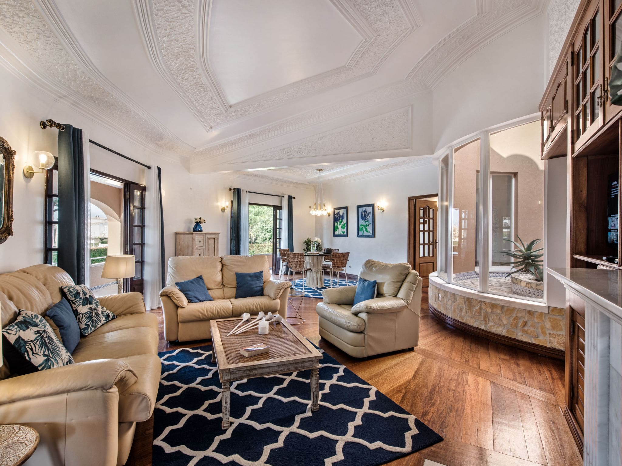 Spread across two thoughtfully designed levels, this 341-square-meter villa combines modern comfort with traditional Portuguese charm. The ground floor welcomes guests with a bright living area featuring comfortable seating, flat-screen television, and air conditioning throughout. French doors open directly onto the terrace and garden, creating seamless indoor-outdoor flow that defines Algarve living. The fully equipped kitchen includes premium appliances, from dishwasher to coffee machine, making self-catering a pleasure rather than a chore.