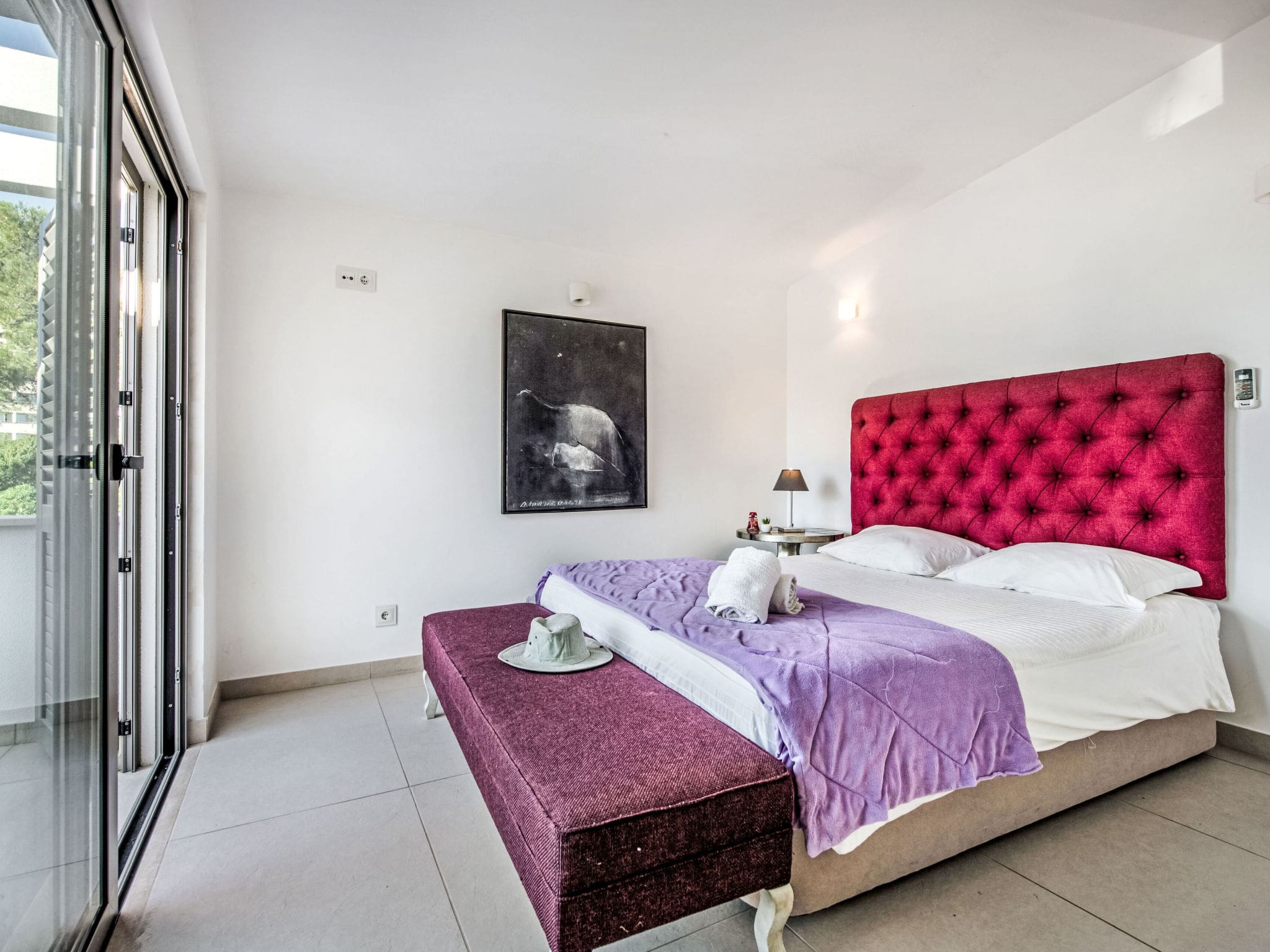 Five bedrooms accommodate up to ten guests across the various floors. The lower ground floor houses two bedrooms, including one with a luxurious French bed and en-suite shower room, plus a twin bedroom with direct access to the pool terrace. The upper floor features two additional bedrooms, each with French beds and private shower facilities, while the top floor provides a fifth twin bedroom. Every bedroom benefits from air conditioning and forced-air heating, ensuring year-round comfort.