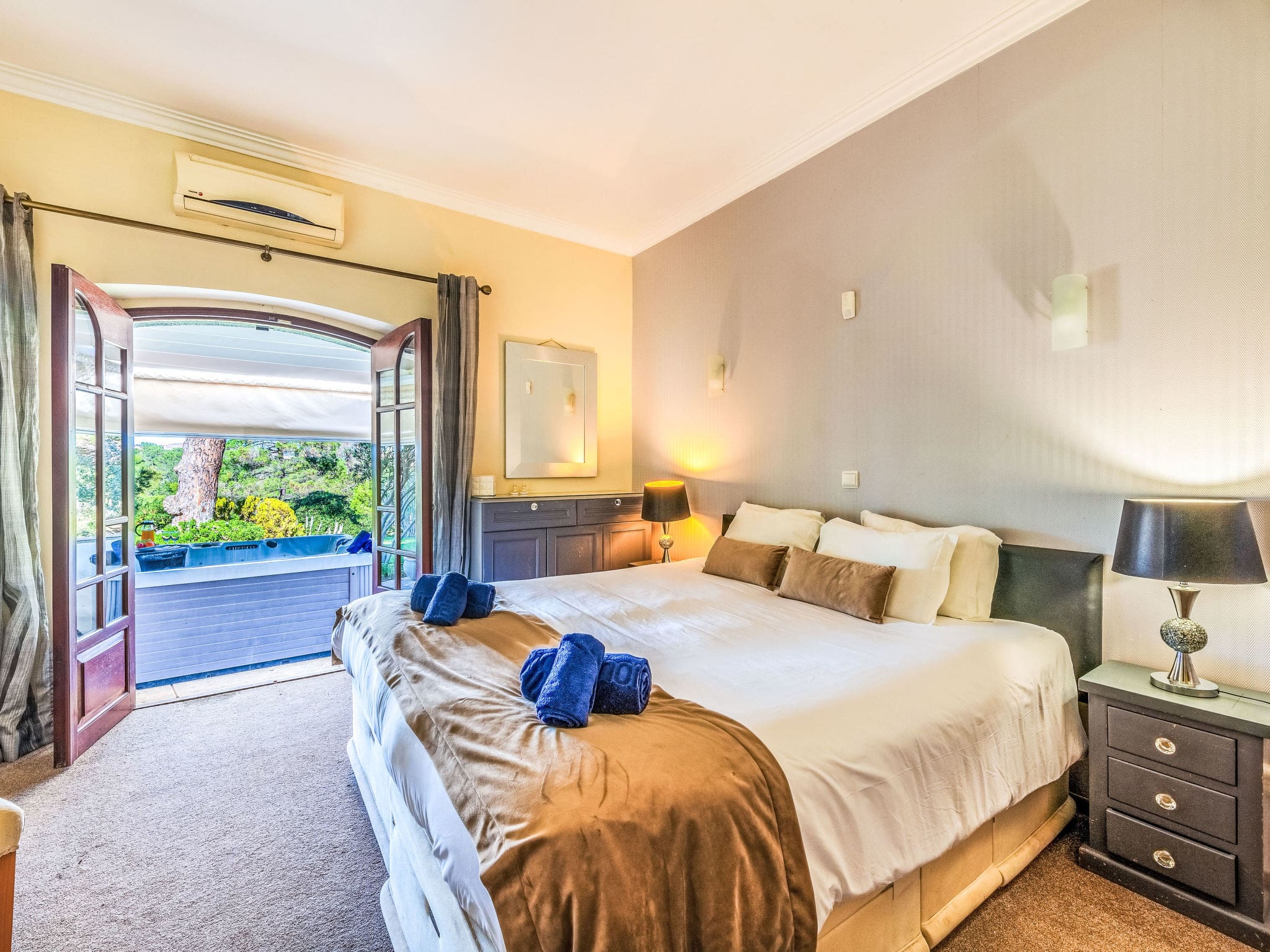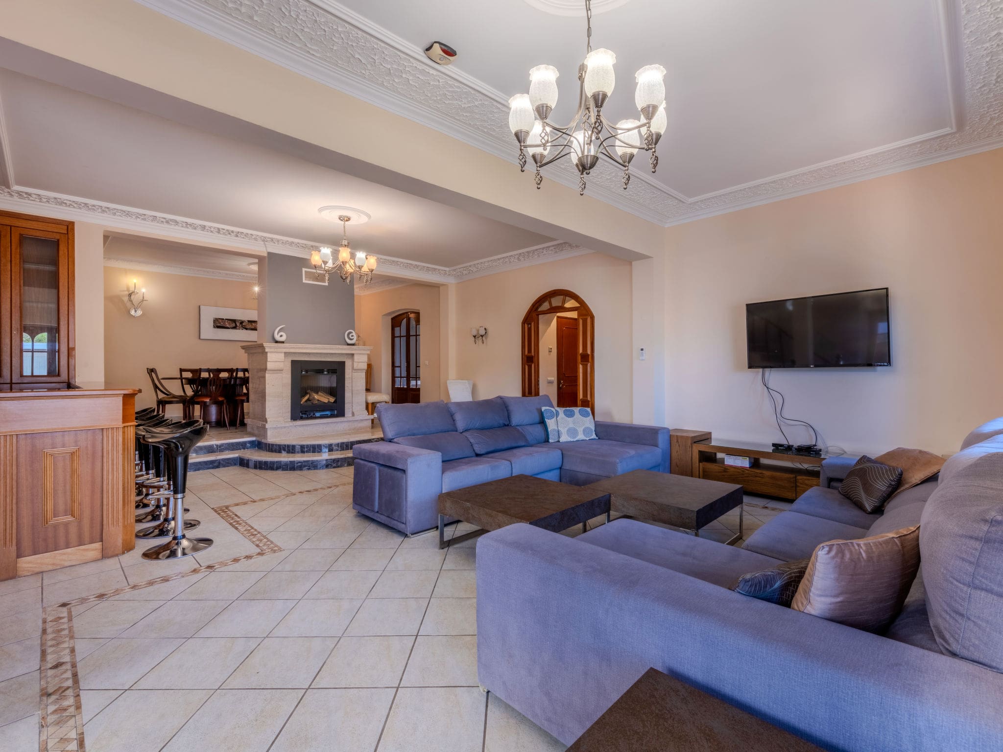 The spacious 430-square-metre interior showcases contemporary Portuguese design with premium comfort throughout. The main level welcomes guests with a generous living room featuring comfortable seating and a dining area, complemented by cable television and efficient air conditioning. French doors open seamlessly to outdoor terraces, creating an effortless indoor-outdoor flow. The modern kitchen comes fully equipped with professional-grade appliances, including a seven-ring gas cooktop, dishwasher, microwave, and Dolce Gusto coffee machine, perfect for preparing everything from morning coffee to elaborate meals.