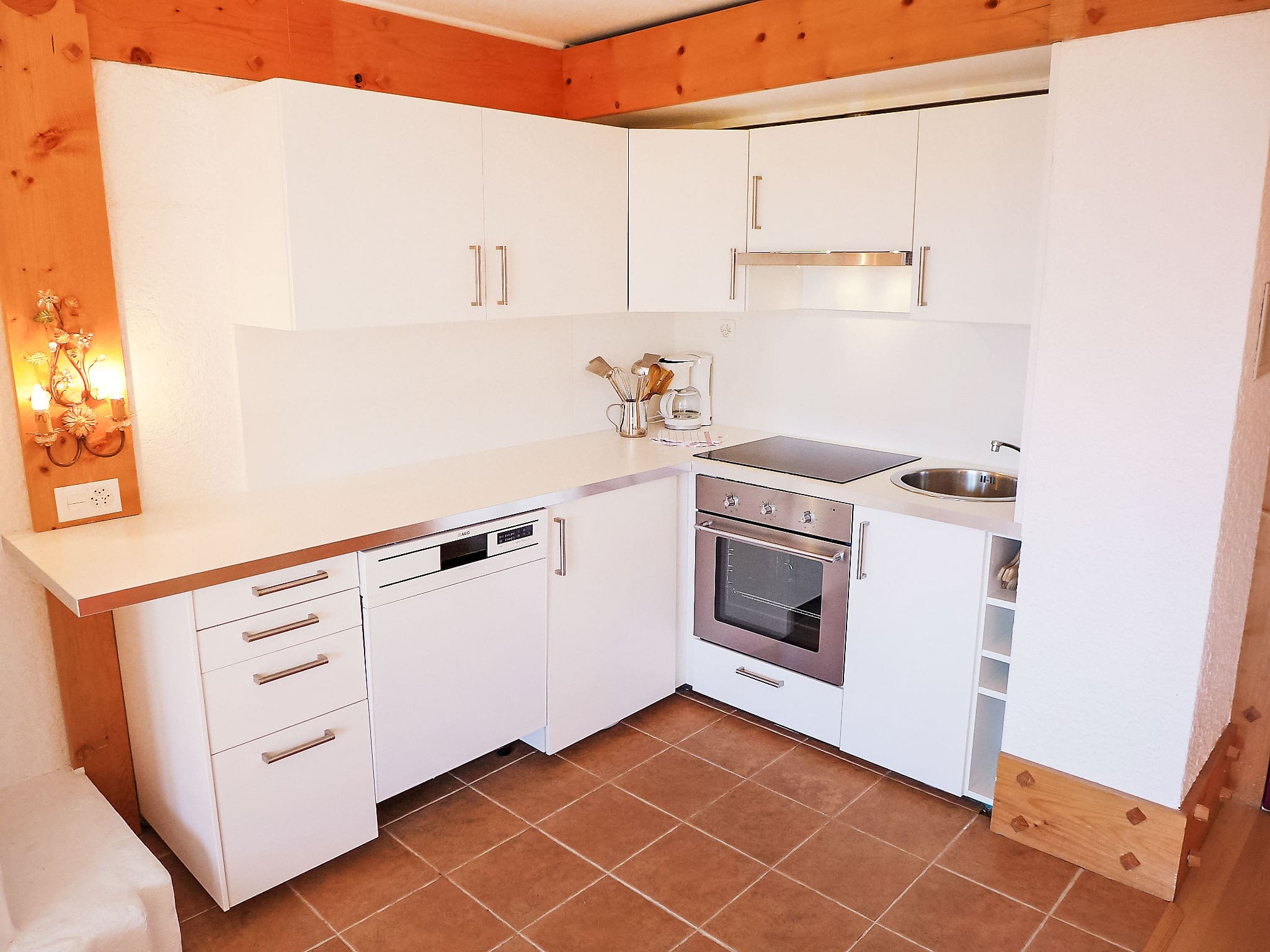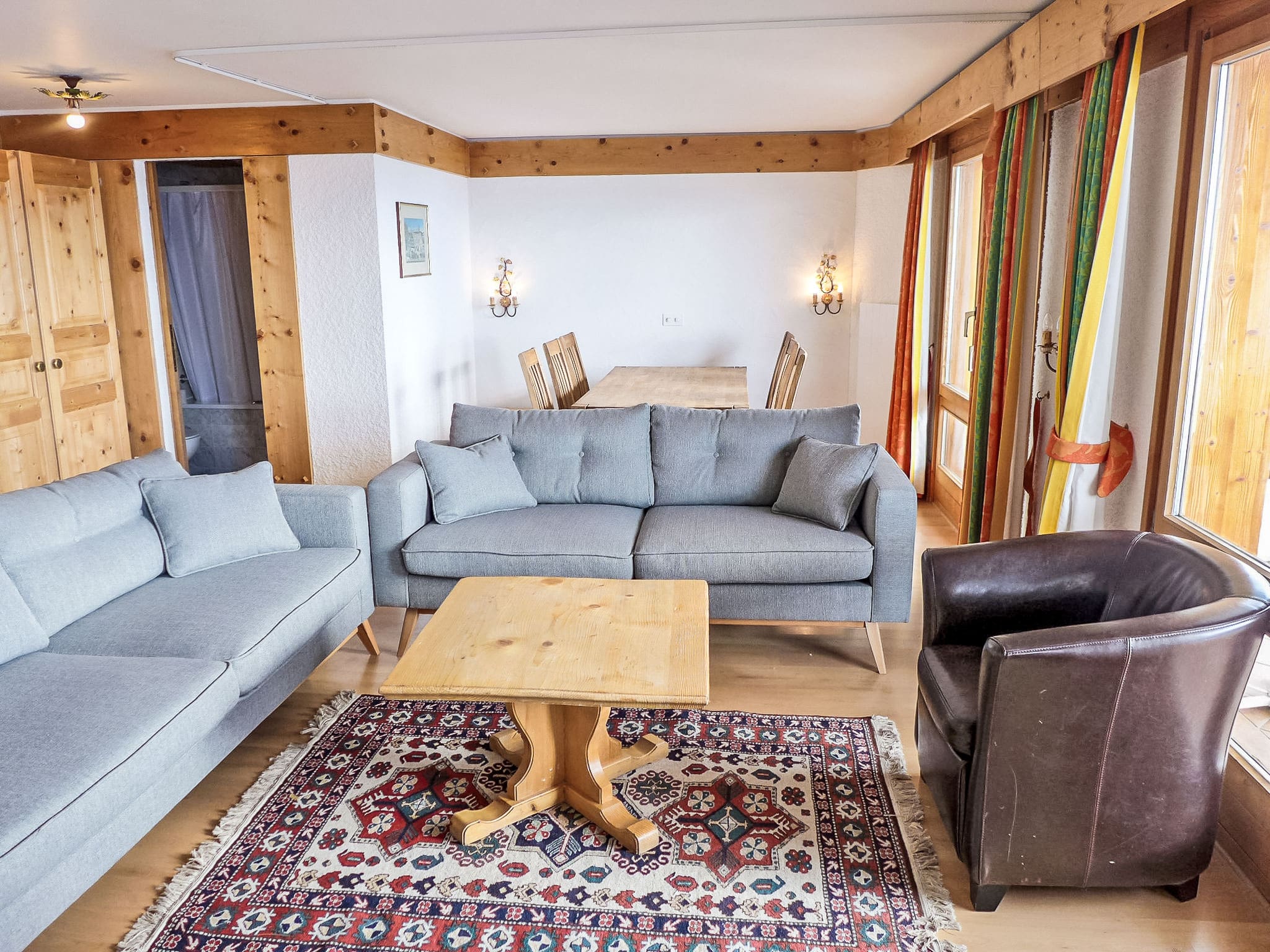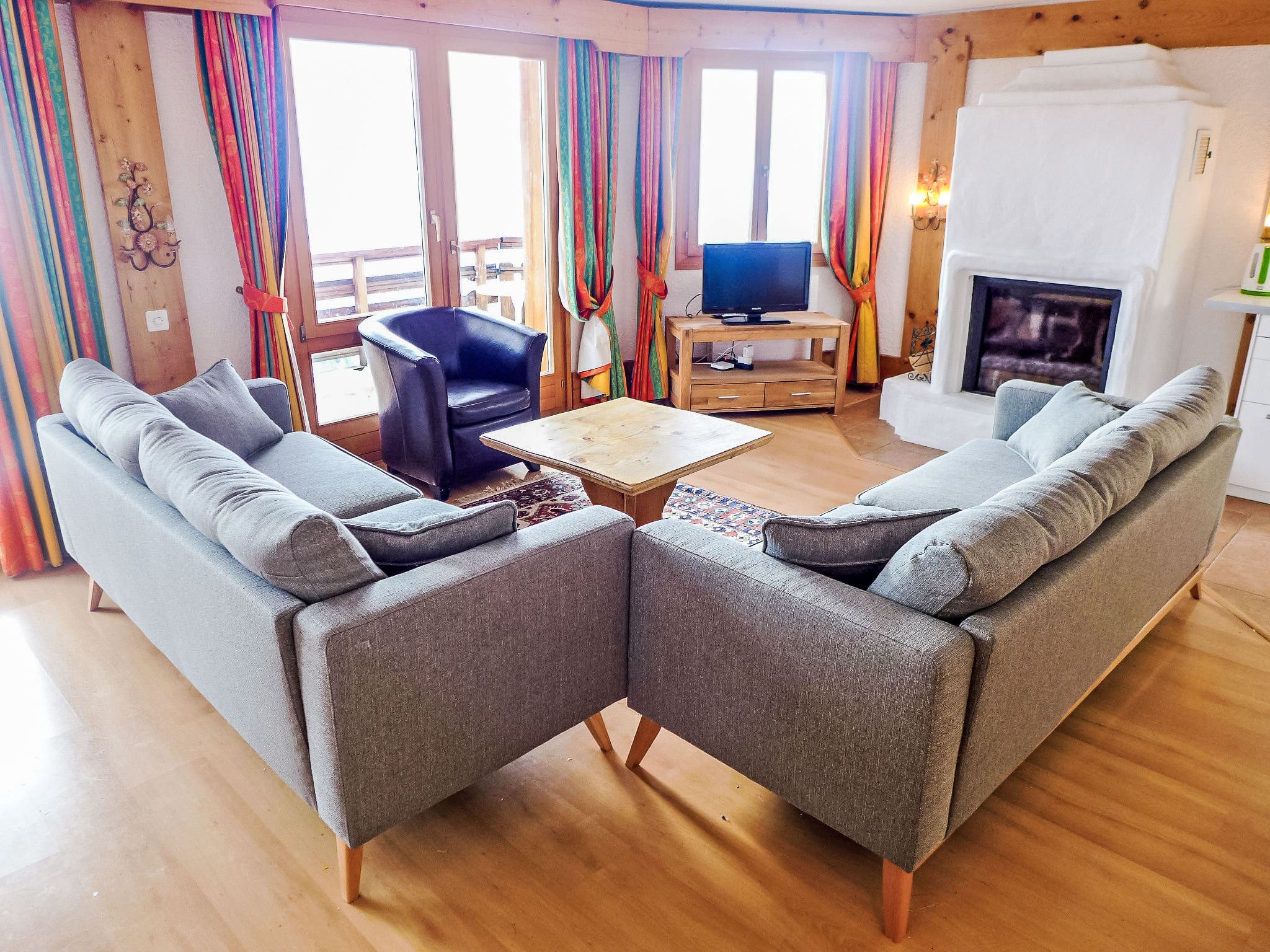 The 115-square-meter apartment features a thoughtfully designed open-plan living and dining area anchored by an inviting open-hearth fireplace, perfect for gathering after days exploring the alpine landscape. Floor-to-ceiling windows flood the space with natural light while framing spectacular mountain vistas. The modern kitchen corner is fully equipped with premium appliances including a dishwasher, microwave, and electric coffee machine, plus a traditional raclette grill for authentic Swiss dining experiences.