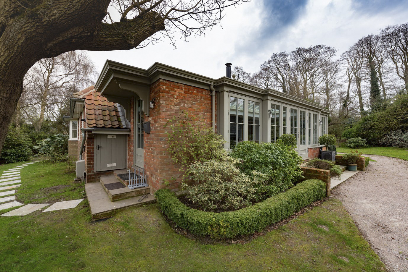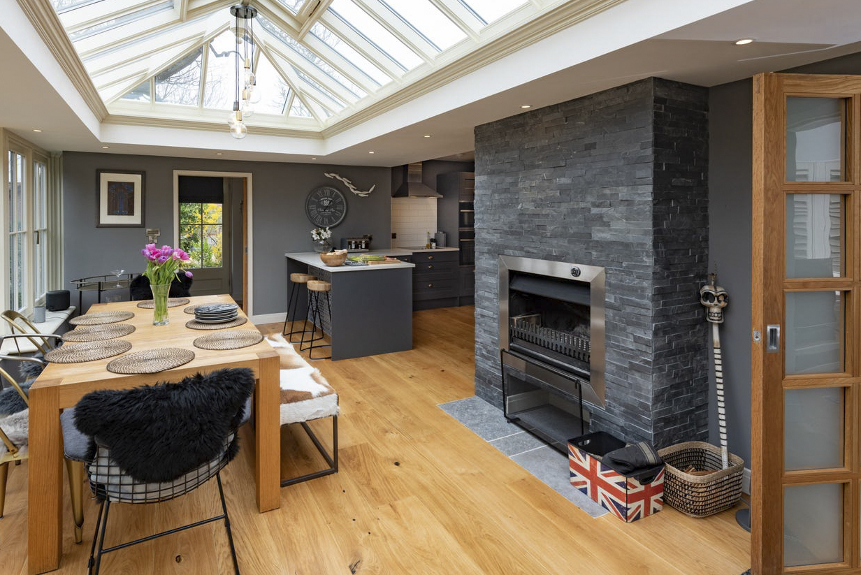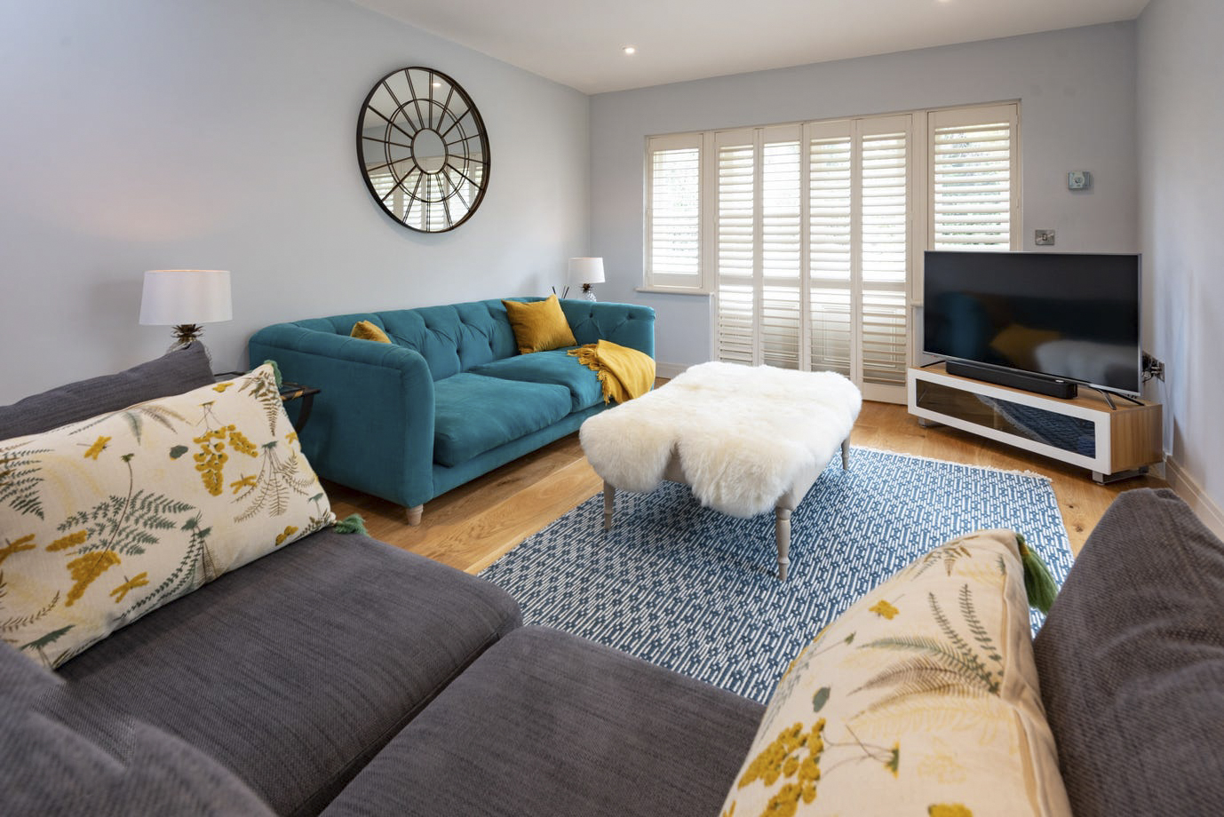 The interiors are wonderfully open, not just to the outside world but also within, flowing seamlessly from one room to the next, each delightfully styled with soft monochrome fabrics and geometric patterns. You can rustle up a treat in your expansive kitchen, perfectly blending traditional charm with modern ease, whilst chatting with others sitting along the breakfast bar, and laughing along with those at the dining table all at once! And from here there’s even a lounge area at the far end of this beautiful sunroom. Meanwhile there’s a beautifully cosy lounge tucked away from this social space for when you want to just pop your feet up in front of the TV and switch off!