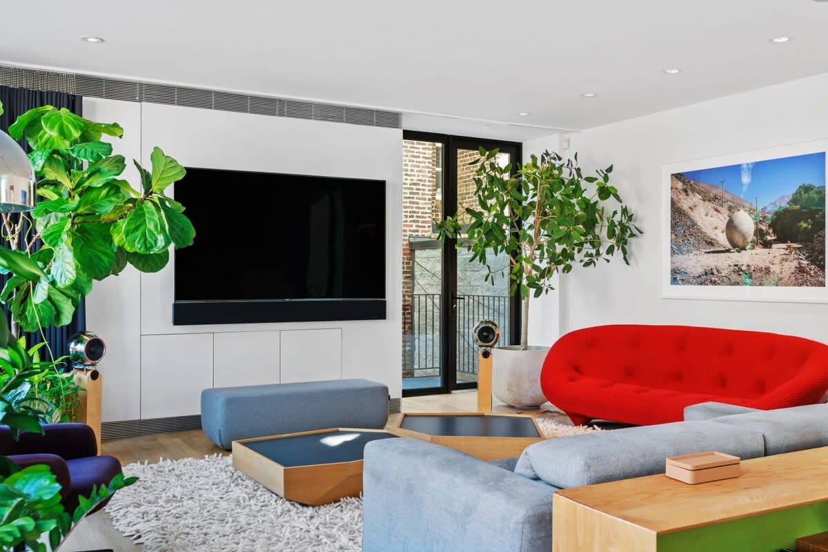 Step inside to find an expansive, double-height living area flooded with natural light, a hallmark of this luxury townhouse rental in Williamsburg. The sleek, modern design integrates seamlessly with the building’s early 20th-century architecture, creating a unique blend of old and new. The open-plan living space is perfect for both relaxation and entertaining, featuring plush furnishings and contemporary art pieces. The kitchen, equipped with high-end appliances, invites culinary exploration. Each of the three bedrooms is elegantly furnished, with the second bedroom offering cozy accommodations despite limited storage space. The third sleeping area features a comfortable sofa bed, ideal for flexible sleeping arrangements.
