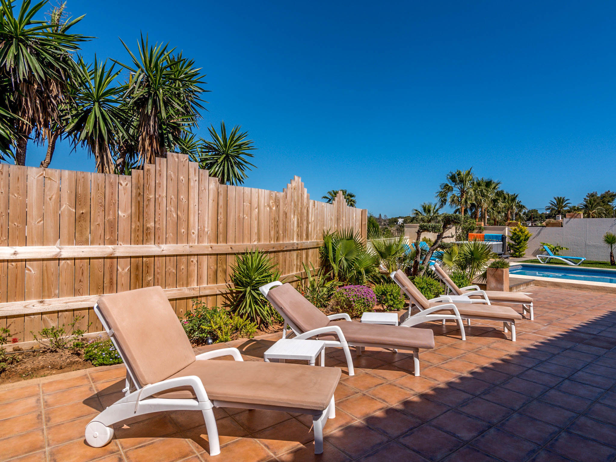 There’s an electric barbecue and a selection of sun loungers and deck chairs on the terrace, while the gardens have more secluded seating areas away from the pool. You can easily make your way to La Barraca beach, around 2km away, or drive to sandy. Arenal, which is about 7km away, from Villa Isas.