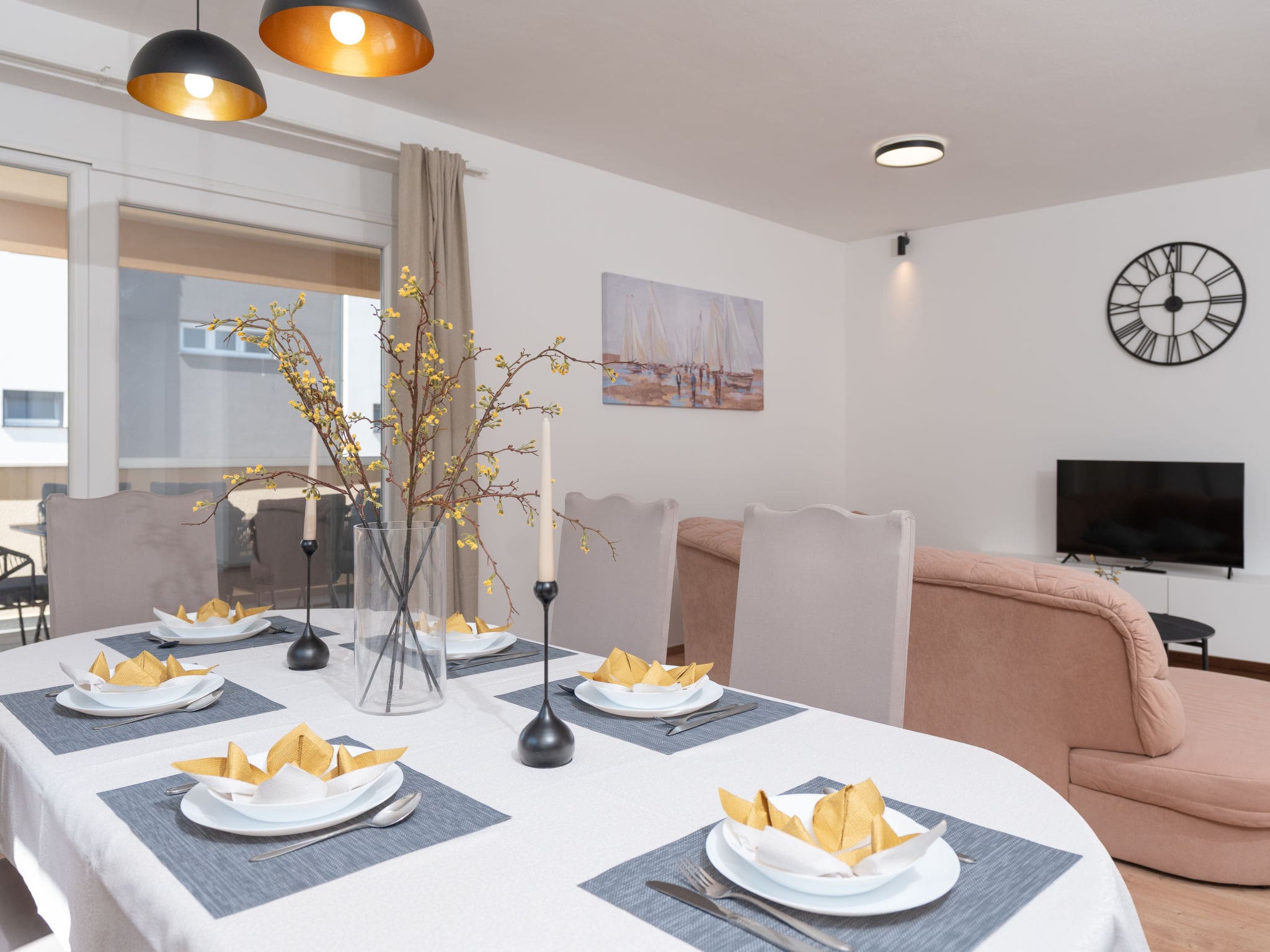 The fully equipped open kitchen caters to all culinary needs with professional-grade appliances including an oven, dishwasher, ceramic and gas cooking surfaces, microwave, and electric coffee machine. Modern amenities throughout include complimentary WiFi, a washing machine, safe, and hair dryer.