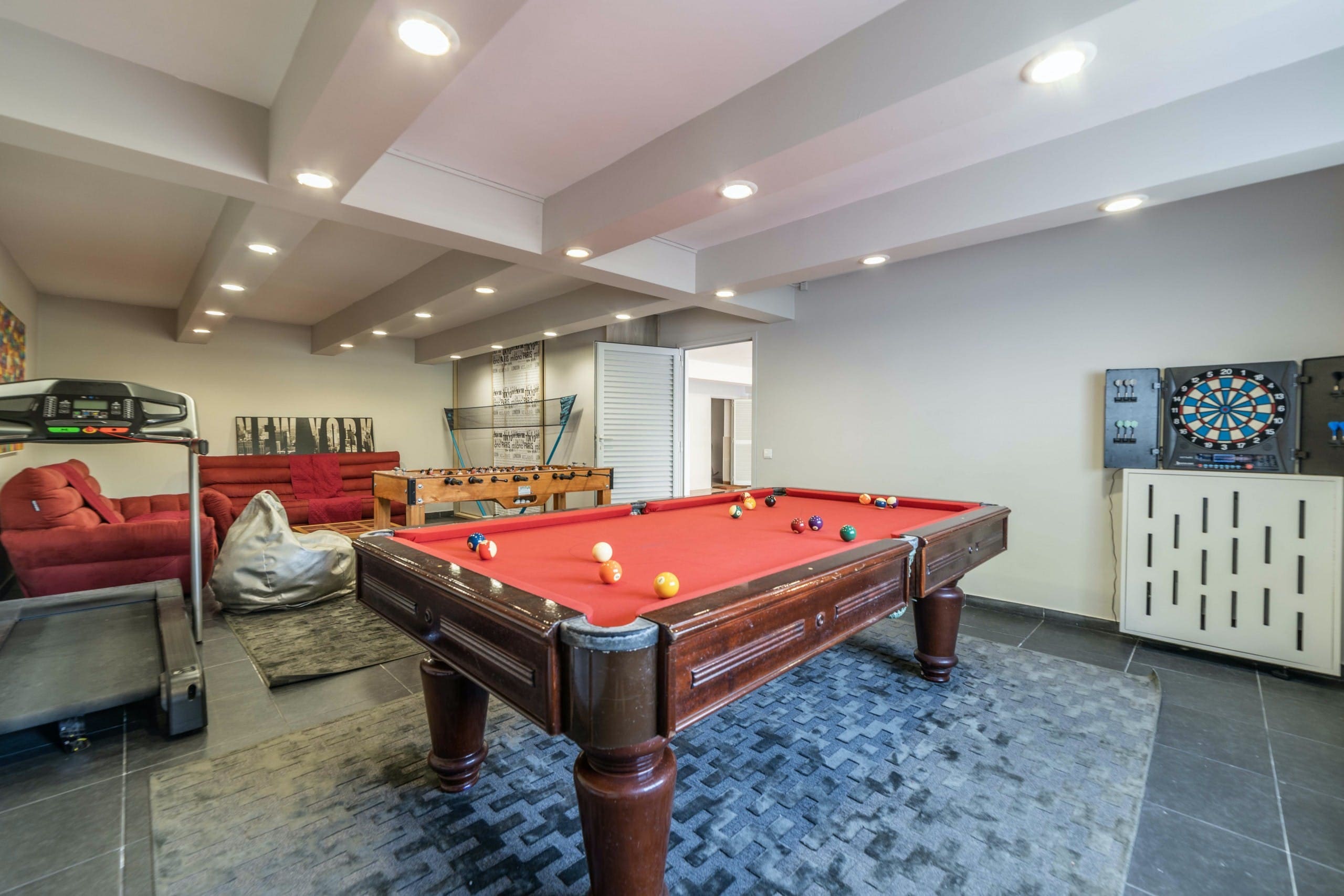 A: The villa features a delightful games area with a foosball table, perfect for family fun.