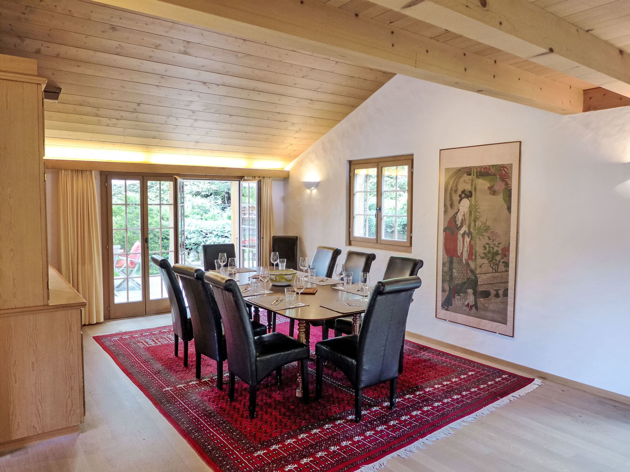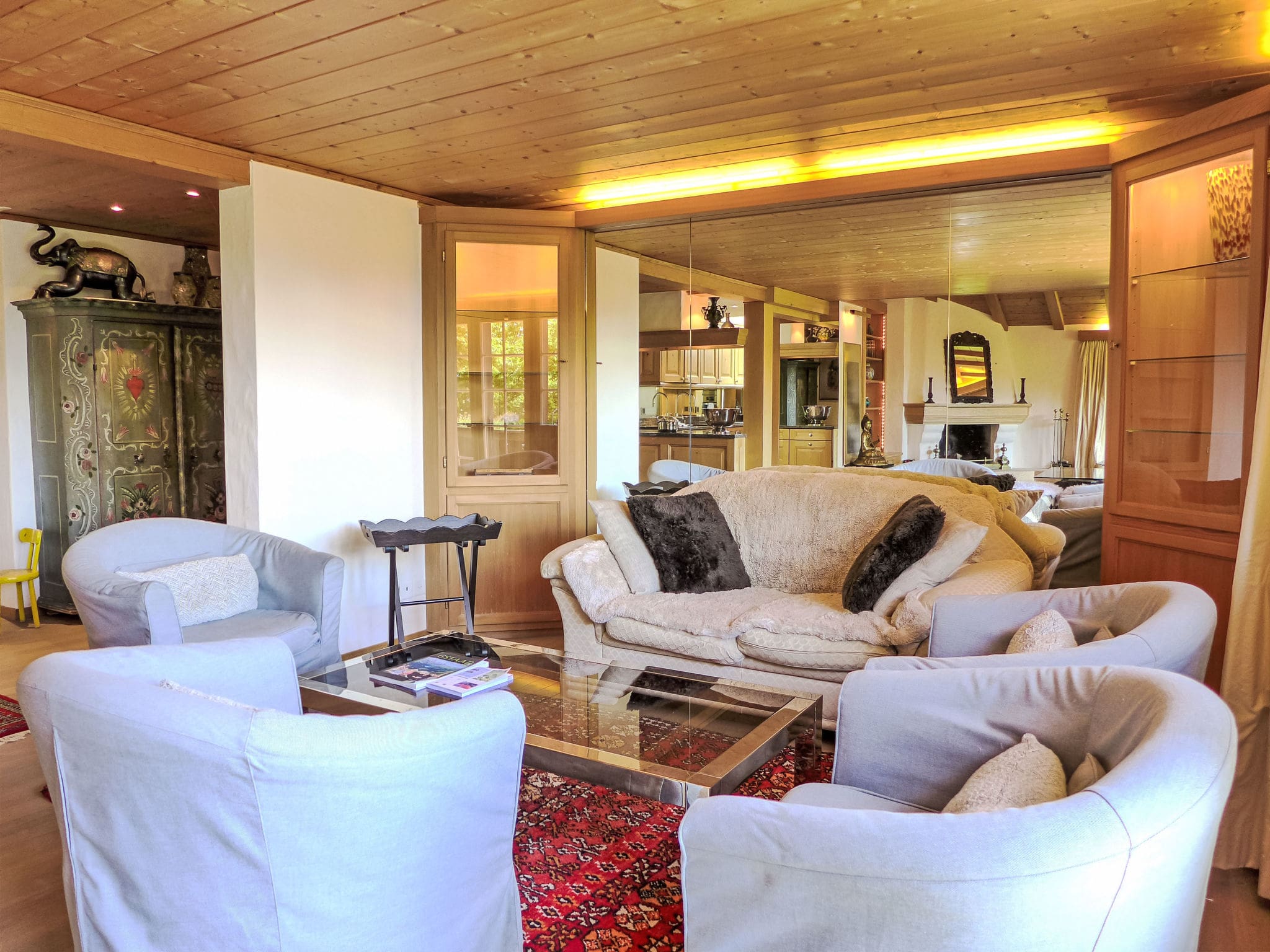 The property’s elevated position on a sunny slope provides extraordinary outdoor living opportunities throughout the seasons. A large, fenced garden offers both manicured lawns and natural wildlife areas, creating a private sanctuary surrounded by Alpine beauty. Multiple outdoor spaces include a generous terrace perfect for al fresco dining, a charming patio for intimate gatherings, and various seating areas strategically positioned to capture the magnificent mountain panoramas.