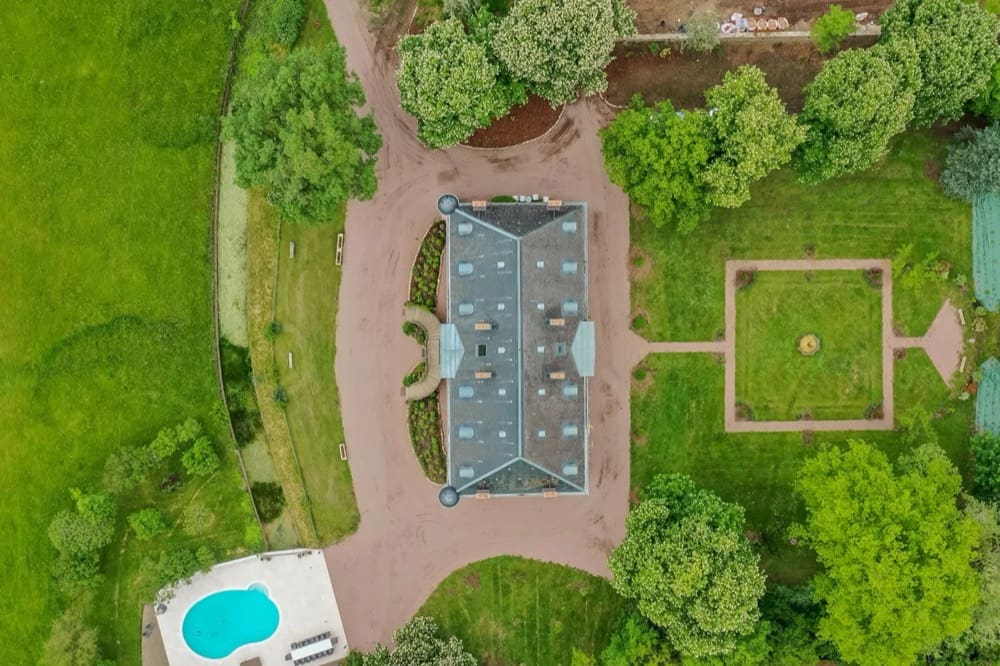 •Surrounded by vast private grounds with forests, a lake, and a private swimming pool