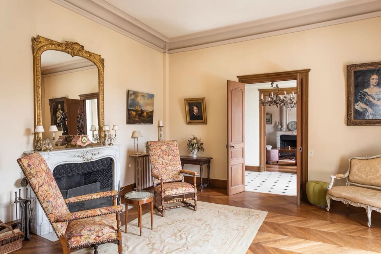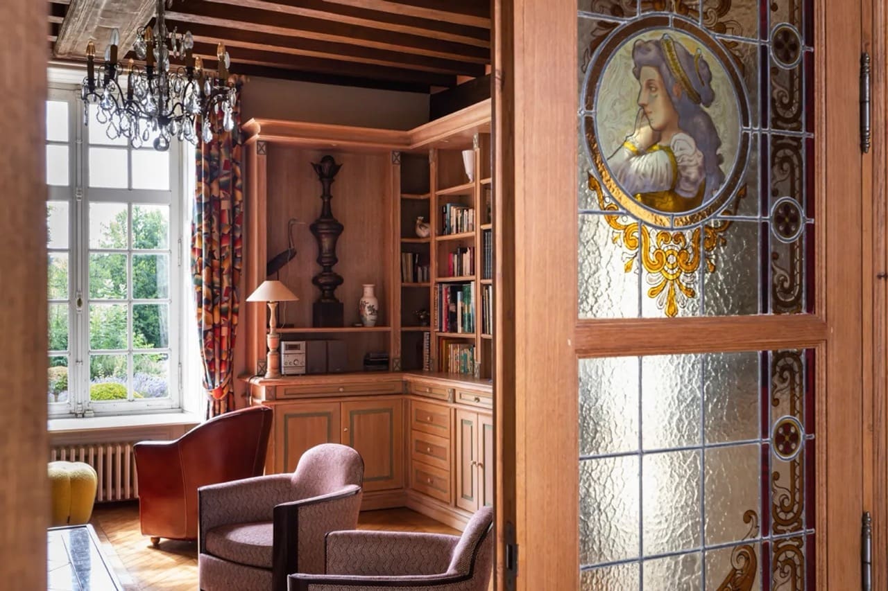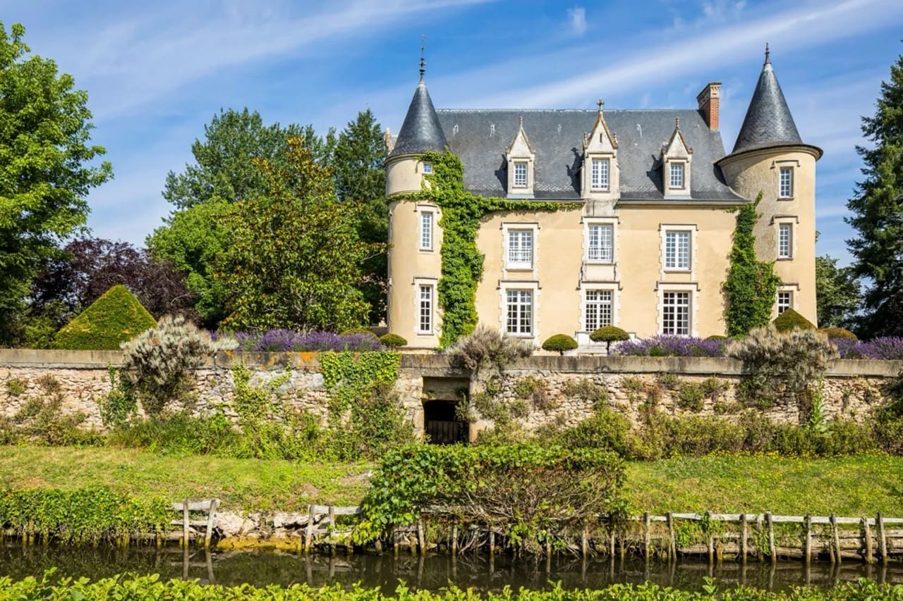 The castle is situated on 36 acres of secluded grounds in Sarthe, adjacent to Lombron, a small and enchanting village of just 1,800 inhabitants, near Le Mans in the Loire Valley. Chateau de La Manay includes beautiful tree-lined paths, apple and pear orchards and a one and a half-acre lake. The chateau is even surrounded by a moat. Pastoral views of the moat and pond can be enjoyed from the dining terrace that overlooks the grounds. The lake teems with fish the whole year round and hosts an interesting variety of birds and fowl. The grounds also include well-kept boulevards and paths bordered by weeping trees and an extensive orchard. Walks on the property cross grassy fields and wooded areas, and join other well-marked lanes and trails in the surrounding countryside.