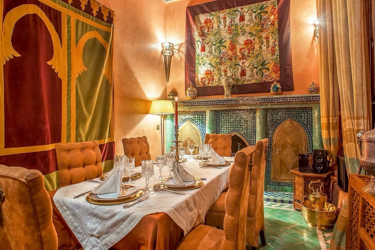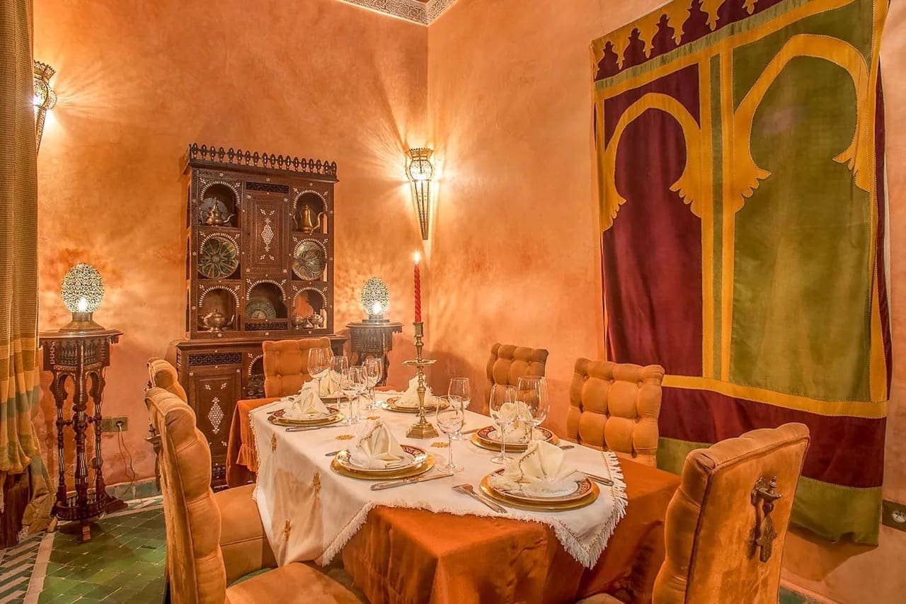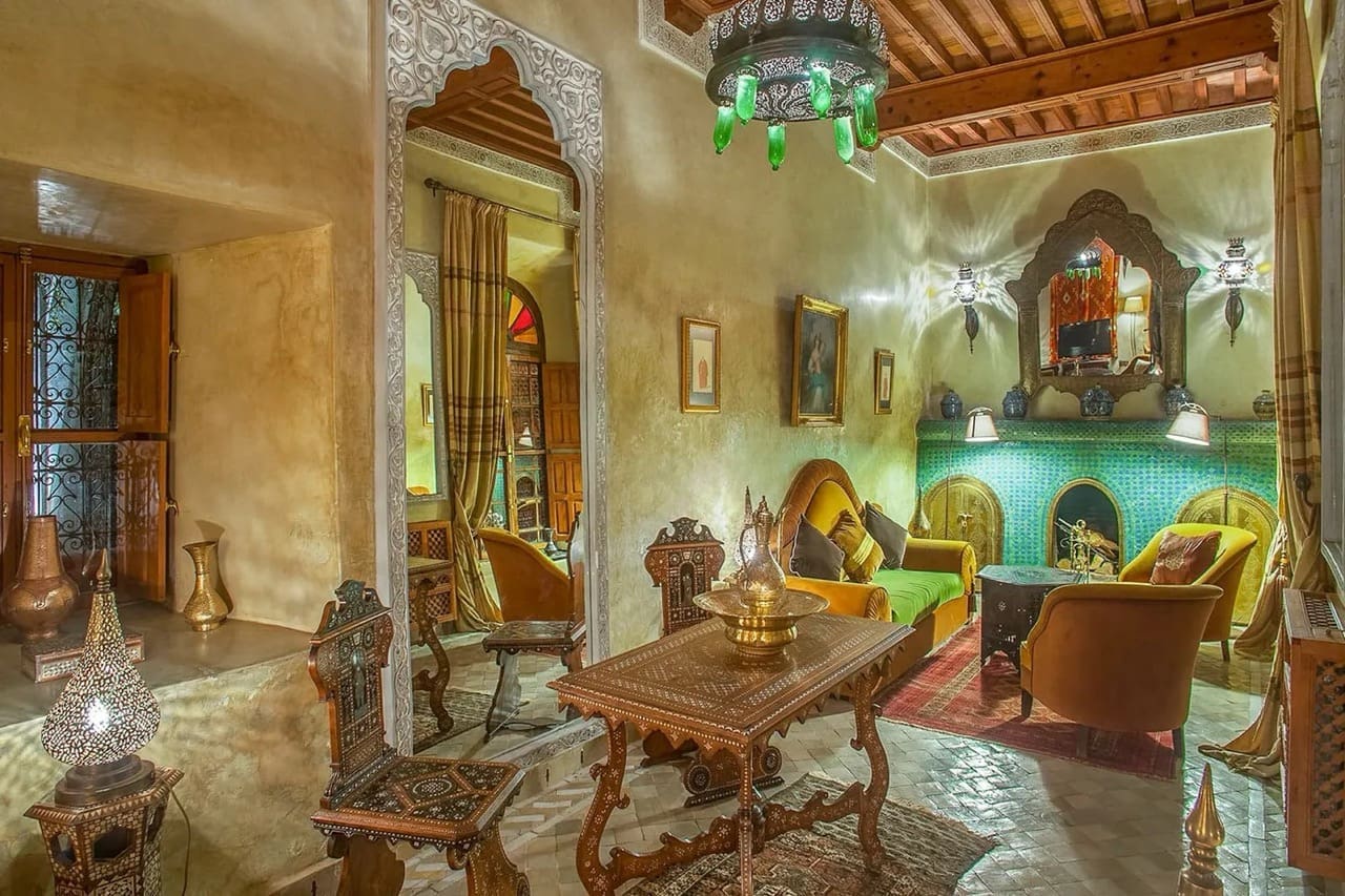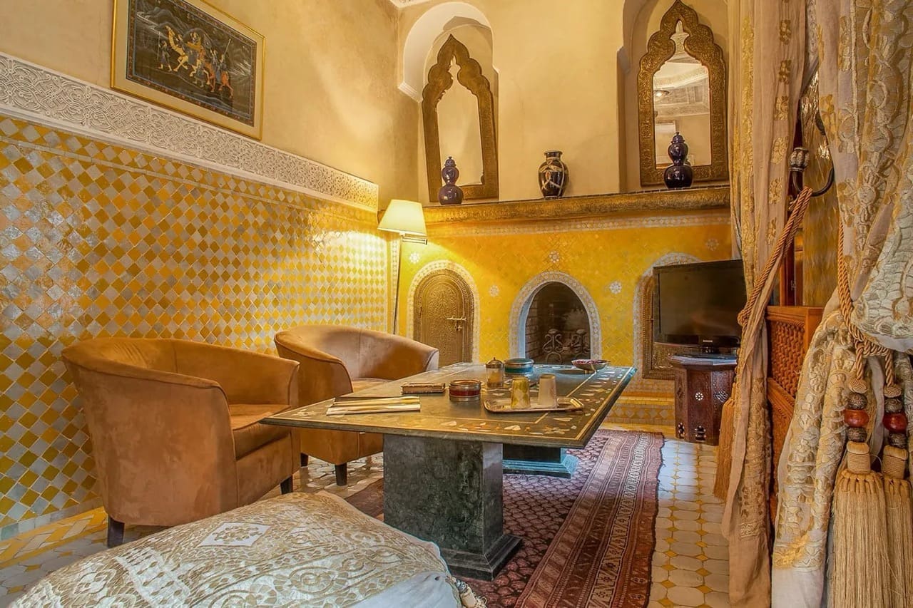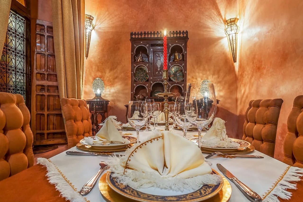 A haven of indulgence awaits beyond the graceful interiors. The private heated pool sits in a sheltered garden that feels worlds away from the lively Medina streets, offering a tranquil escape after wandering the souks. The traditional hammam invites guests to unwind with rituals that have soothed travellers for centuries. The in house chef prepares refined Moroccan and international dishes for unforgettable dining experiences, whether beneath lantern lit stars on the panoramic rooftop terrace or beside the fireplace in the intimate dining salon.