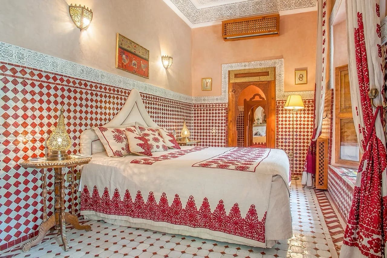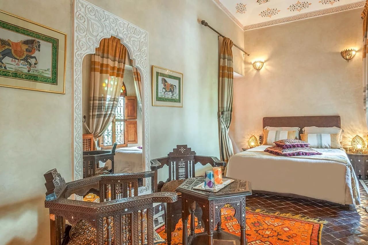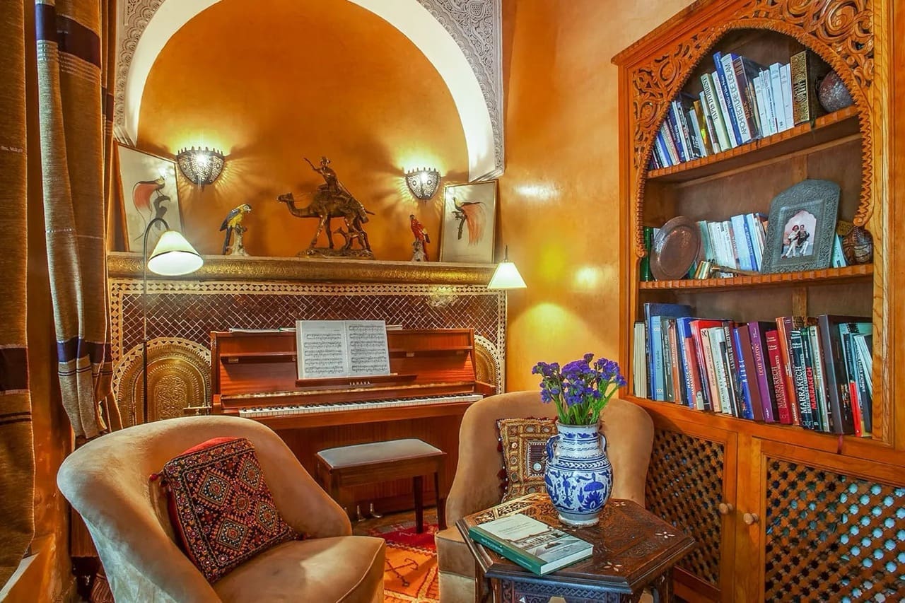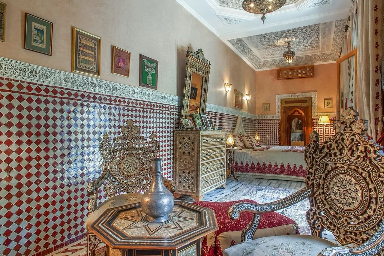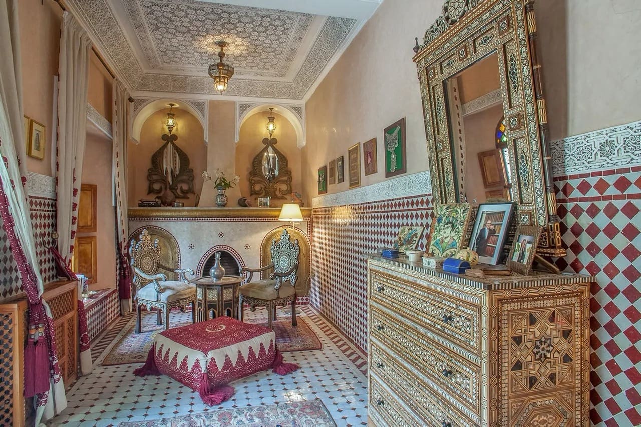 A haven of indulgence awaits beyond the graceful interiors. The private heated pool sits in a sheltered garden that feels worlds away from the lively Medina streets, offering a tranquil escape after wandering the souks. The traditional hammam invites guests to unwind with rituals that have soothed travellers for centuries. The in house chef prepares refined Moroccan and international dishes for unforgettable dining experiences, whether beneath lantern lit stars on the panoramic rooftop terrace or beside the fireplace in the intimate dining salon.