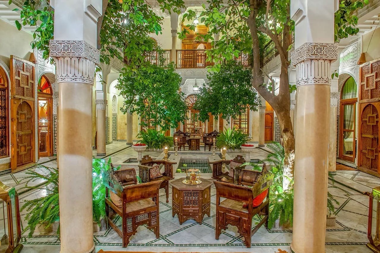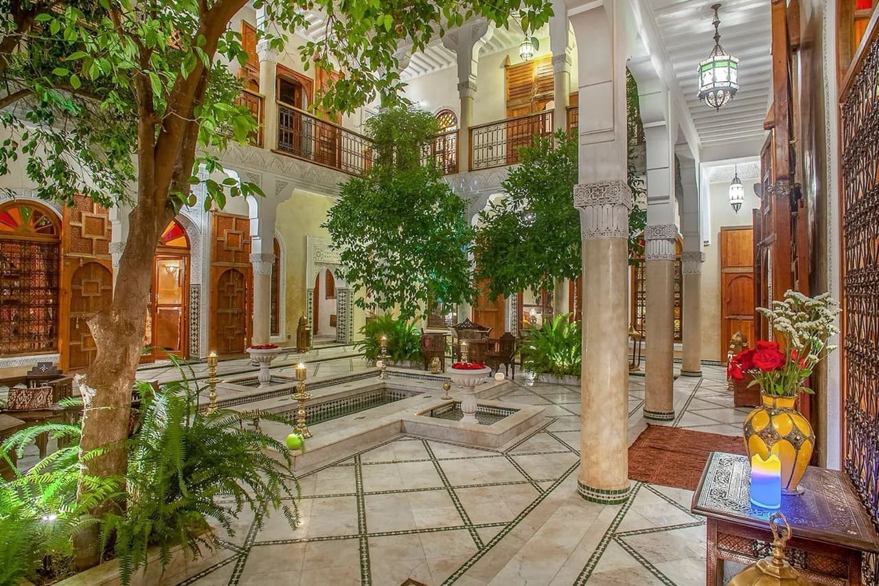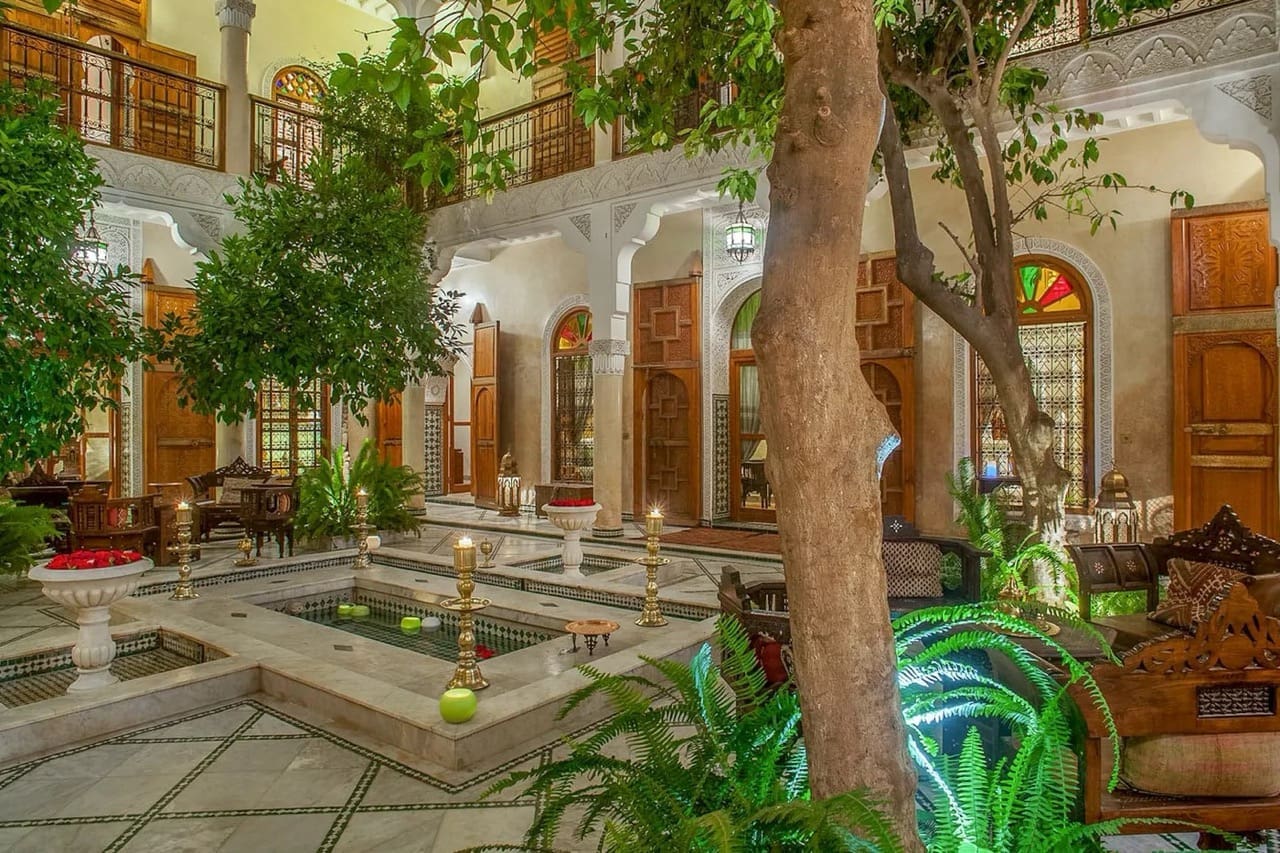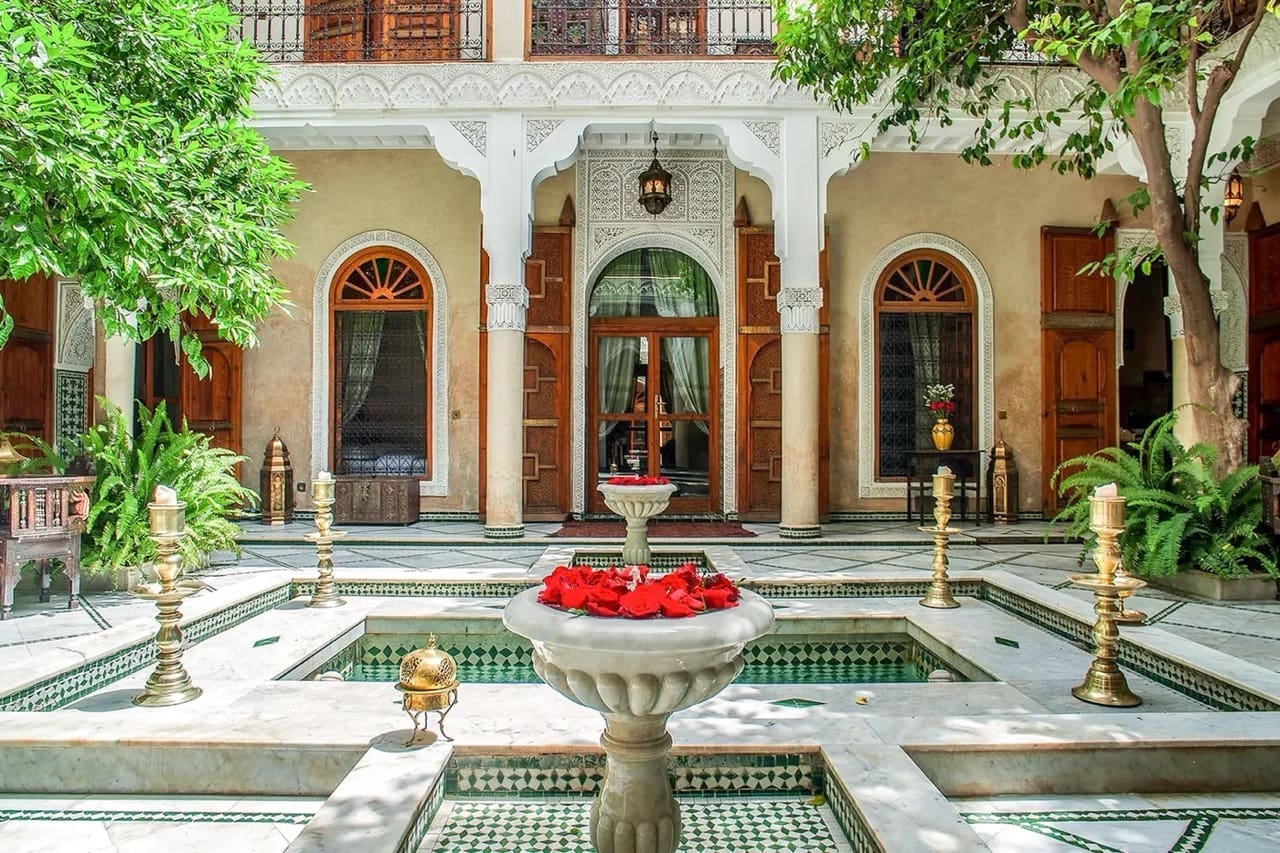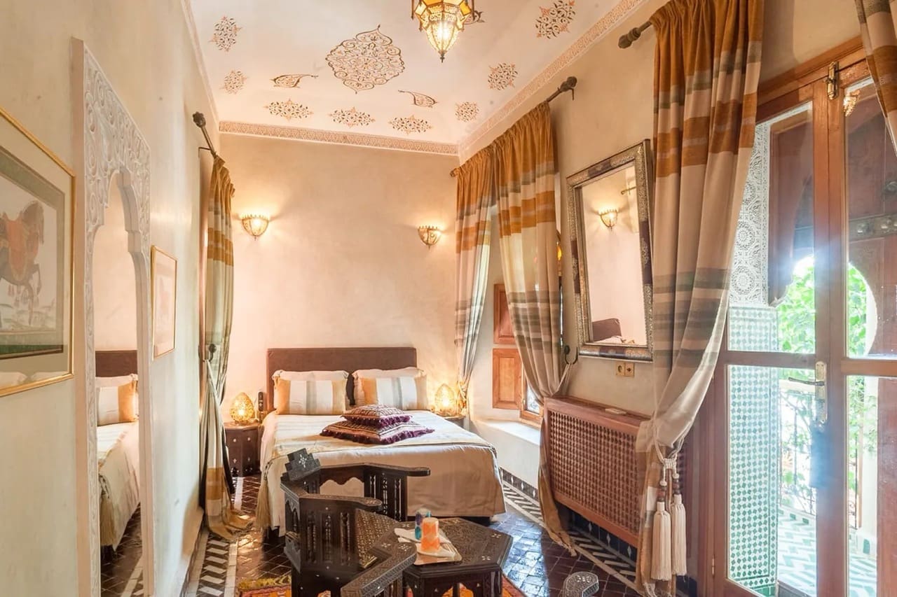 A haven of indulgence awaits beyond the graceful interiors. The private heated pool sits in a sheltered garden that feels worlds away from the lively Medina streets, offering a tranquil escape after wandering the souks. The traditional hammam invites guests to unwind with rituals that have soothed travellers for centuries. The in house chef prepares refined Moroccan and international dishes for unforgettable dining experiences, whether beneath lantern lit stars on the panoramic rooftop terrace or beside the fireplace in the intimate dining salon.