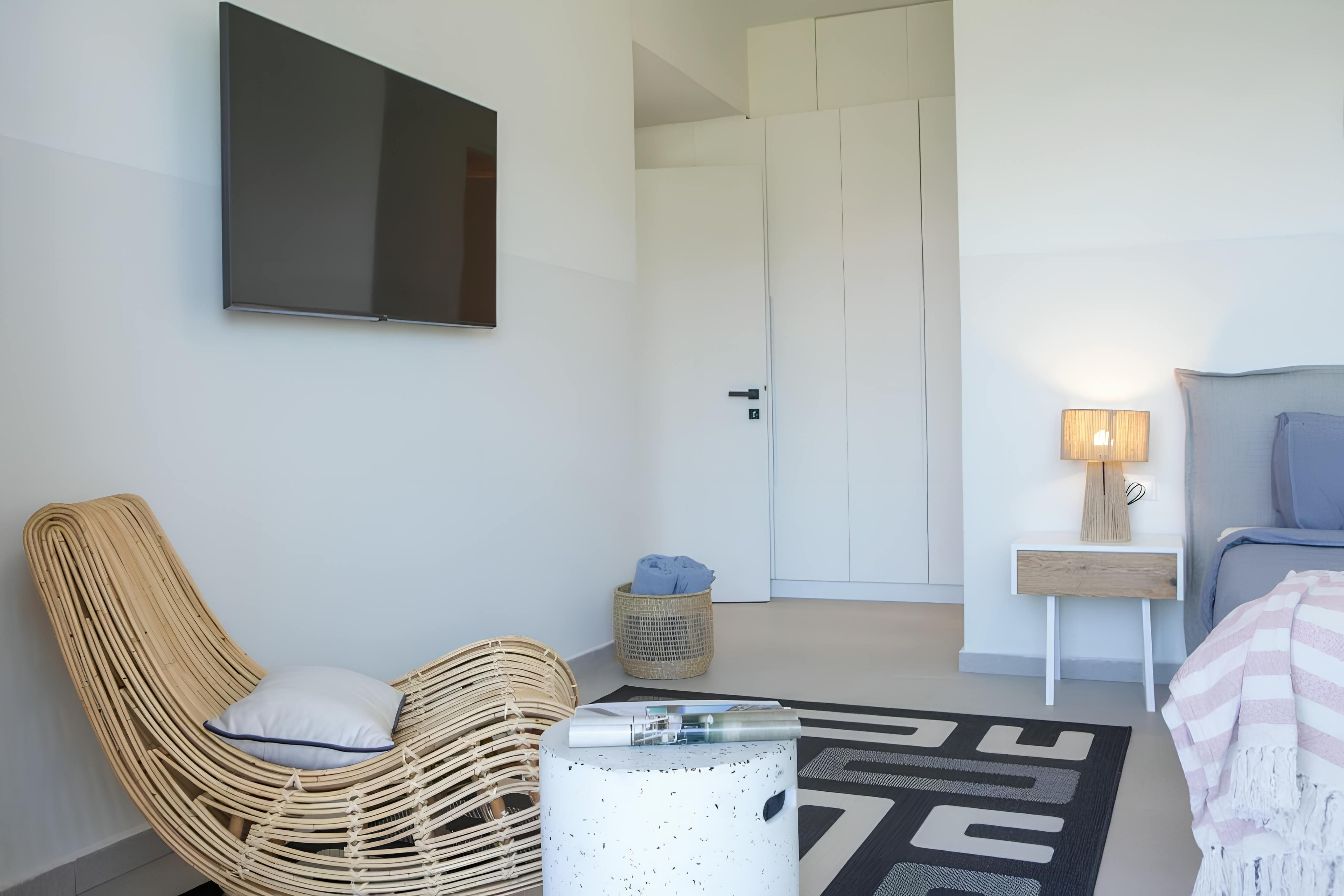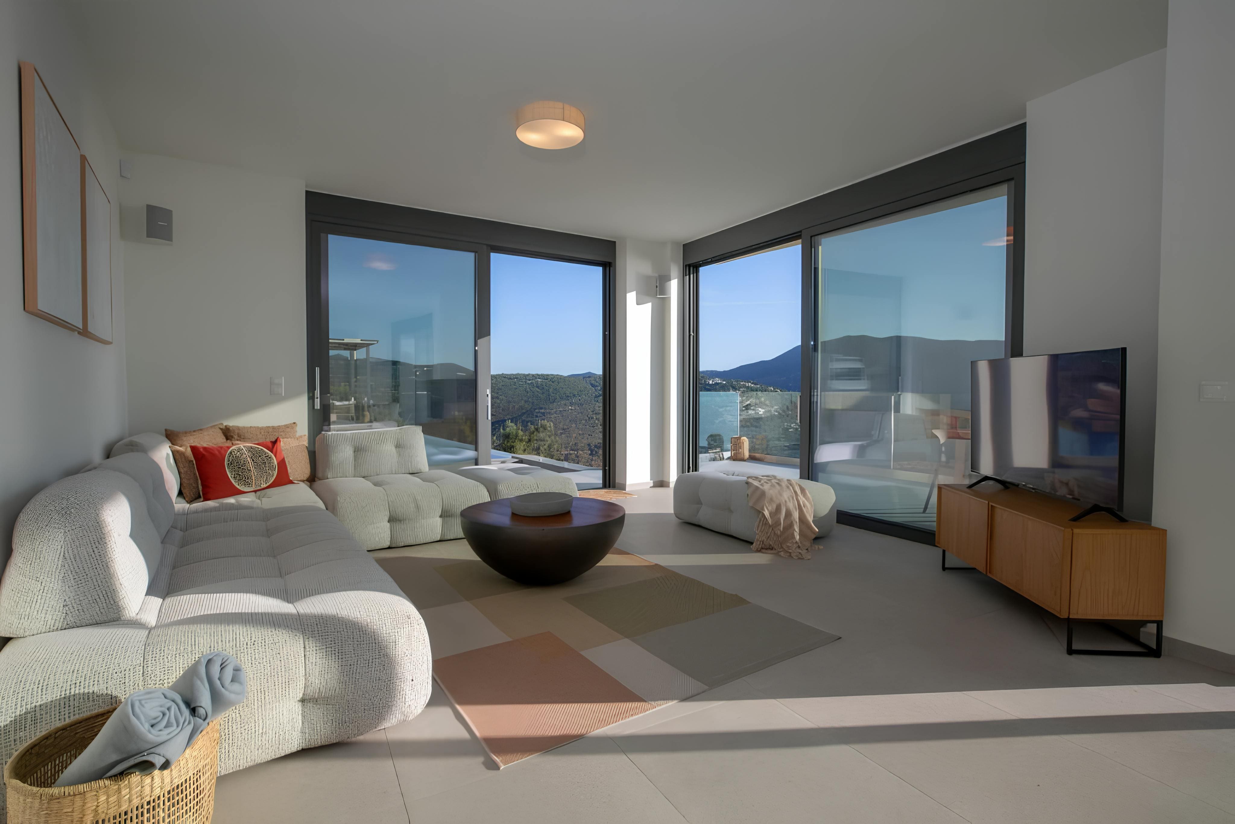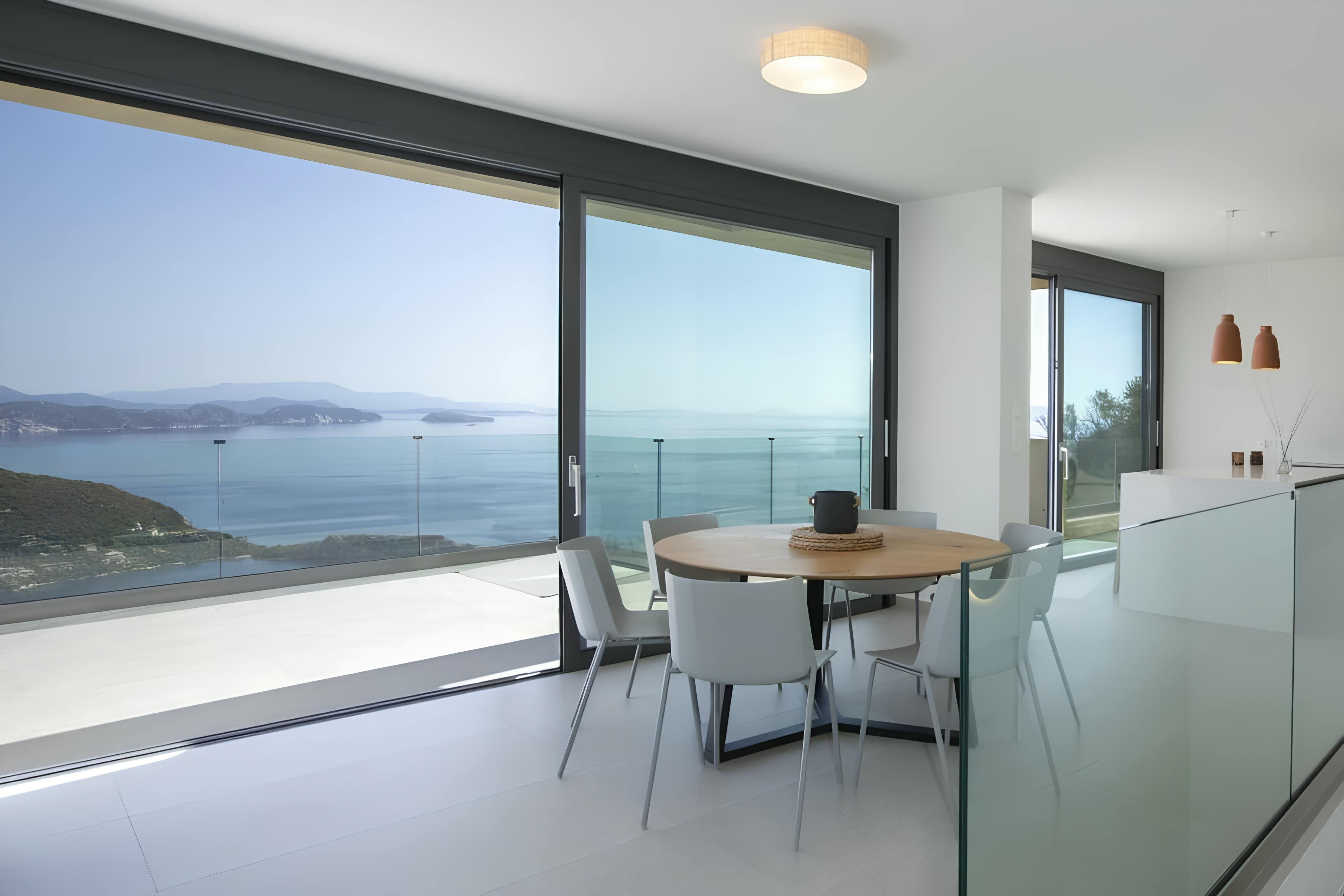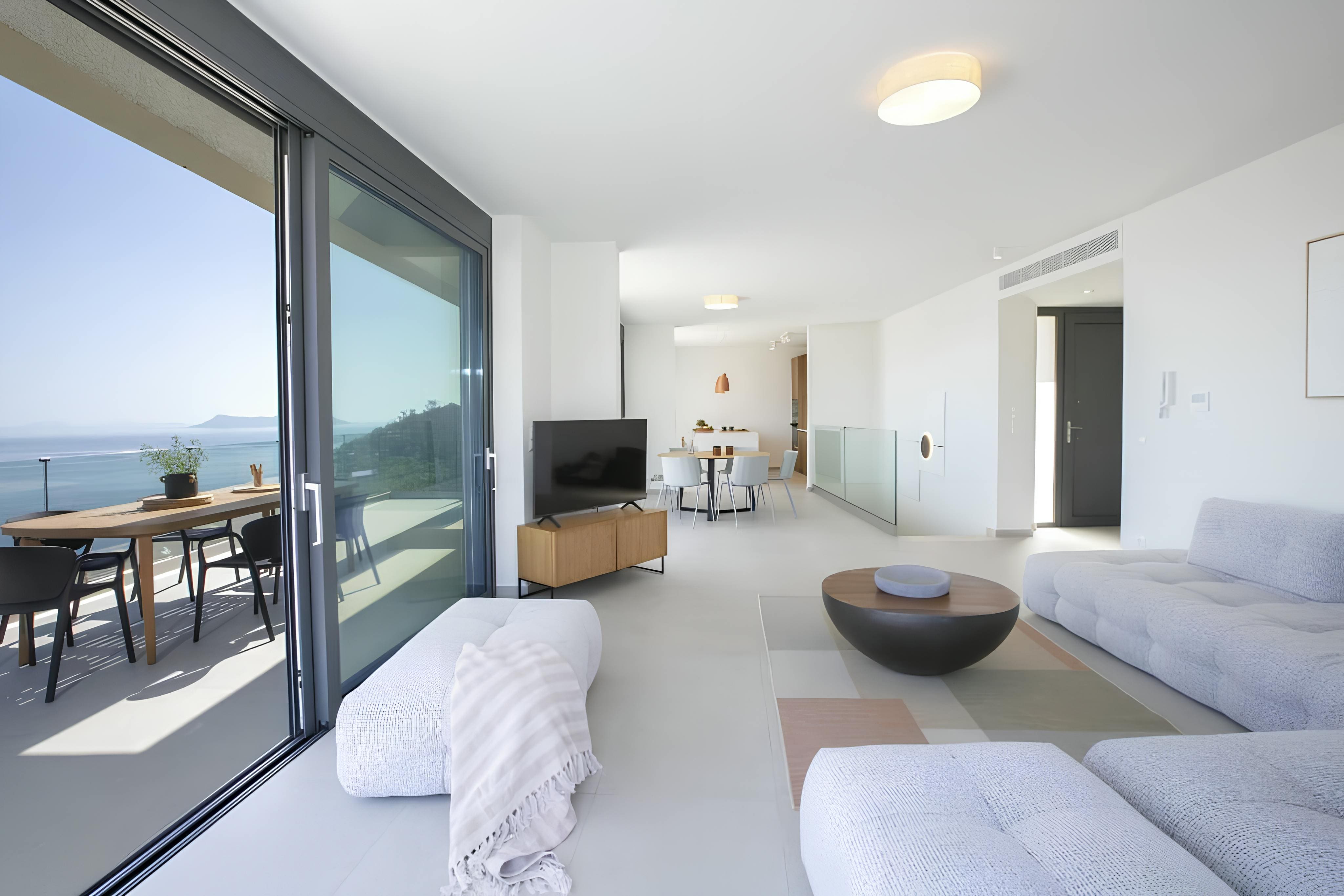 The interior of Villa Niriá Lefkada is thoughtfully appointed with bright, airy rooms that reflect the tranquil coastal surroundings. Three bedrooms accommodate up to six guests, including a twin-bedded third room ideal for friends or children. Each bedroom opens onto outdoor spaces with stunning sea vistas, creating a serene atmosphere for restful mornings. The open-plan living area features modern furnishings in soft neutral tones and large windows that frame the sparkling Ionian Sea. A fully equipped kitchen invites leisurely cooking, while the three bathrooms provide ample convenience and privacy for all guests.