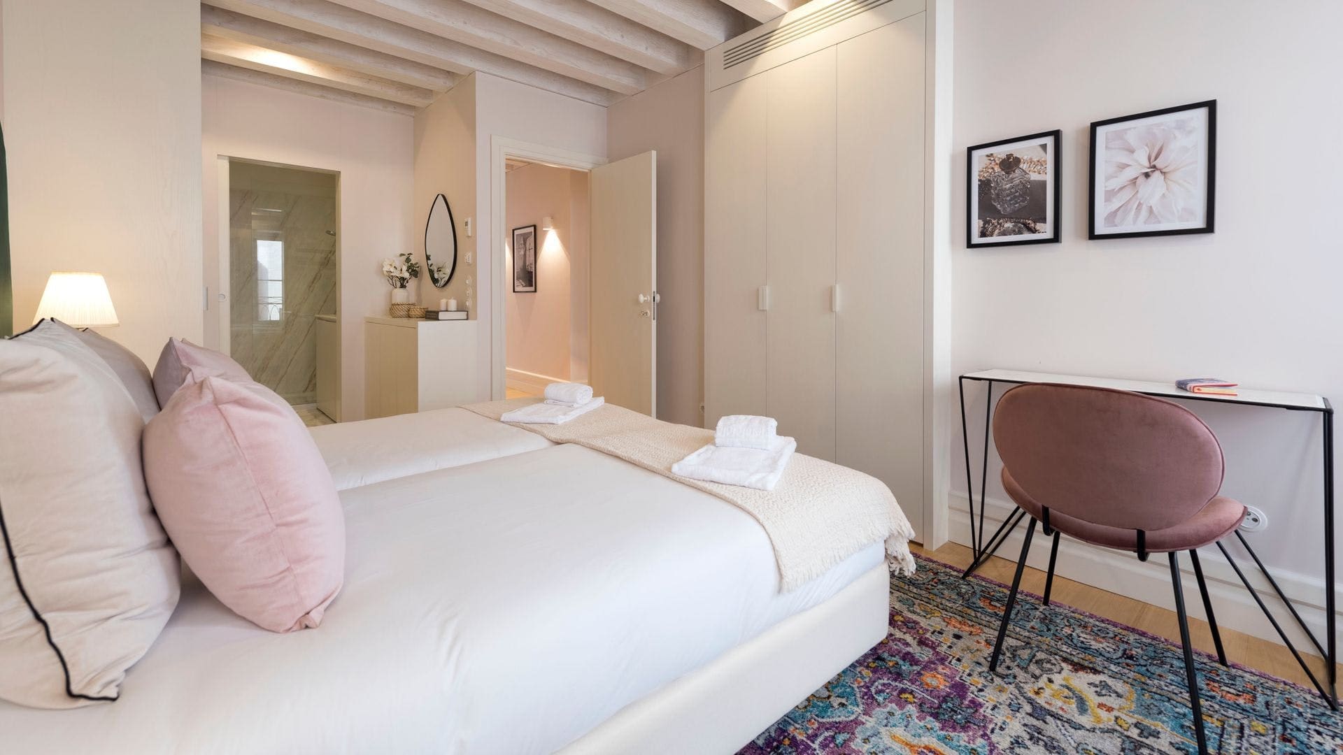 Step inside to find an inviting open-plan living space that seamlessly blends functionality with sophistication. The well-appointed kitchen features a convenient serving hatch, making entertaining a breeze. Each bedroom is uniquely decorated, offering a cozy haven to unwind after a day of exploring. The apartment also includes a dedicated workspace for those needing to catch up on business, ensuring you can balance work and leisure effortlessly.
