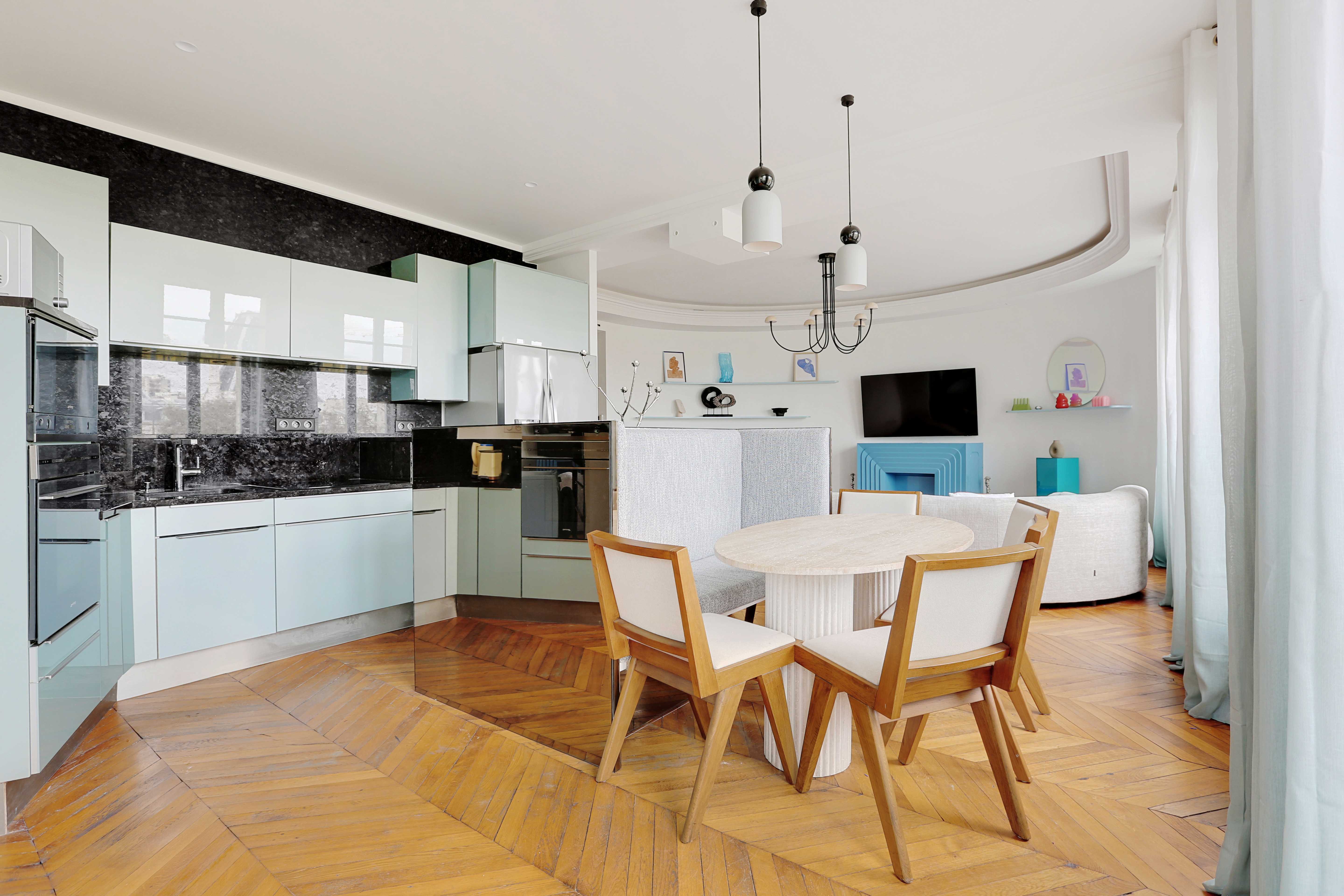 This spacious three-bedroom apartment is designed for comfort and style, accommodating up to six guests. The living area features chic furnishings, large windows that fill the space with natural light, and a warm ambiance that invites relaxation after a day of exploring the city. The open-plan kitchen is fully equipped, making it easy to prepare meals with local ingredients. Each bedroom is thoughtfully decorated, offering a peaceful retreat, while the two bathrooms provide ample space for guests. Notably, the toilet is separate from the bathrooms, adhering to the traditional layout common in France.