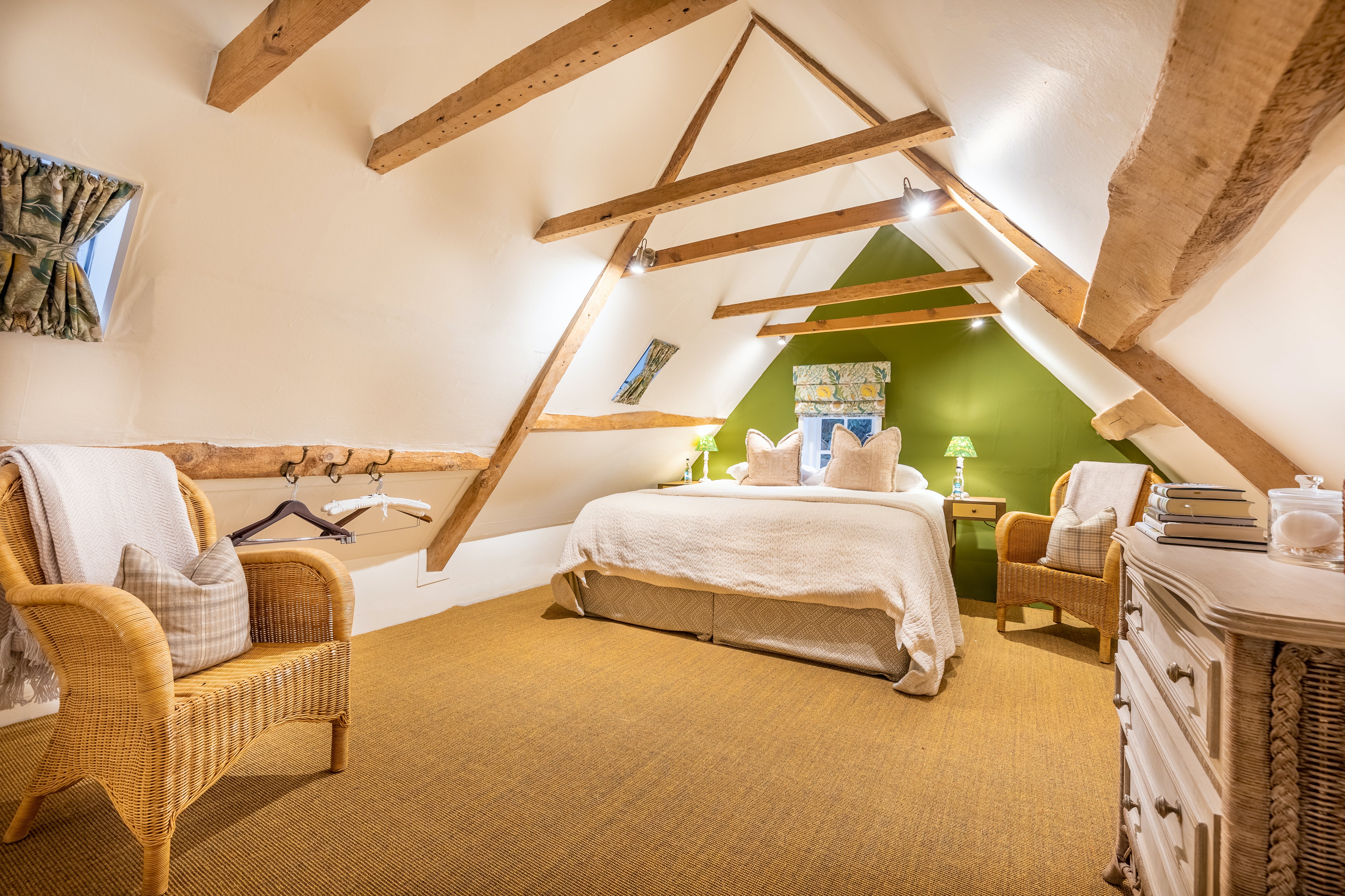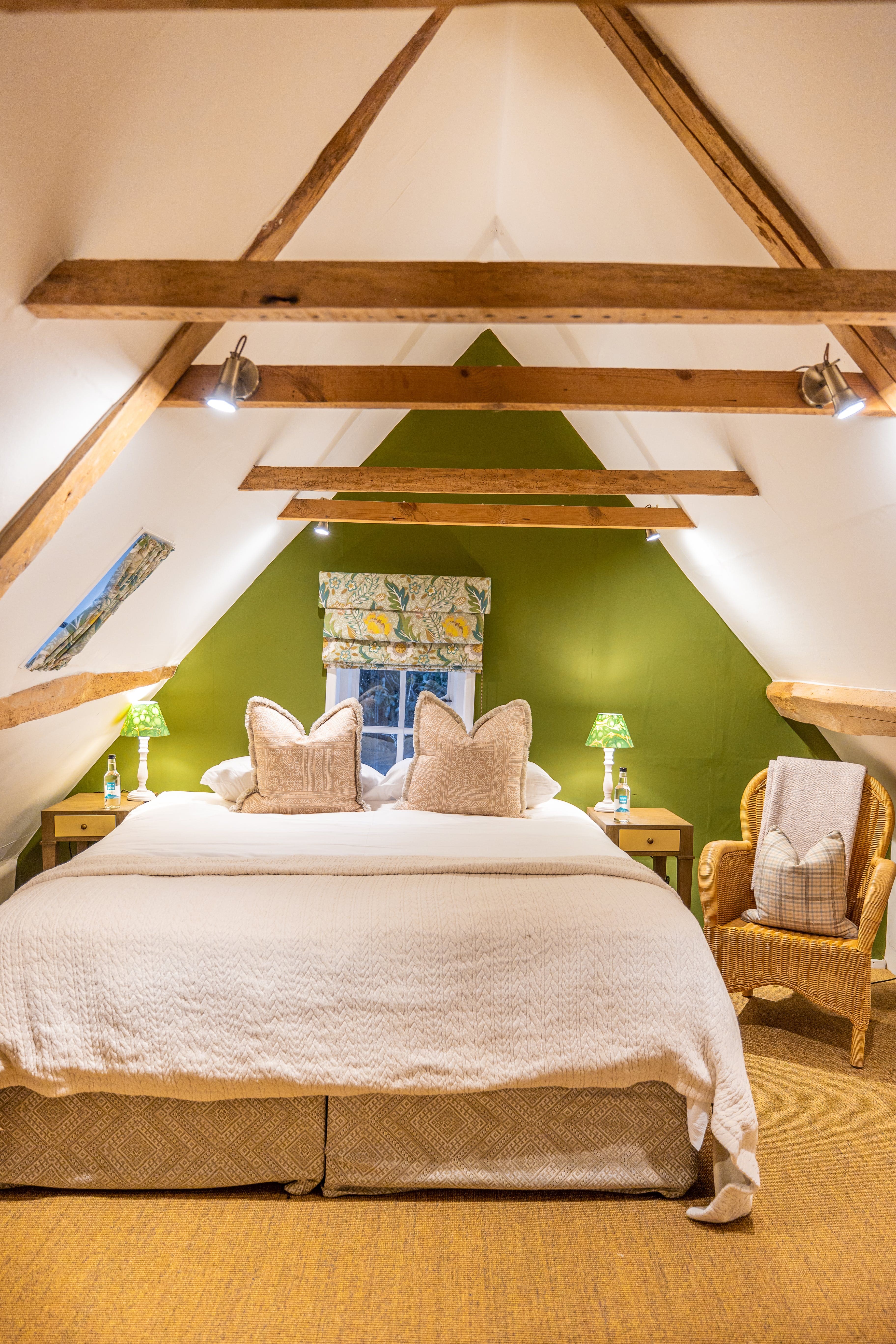 A: The third bedroom features beautiful exposed beams, vaulted ceilings, and twin double beds, creating an enchanting space that children particularly love while providing practical sleeping arrangements for families.