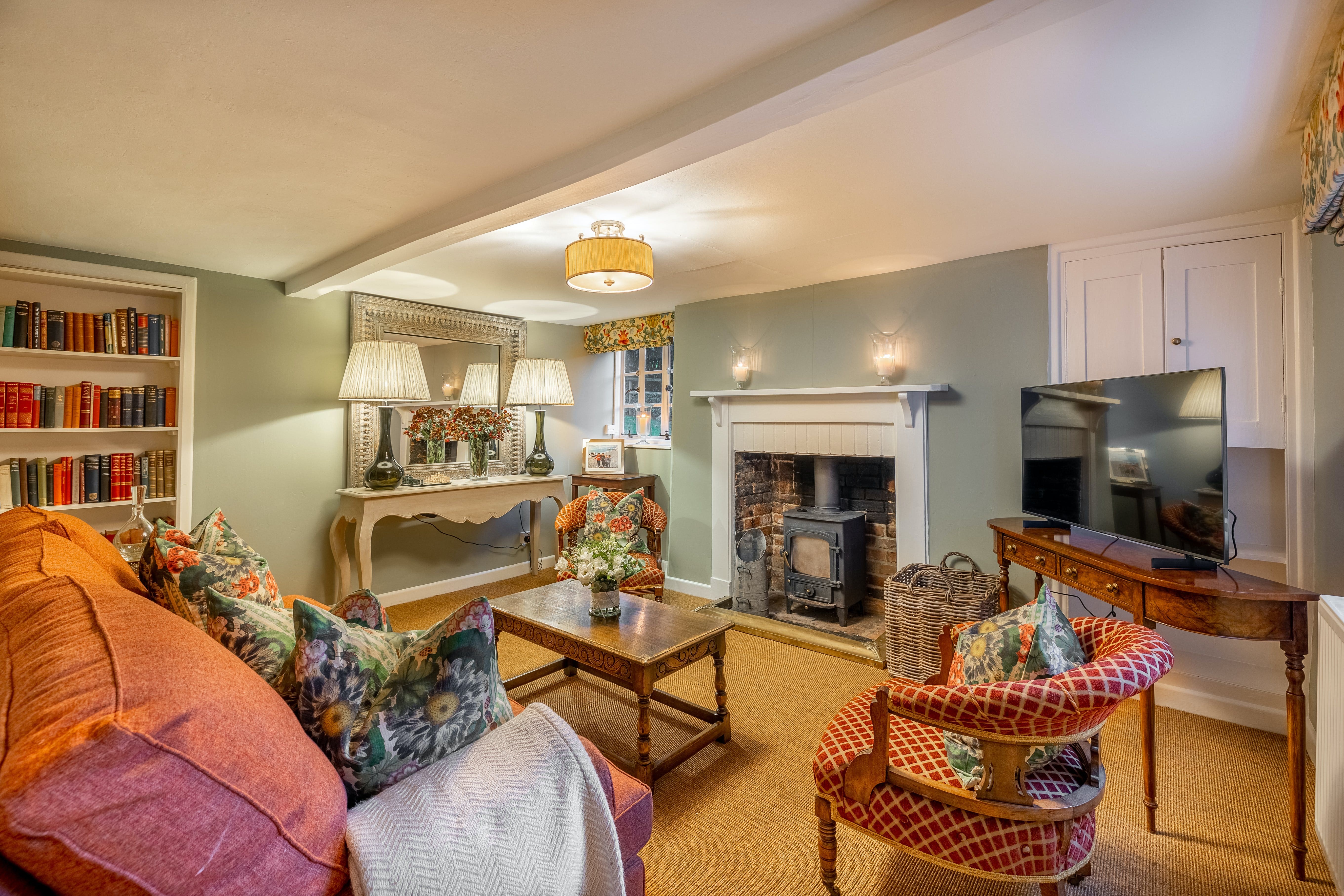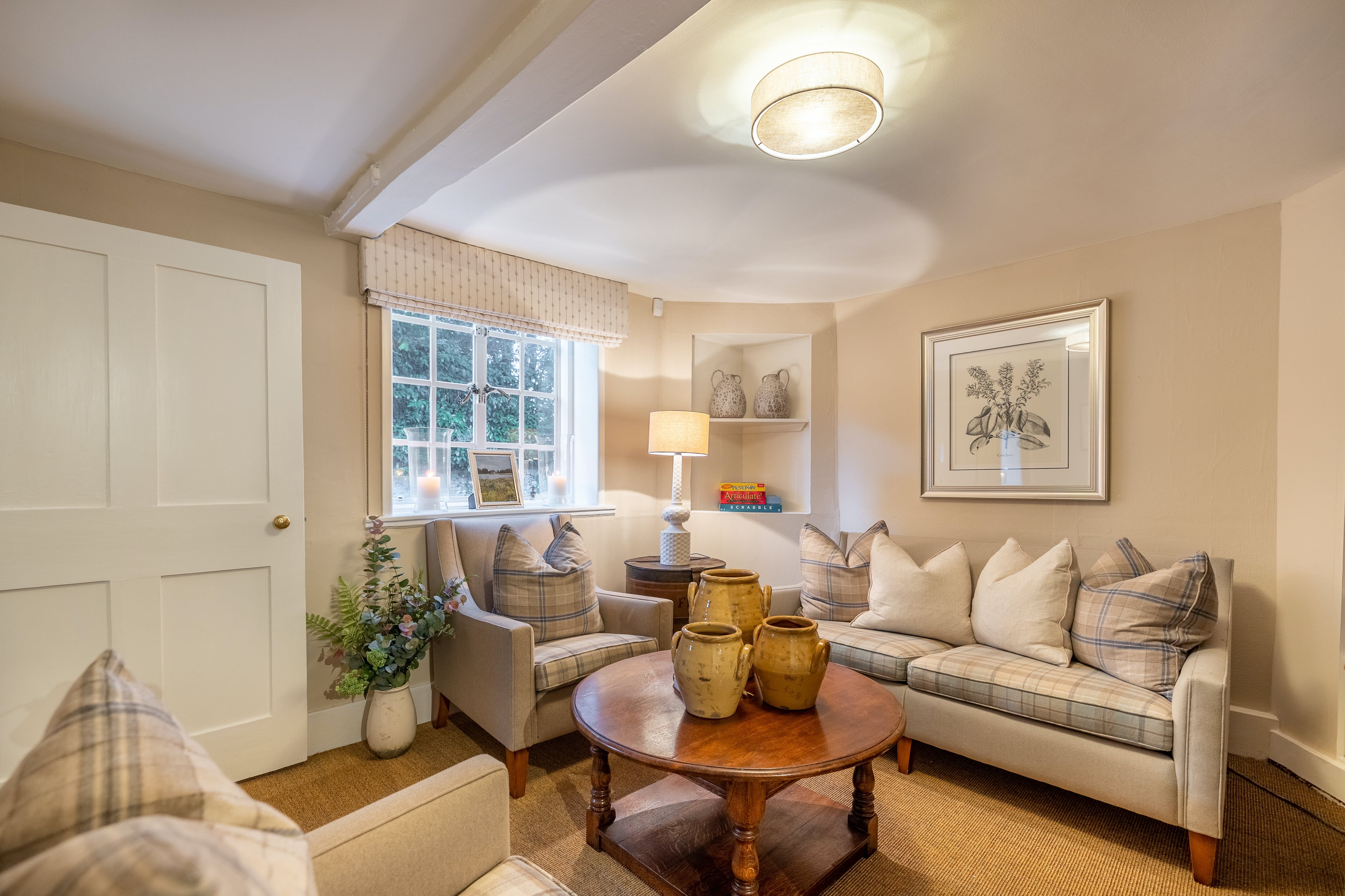 The interior spaces showcase thoughtful design across two levels, featuring a cosy sitting room with warming wood-burner and comfortable seating ideal for evening relaxation. A separate drawing room provides additional space for family gatherings and entertainment, while the well-equipped rustic kitchen contains everything needed for preparing memorable meals to share around the dining table. The three beautifully appointed bedrooms each promise restful nights, with the standout third bedroom featuring exposed timber beams, vaulted ceilings, and twin double beds perfect for families with children.