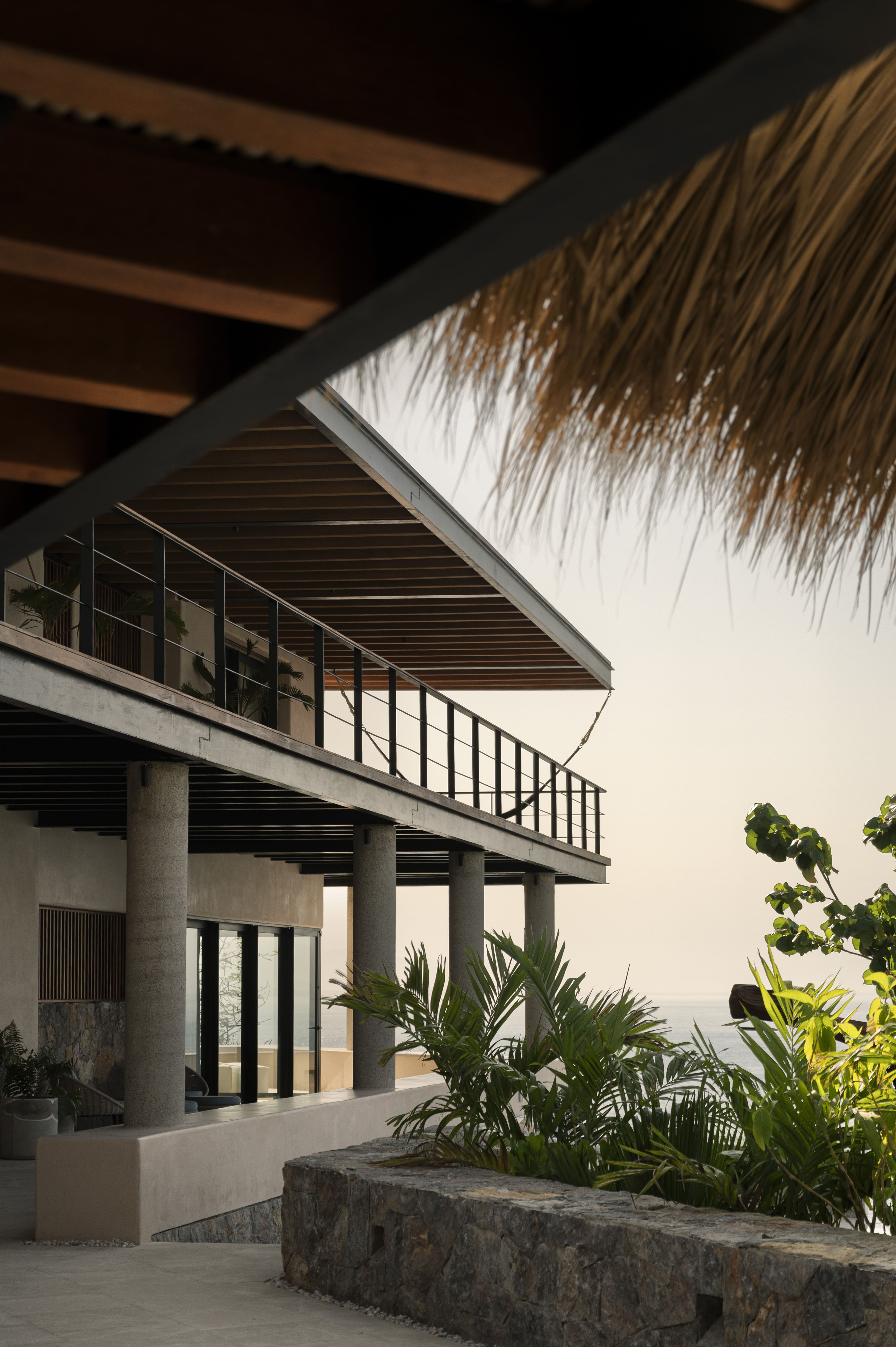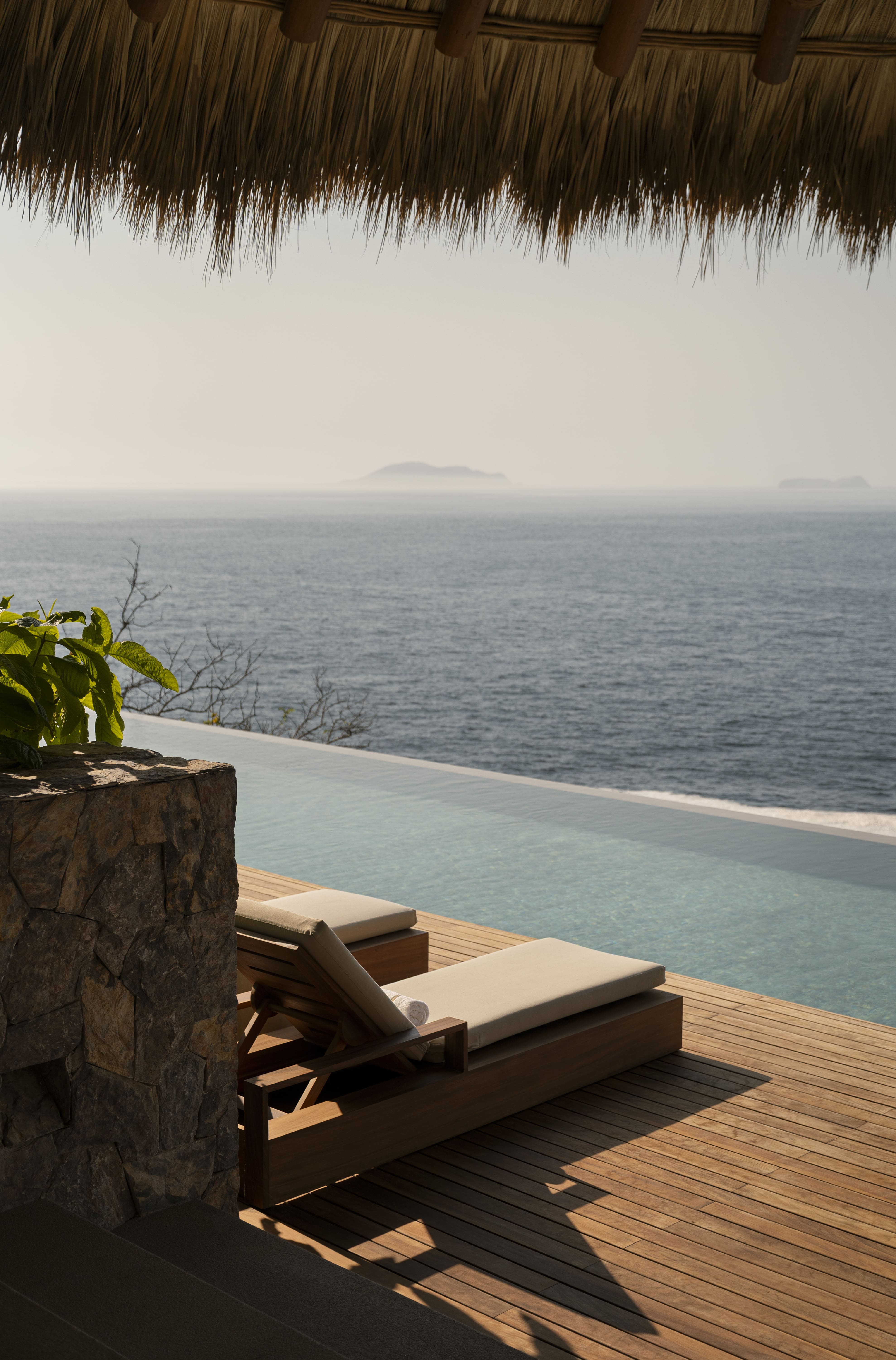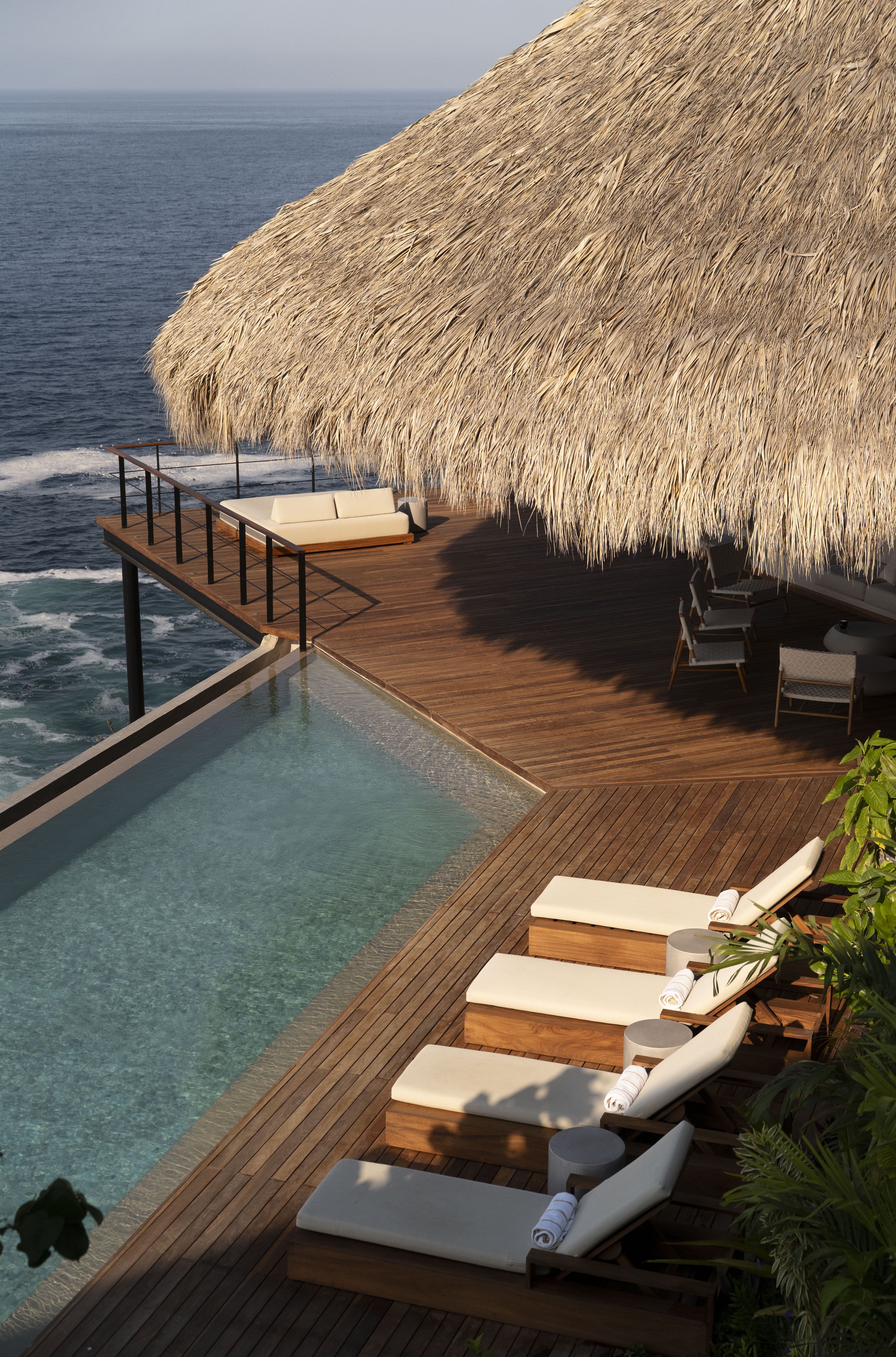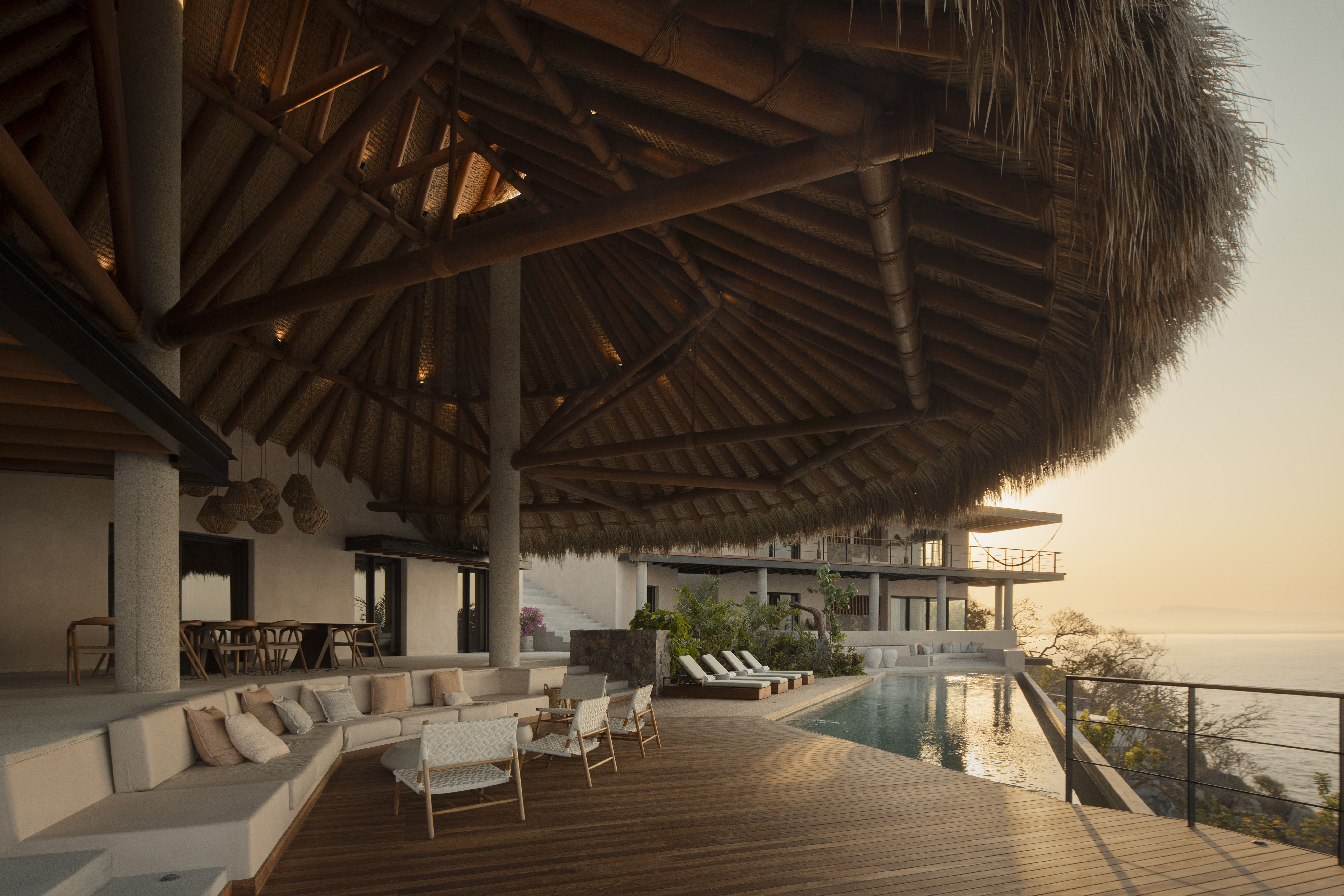 Two stunning infinity pools cascade toward the horizon, creating the illusion of swimming directly into the Pacific Ocean. Multiple terraces offer distinct settings for relaxation, from the peaceful hammock area to the sophisticated cocktail terrace where sunset views unfold nightly. The property’s clifftop position provides uninterrupted panoramas across Zihuatanejo Bay, while outdoor dining areas and lounging spaces take full advantage of the year-round tropical climate.