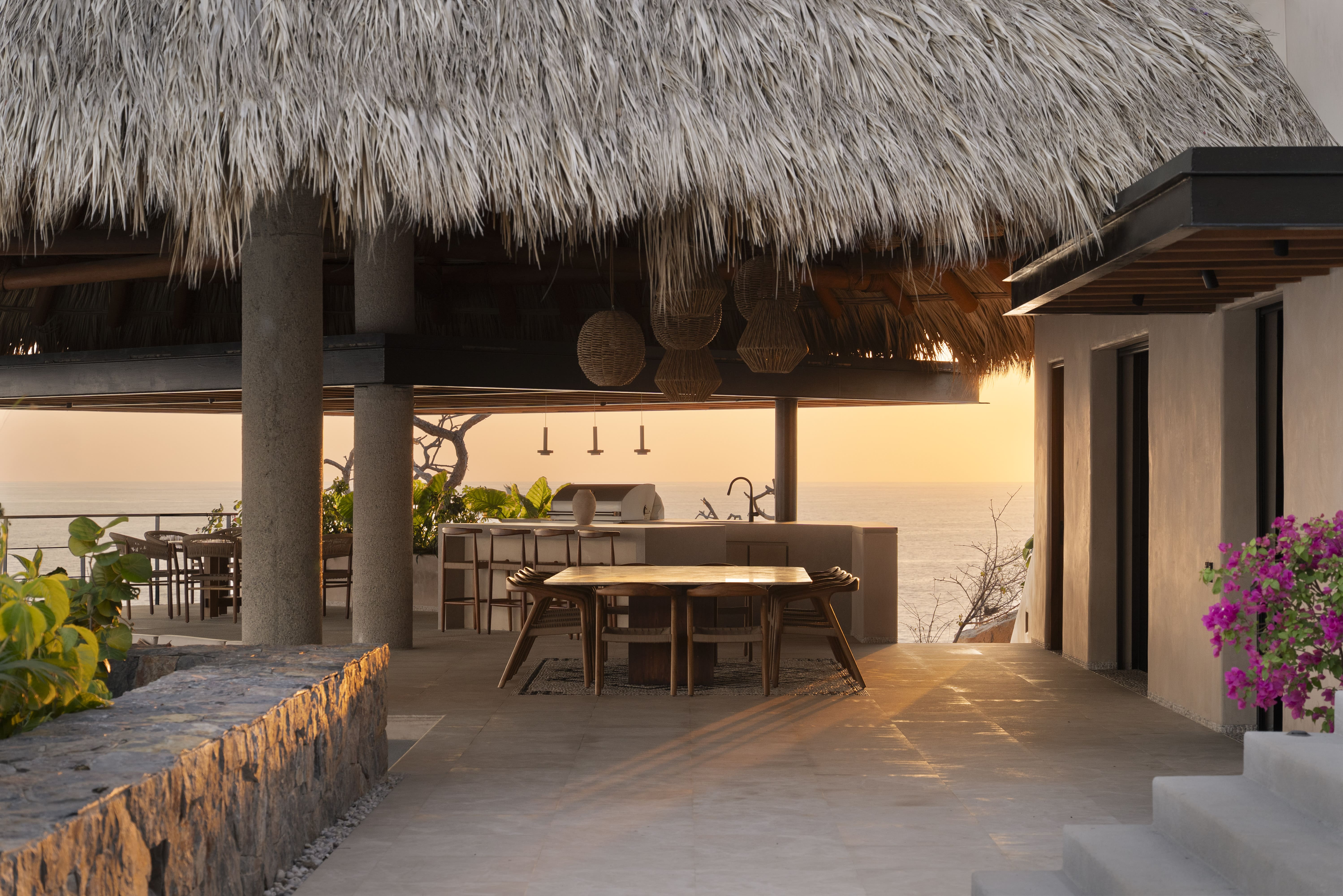 The interior spaces showcase contemporary Mexican design with soaring ceilings and floor-to-ceiling windows that frame endless ocean vistas. Six thoughtfully appointed bedrooms include five master suites with private bathrooms, while the sixth bedroom features a unique family configuration with two double beds and two sets of bunk beds, perfect for children or close-knit groups. The open-plan living areas flow seamlessly between indoor and outdoor spaces, with a gourmet kitchen equipped for your private chef and elegant dining areas that accommodate intimate meals or grand celebrations. Rich textures, natural materials, and carefully curated artwork create an atmosphere of refined sophistication throughout.