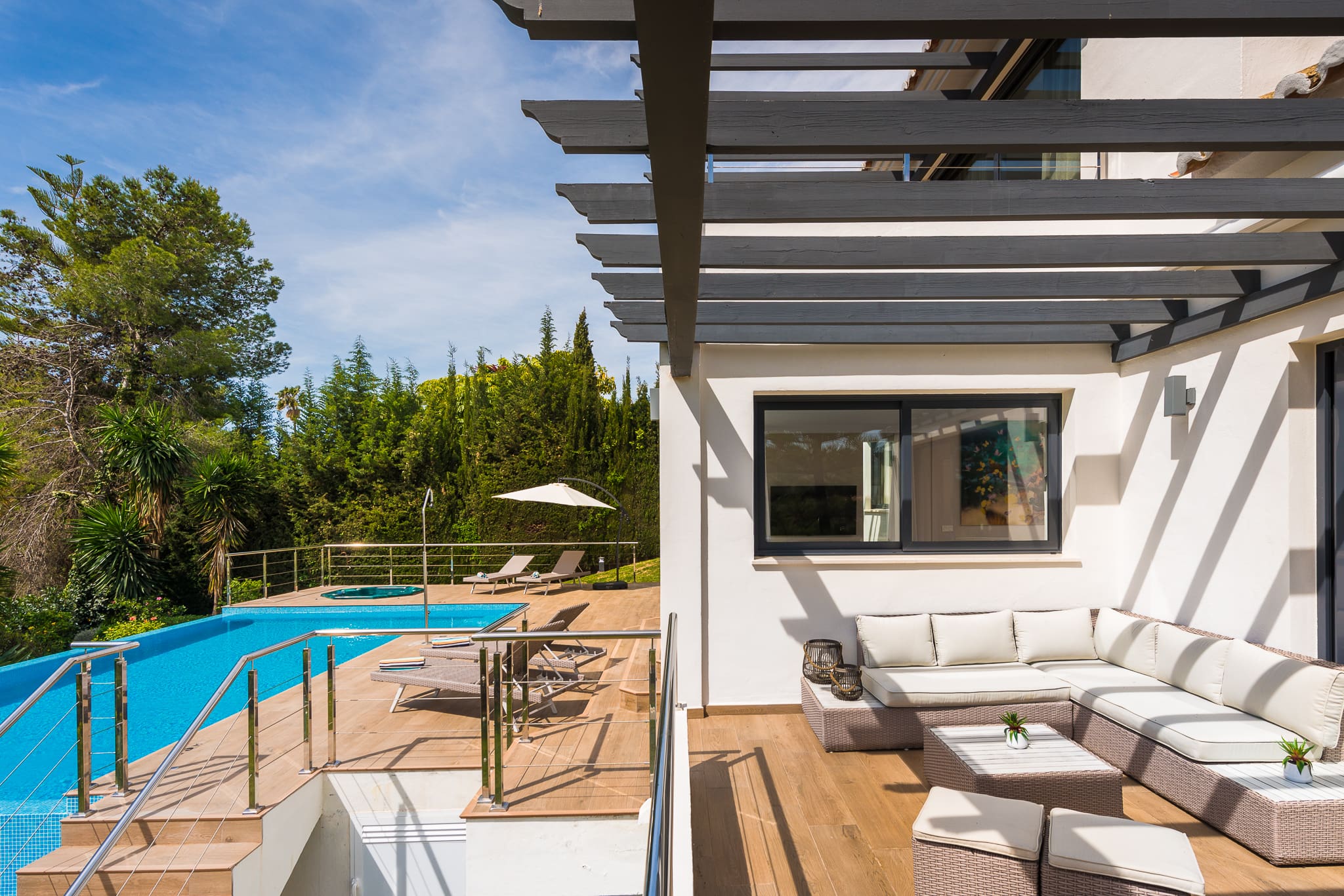 The outdoor areas of Casa Almijara Fuengirola are nothing short of spectacular. The heated infinity pool provides a refreshing escape, while the hot tub offers a soothing retreat under the stars. Enjoy alfresco dining with the BBQ set amidst lush gardens and terraces, all with views of the nearby golf course. The proximity to the beach and city ensures you can enjoy both tranquility and excitement during your stay.