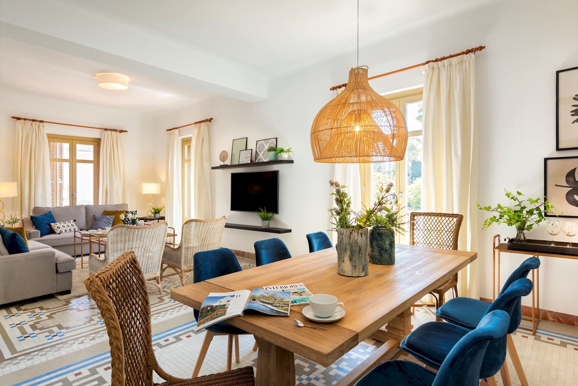 Step inside this exquisite apartment and be greeted by a blend of contemporary design and traditional charm. The spacious living room, equipped with air-conditioning, provides a cool retreat from the summer sun, while the hydraulic mosaic flooring adds a touch of heritage elegance. The fully equipped kitchen is ideal for preparing family meals, and the dining table doubles as a workspace for remote working. With four beautifully appointed bedrooms, this apartment comfortably accommodates up to eight guests, though you’ll share two bathrooms among you.