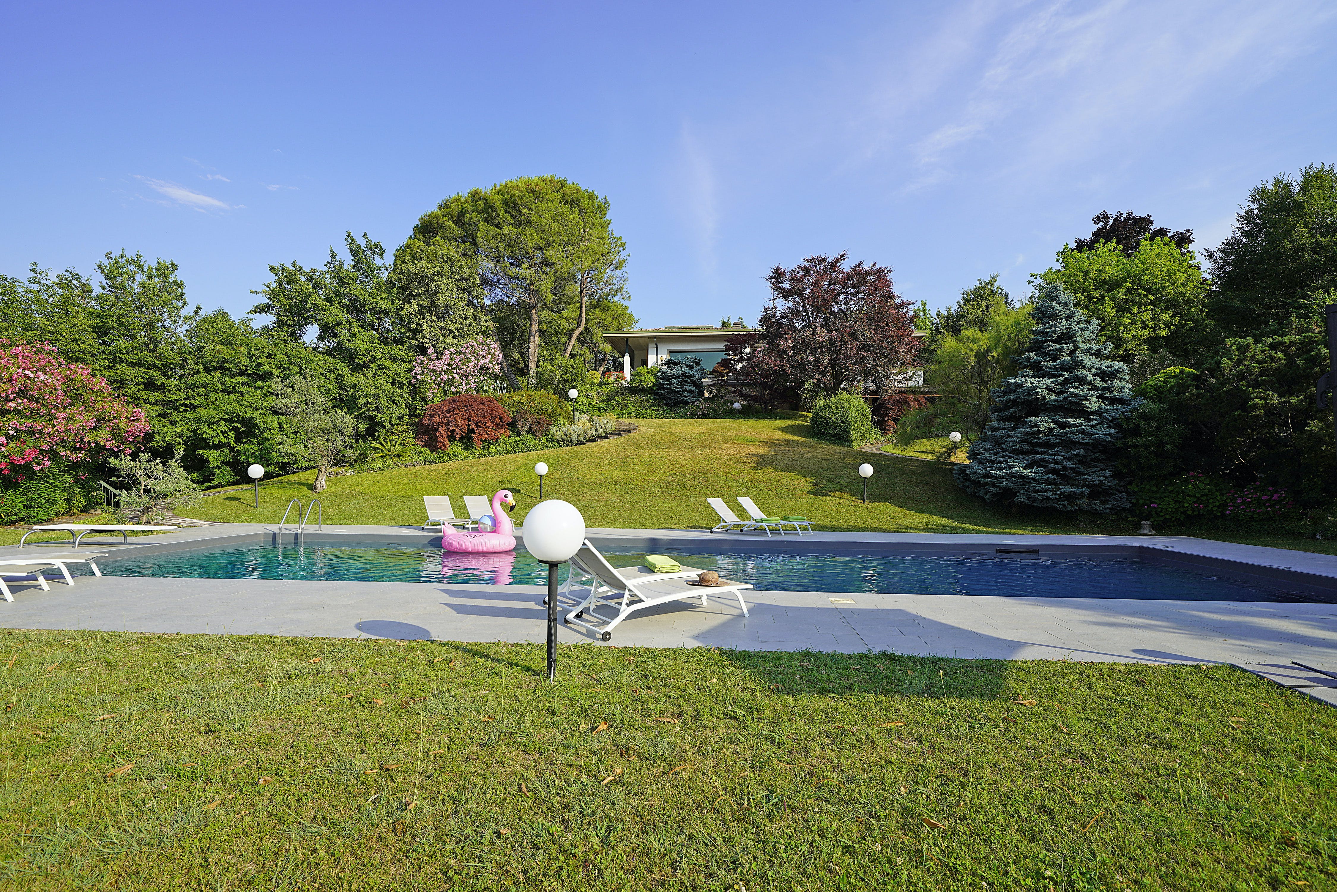 The outdoor spaces are as captivating as the interior. A private swimming pool invites you to unwind under the Italian sun, while the terrace offers a perfect spot for alfresco dining with views of the lush landscape. The surrounding gardens provide a tranquil setting for leisurely strolls, adding to the apartment’s appeal as a serene getaway in Brescia.
