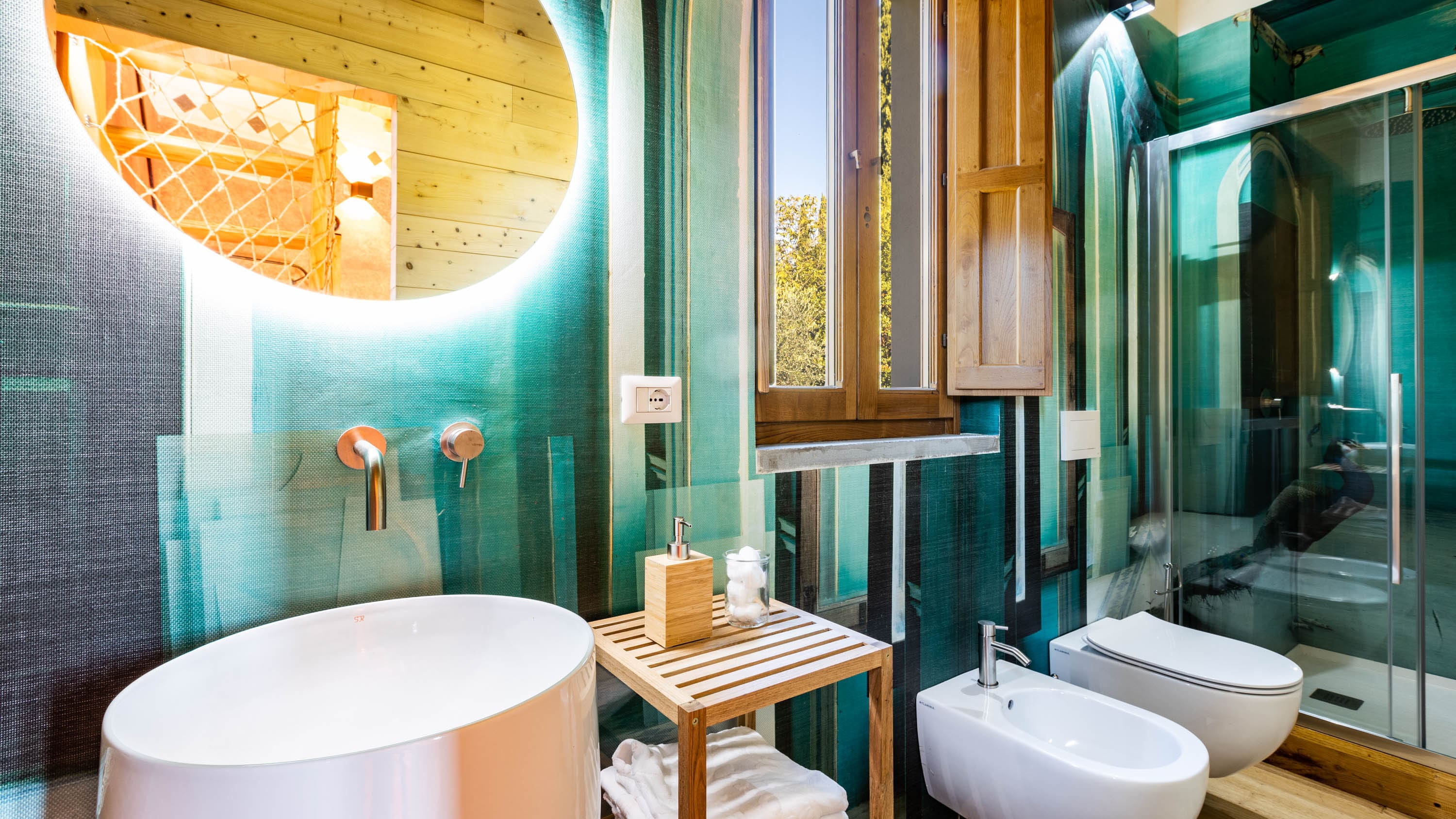 Casa Buggiano Pistoia welcomes you with a harmonious blend of contemporary design and classic Tuscan elements. The spacious living room, adorned with bold colors and frescoes, boasts a cozy fireplace and exposed beamed ceilings that add a touch of rustic charm. The modern kitchen is fully equipped, ideal for preparing home-cooked meals, while each of the five bedrooms offers a unique style and comfort. With six elegant bathrooms, guests are assured of privacy and convenience throughout their stay.