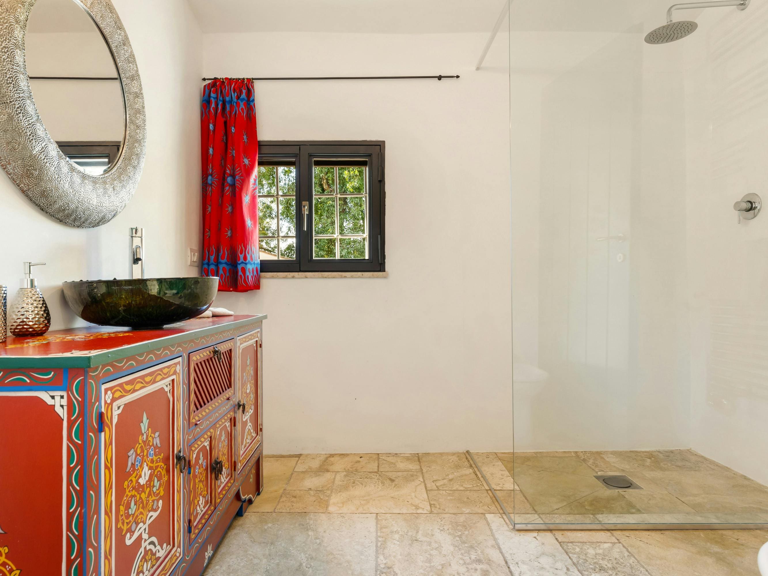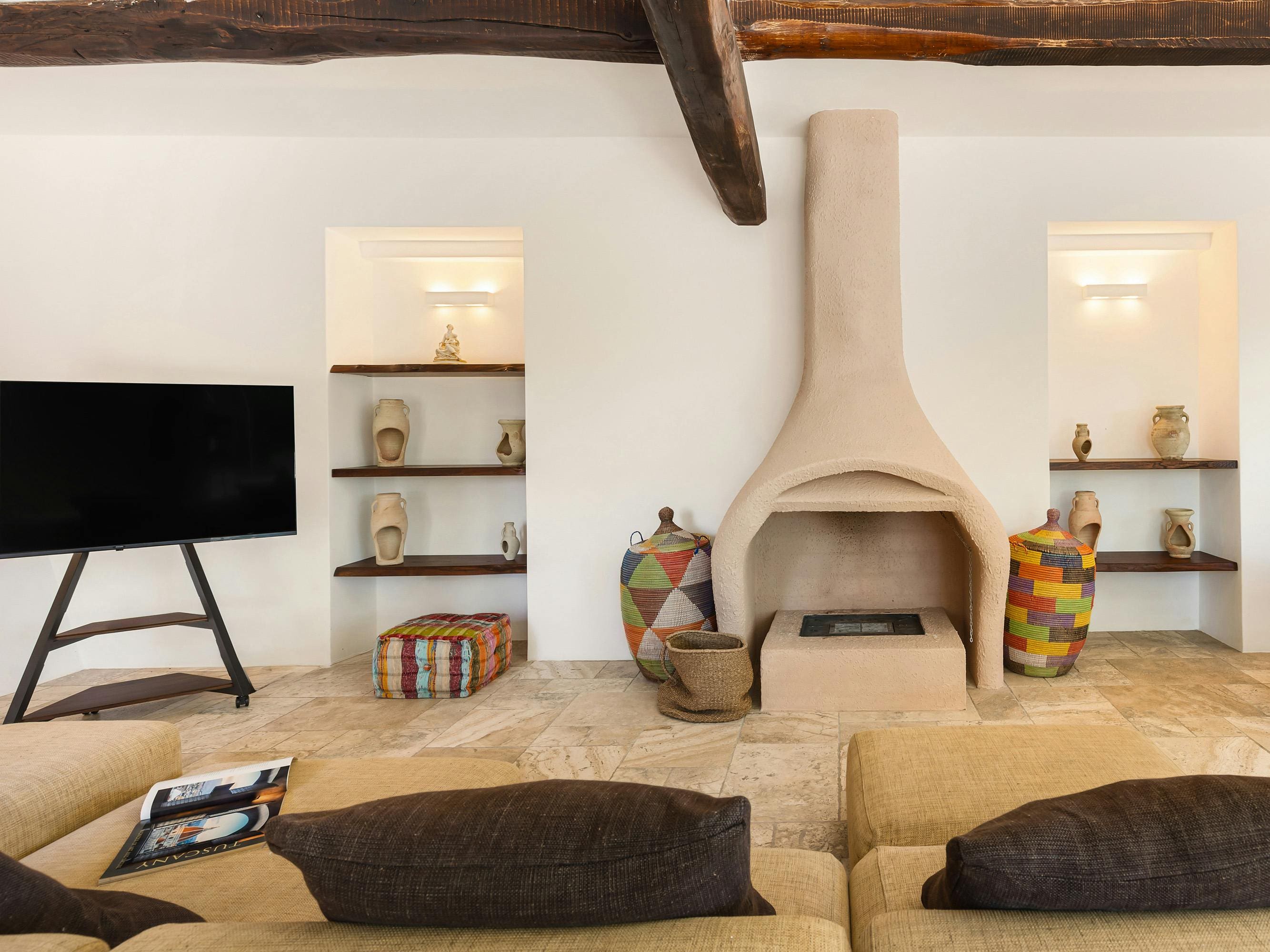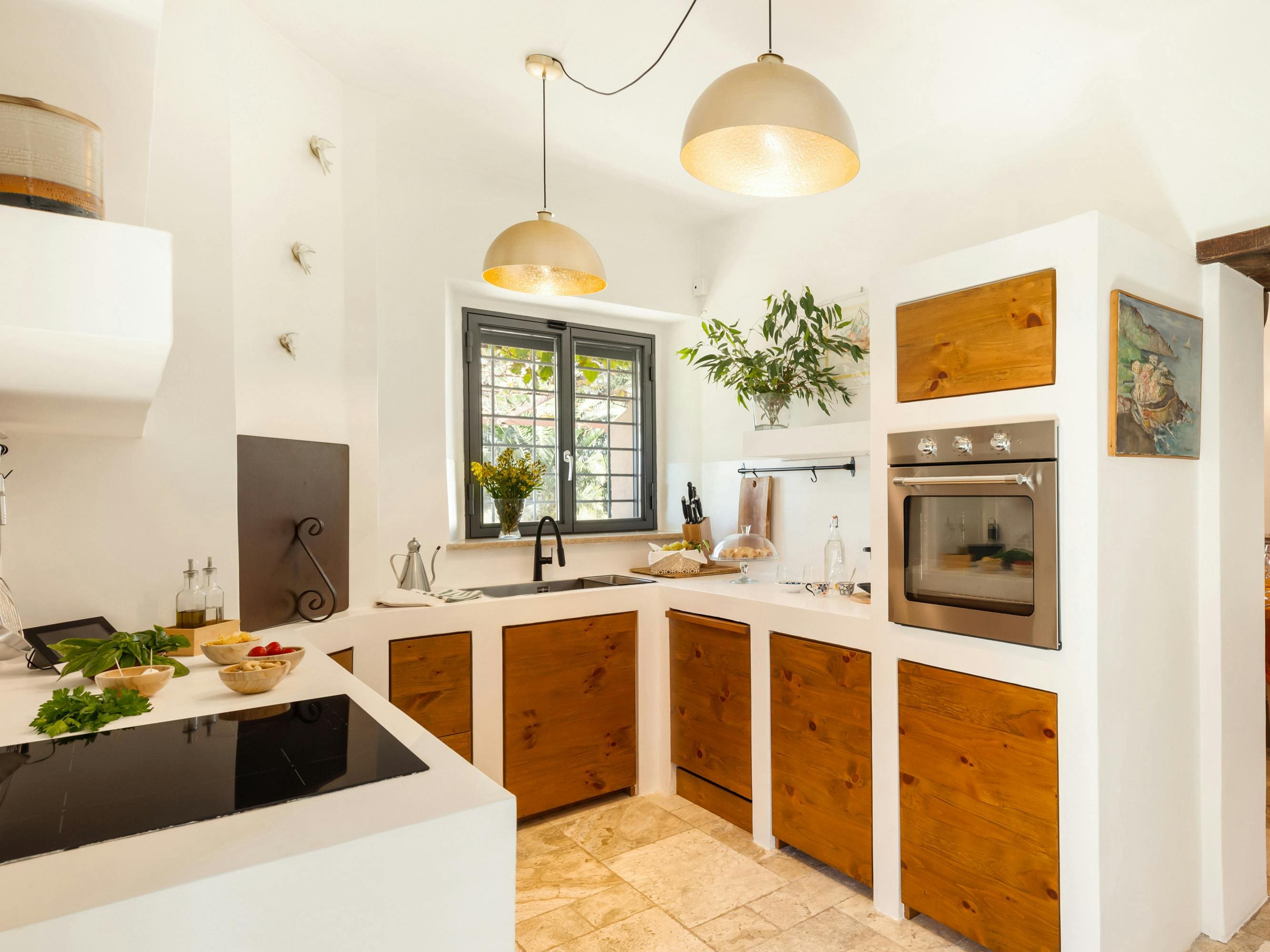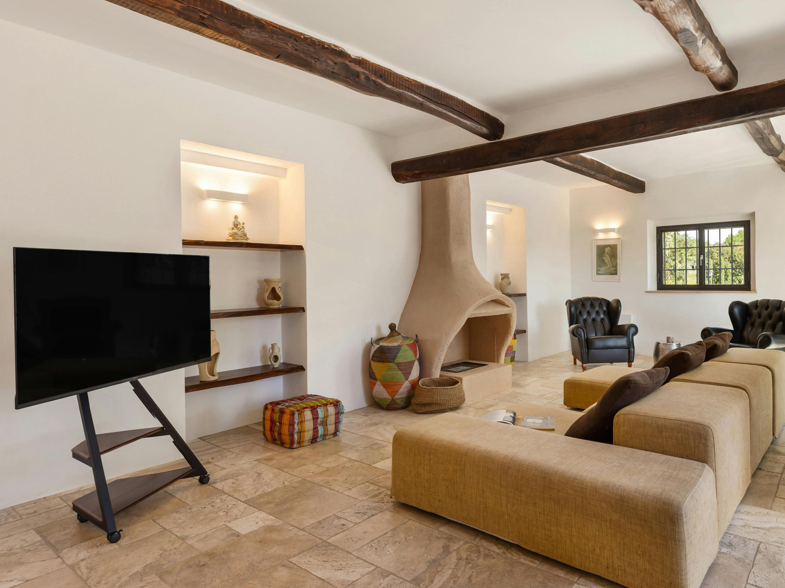 Step inside to discover a tastefully designed interior where modern comforts meet rustic charm. The villa features three spacious bedrooms, each elegantly furnished to ensure a restful night’s sleep. The open-plan living area is inviting and perfect for gatherings, with plush seating and a state-of-the-art entertainment system. The well-equipped kitchen is a culinary playground, perfect for cooking local delicacies. With handcrafted travertine floors and exposed chestnut beams, the villa exudes warmth and sophistication.