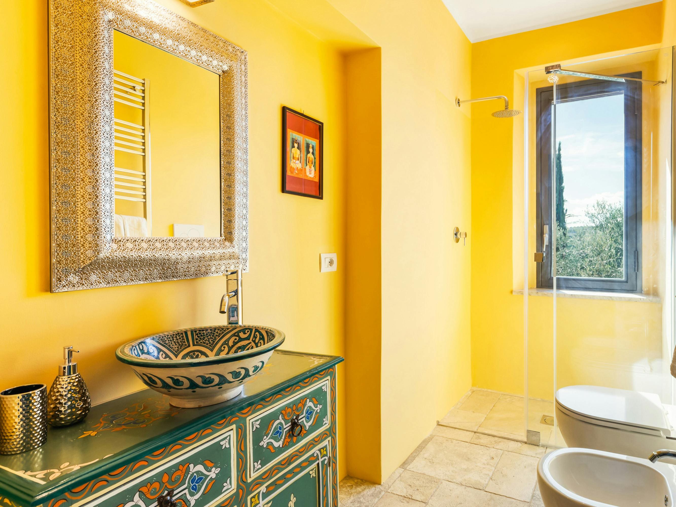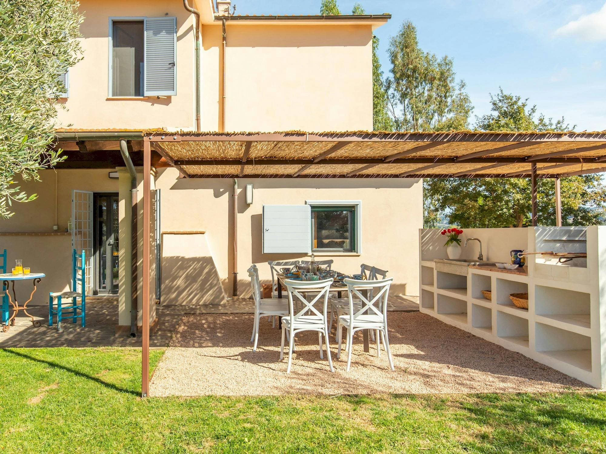 Outside, the villa’s private pool invites you to take a refreshing dip while enjoying the stunning views of the Tuscan landscape. The well-maintained garden, adorned with eucalyptus and olive trees, provides a tranquil setting for relaxation. Dine alfresco under the shade of a bamboo pergola, or explore the organic garden for fresh produce to complement your meals.