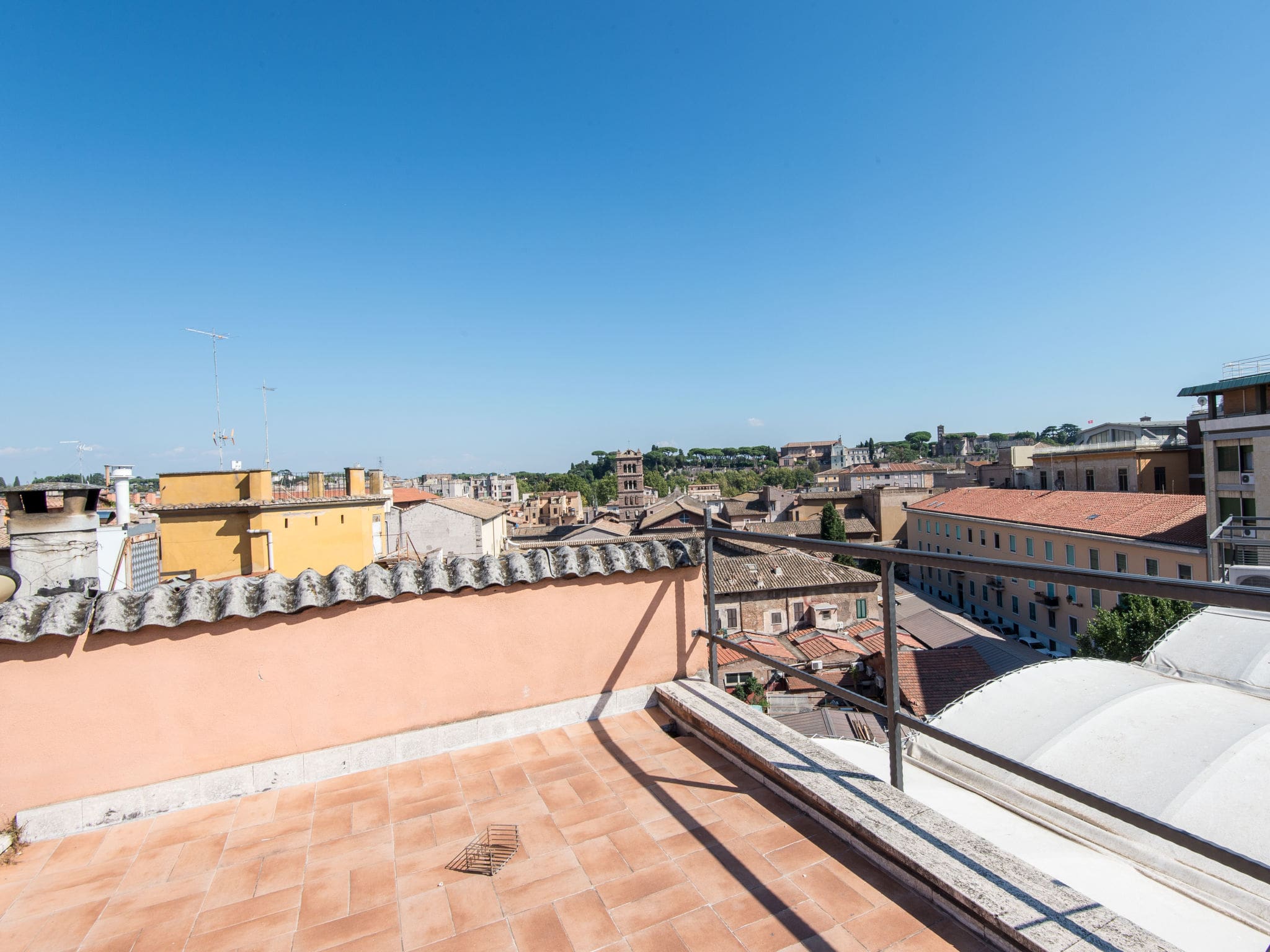The apartment’s crowning feature is its private terrace, furnished for outdoor relaxation and dining. From this elevated vantage point, guests enjoy magnificent panoramic views across Rome’s historic skyline, with ancient domes and bell towers creating a breathtaking backdrop. The terrace provides an ideal setting for morning coffee while watching the city awaken, or evening aperitivos as the golden light bathes the eternal monuments. The peaceful outdoor space offers a tranquil retreat from the vibrant street life below.