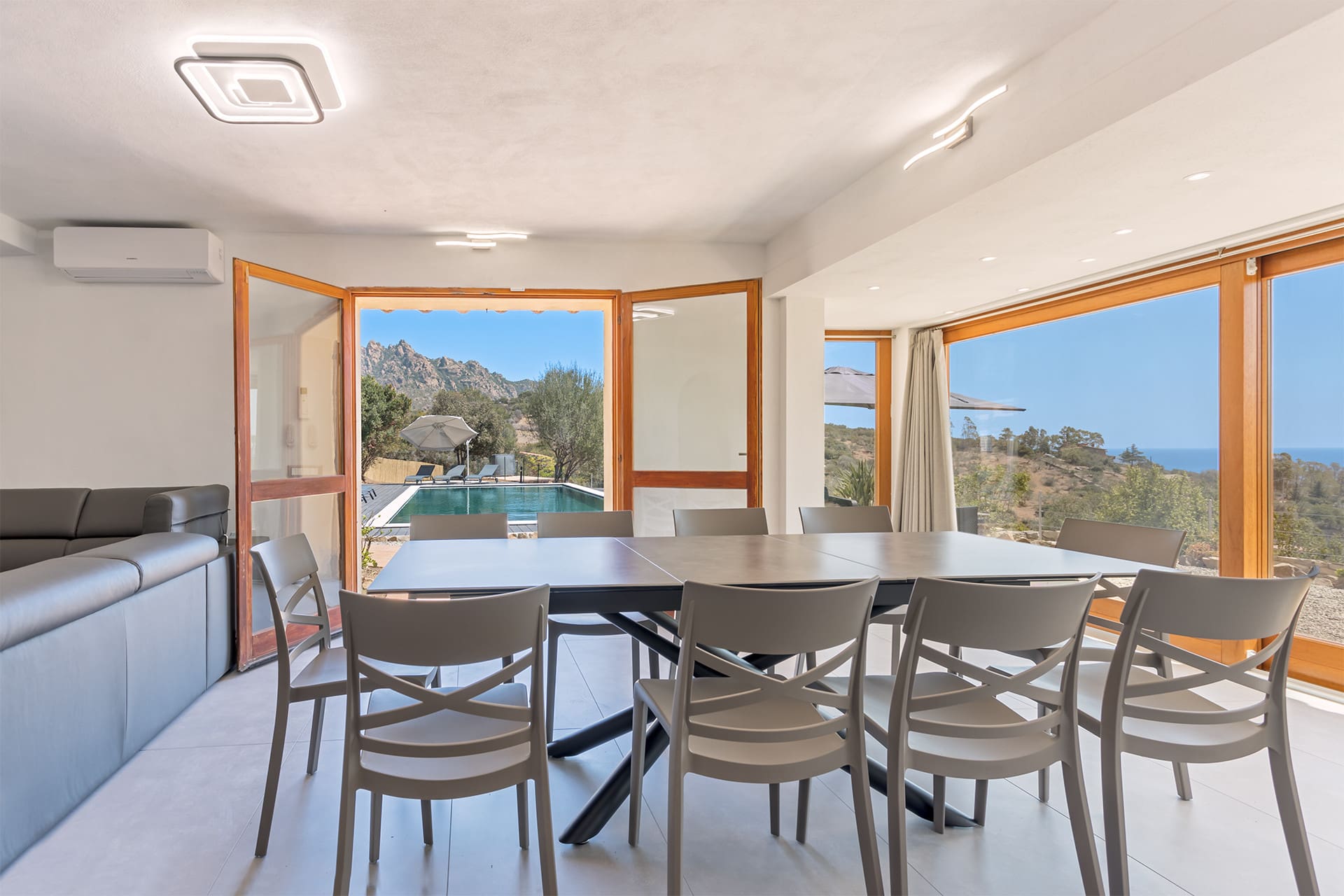 Step inside to find a spacious and elegantly designed interior that blends modern comforts with traditional Sardinian charm. The open-plan living area is perfect for gatherings, featuring plush seating and large windows that frame the idyllic landscape. A fully equipped kitchen caters to culinary enthusiasts, while the dining area invites you to savor meals together. Each of the five bedrooms is a tranquil sanctuary, offering plush bedding and tasteful décor, and the four luxurious bathrooms ensure privacy and convenience for all guests.