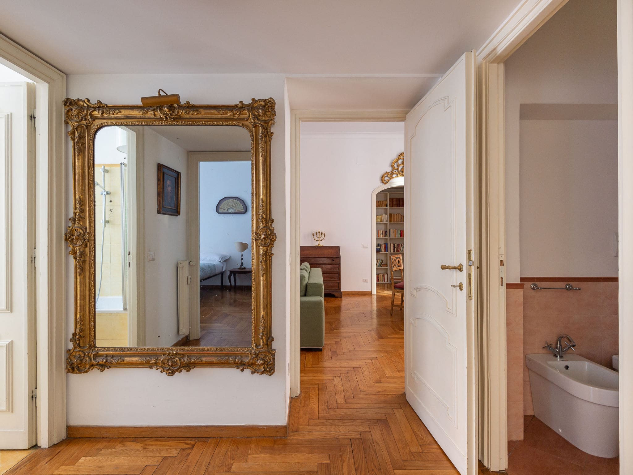This beautifully appointed 100-square-meter apartment occupies the piano nobile of an elegant historical building, showcasing the perfect marriage of Roman heritage and modern comfort. The spacious living room features a decorative open-hearth fireplace and flat-screen television, complemented by sophisticated air conditioning throughout. Gleaming parquet floors flow seamlessly through the residence, while double-glazed windows ensure tranquil rest despite the vibrant city location. Two generously proportioned double bedrooms each feature their own flat-screen televisions and premium furnishings, while two full bathrooms offer both bathtub and shower configurations with bidets. The fully equipped kitchen boasts four hot plates, oven, dishwasher, and modern amenities, perfect for preparing meals with fresh ingredients from nearby Roman markets.