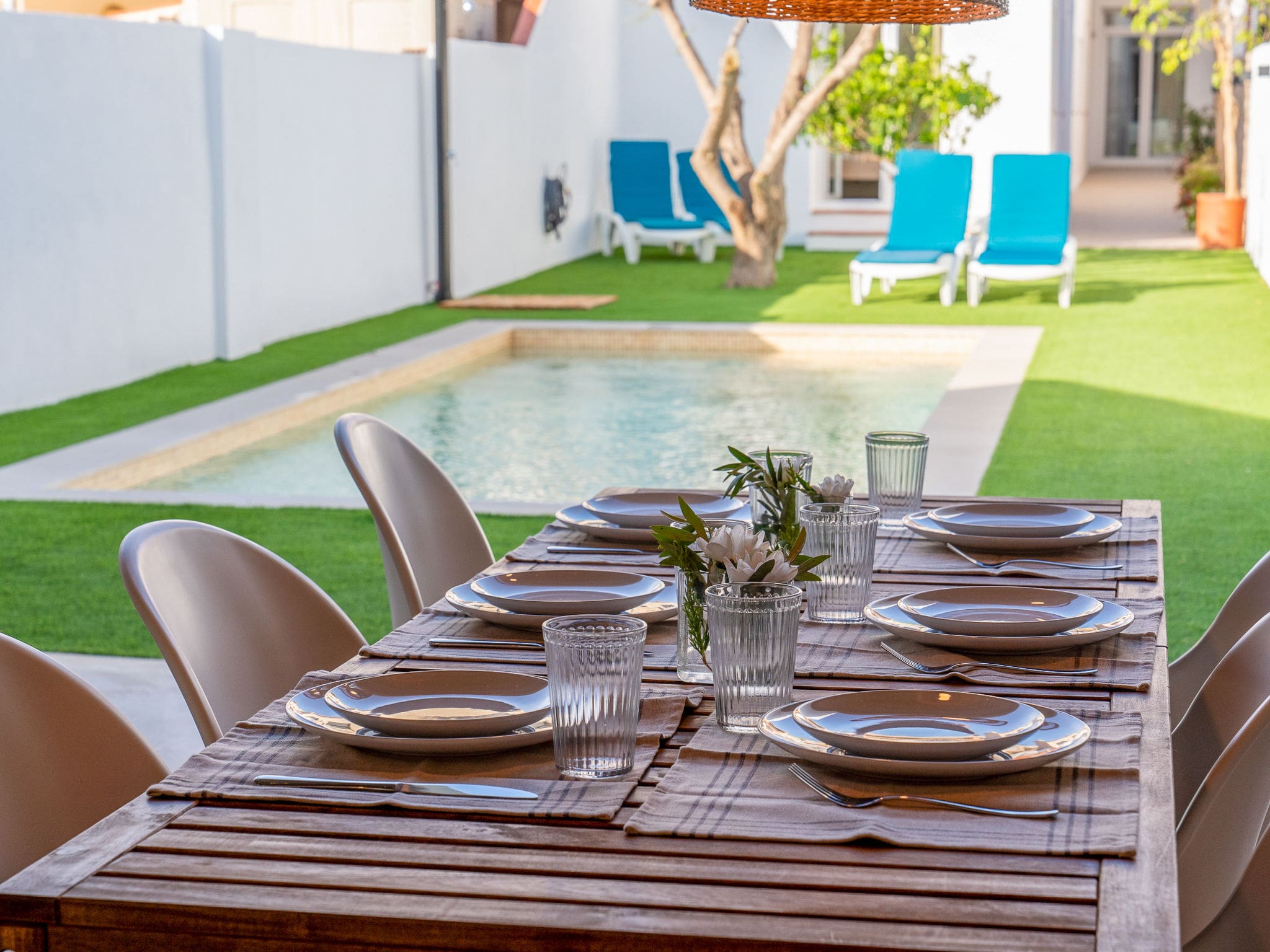 The private outdoor space truly elevates this property above ordinary holiday rentals. The fenced garden with pristine lawn provides secure space for children and pets to play, while the sparkling 7×3 metre swimming pool becomes the natural centrepiece for days of Mediterranean relaxation. Pool depths ranging from 120-150cm accommodate both serious swimmers and younger family members safely.