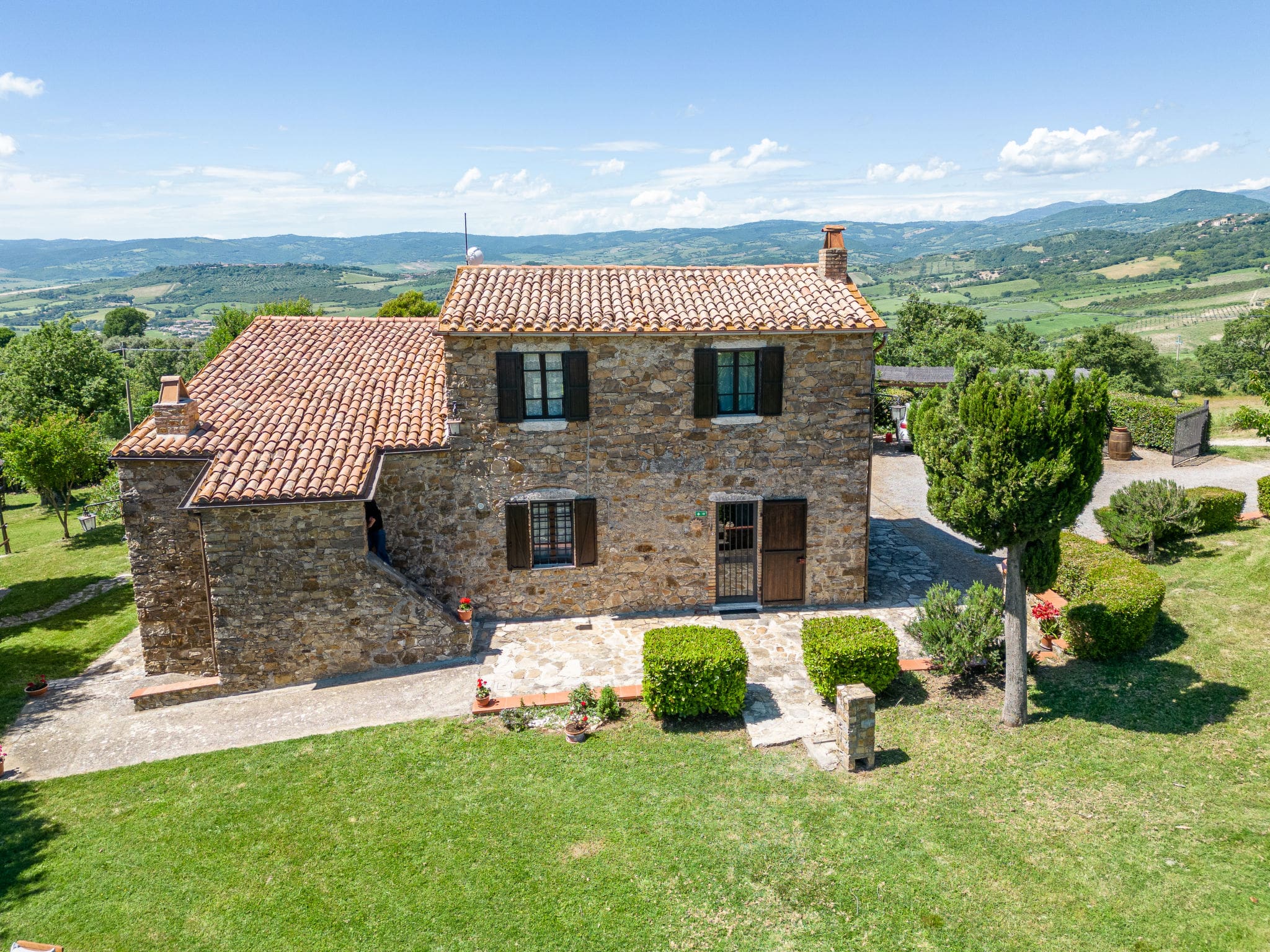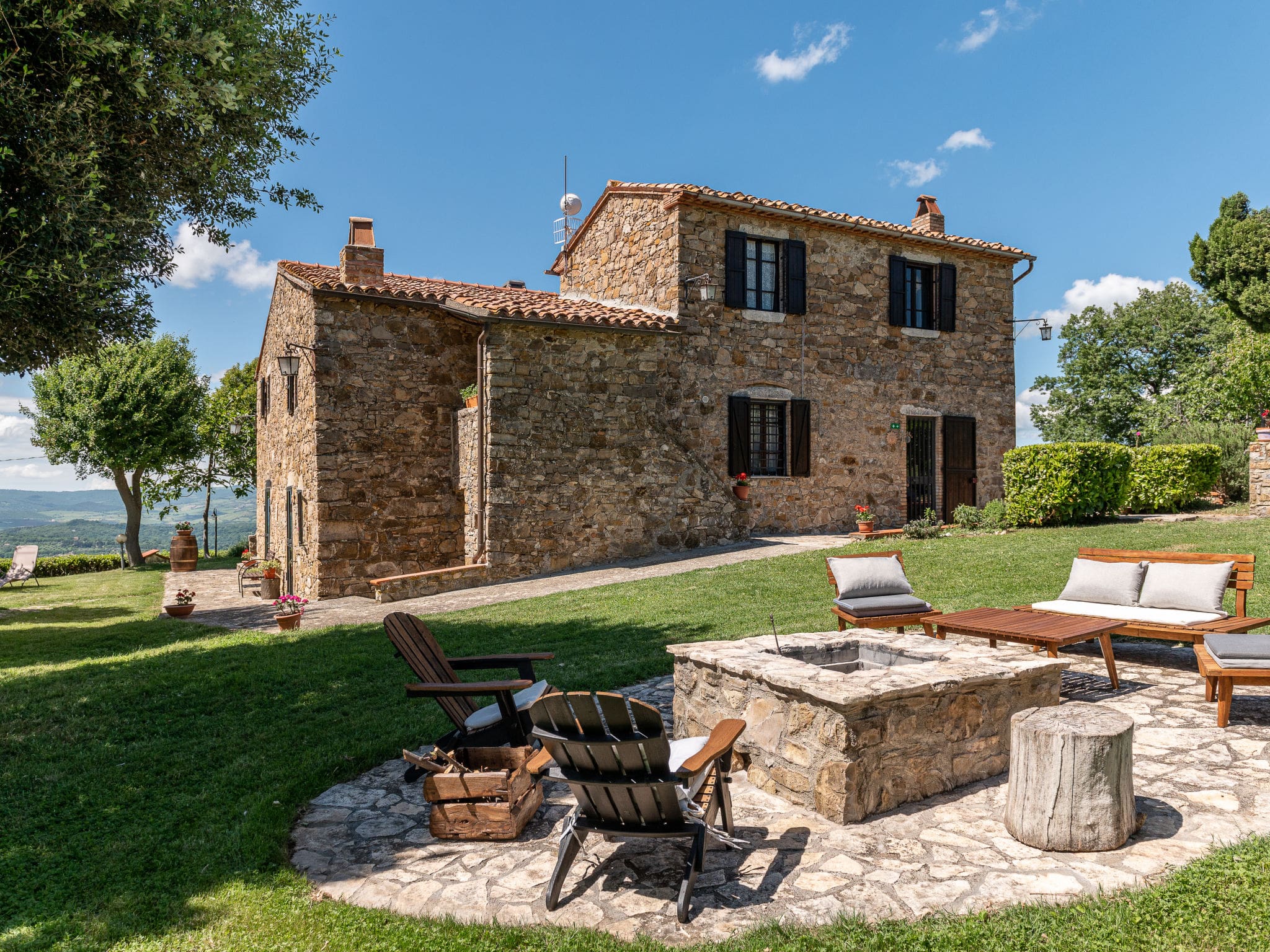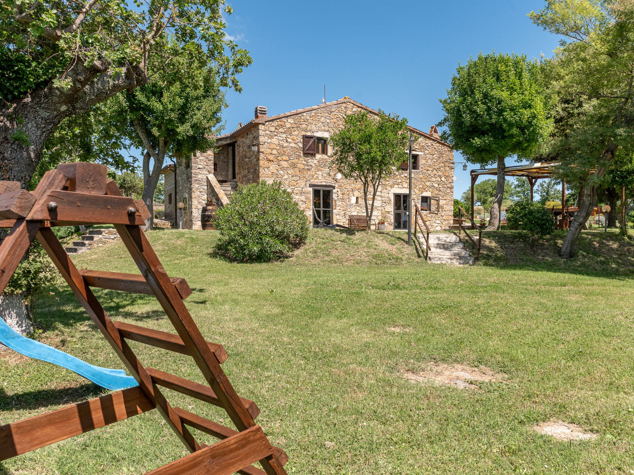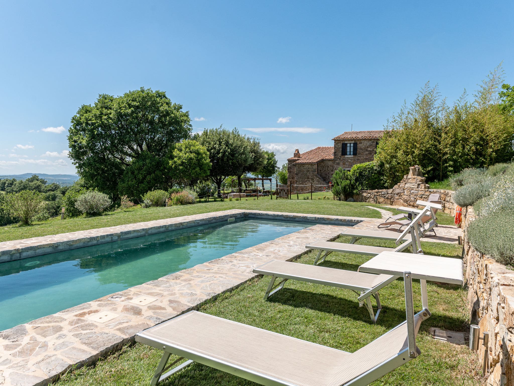 The extensive grounds include a beautifully maintained terraced garden with native wildlife areas and mature trees providing natural shade. A dedicated children’s playground keeps younger guests entertained, while the outdoor barbecue and dining areas create perfect settings for evening gatherings. An outdoor shower adds convenience for pool users, and the property’s elevated position offers breathtaking panoramic views across the Maremma countryside.