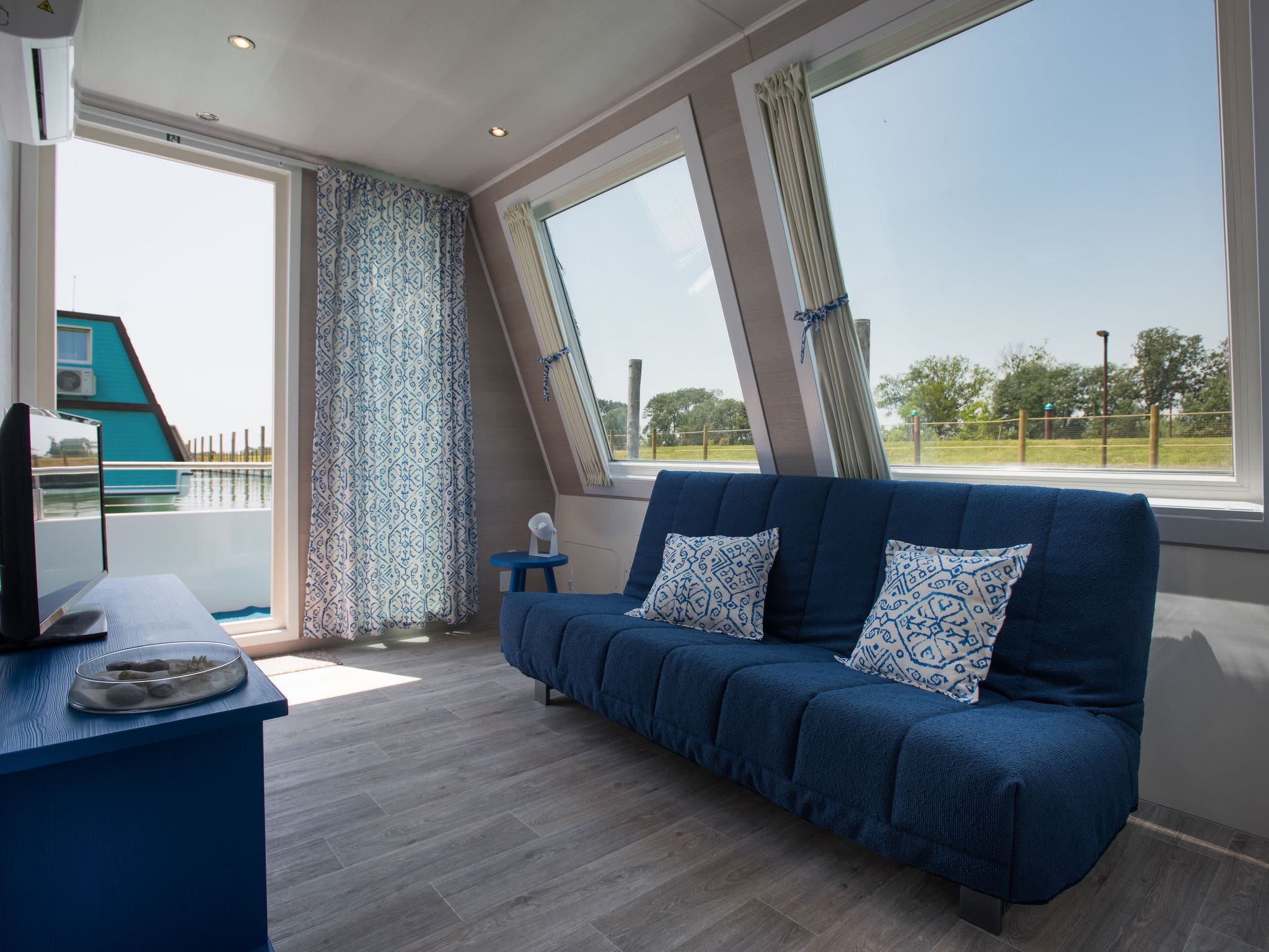 This distinctive houseboat-style villa combines maritime charm with modern luxury across its two levels. The ground floor welcomes you with an elegant living and sleeping area featuring a comfortable double sofa bed, dining space, and satellite television, all complemented by direct access to your private terrace. The master bedroom includes an en-suite dressing room for added convenience, while a second bedroom accommodates two guests. A well-appointed shower room completes the ground level.
