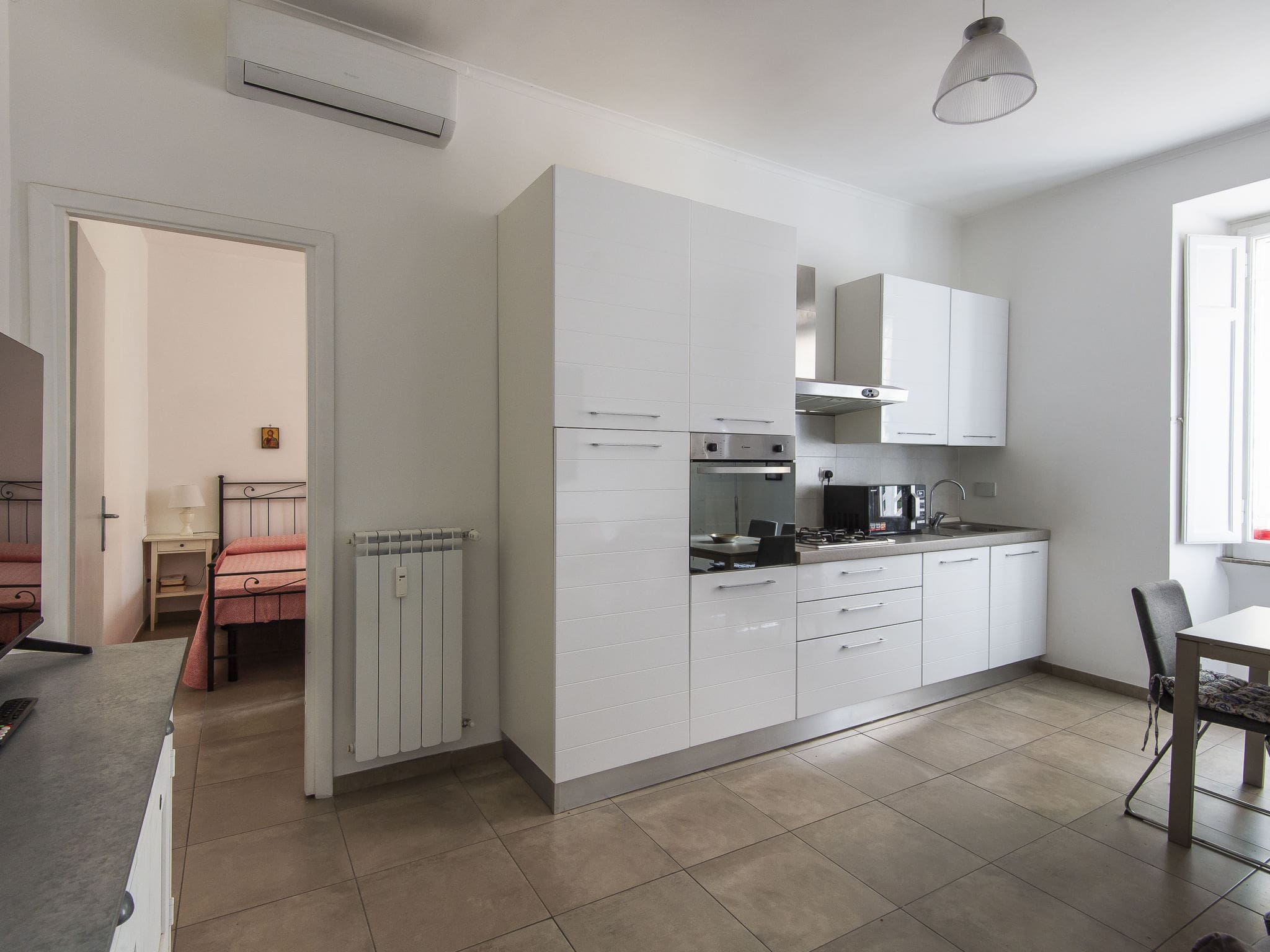 Bright and beautifully renovated, this 40-square-meter apartment occupies the first floor of an elegant building with elevator access. The open-plan living space features a comfortable sofa bed, dining area, and fully equipped kitchen corner with modern appliances including a dishwasher and oven. Air conditioning throughout ensures comfort during Rome’s warm summers, while the separate double bedroom provides a peaceful retreat with its own television and direct access to a charming balcony. The contemporary bathroom features a shower, bidet, and WC, maintaining the property’s high standards of comfort and convenience.