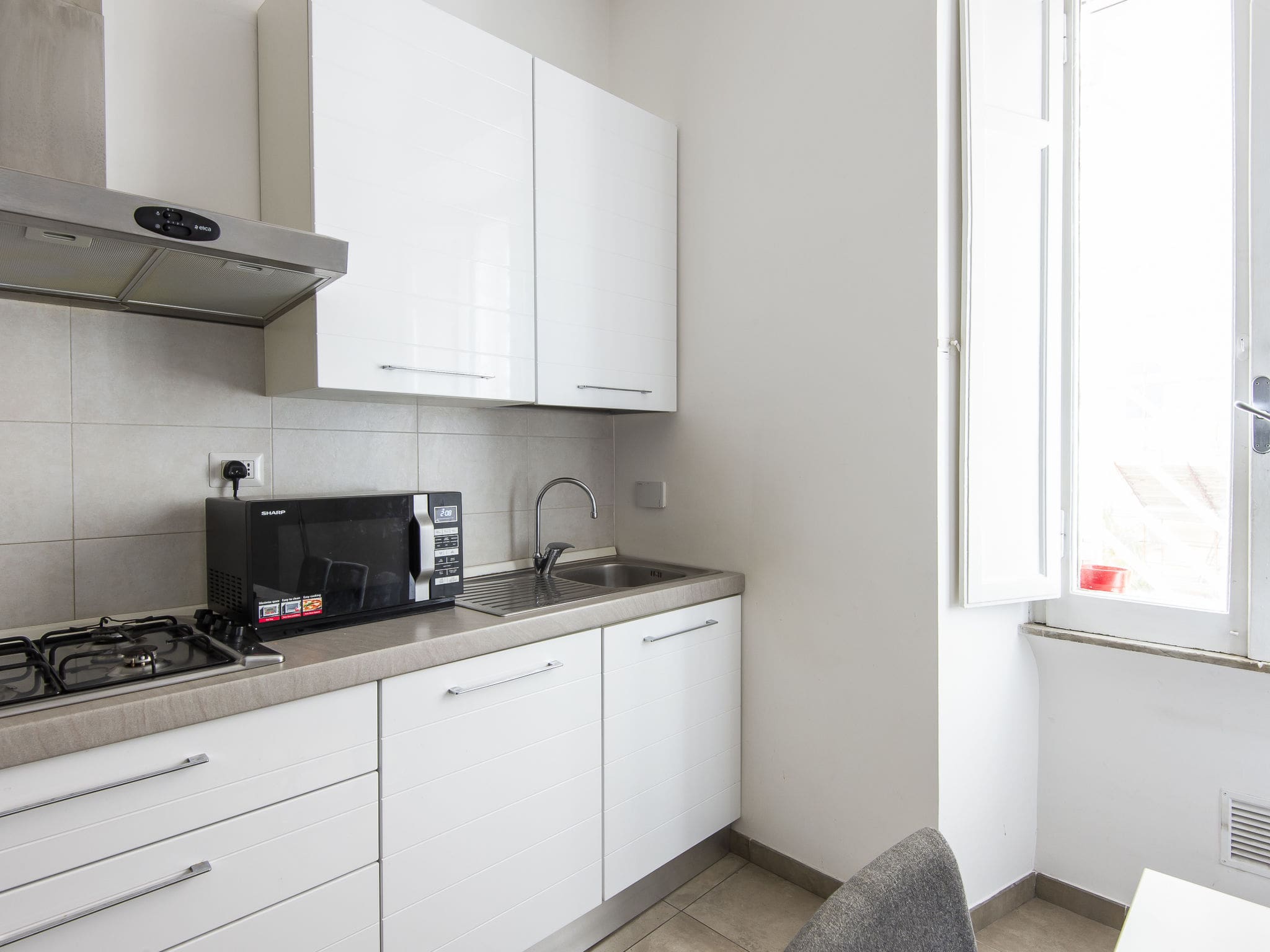 While compact, the apartment’s small balcony provides a delightful outdoor space where guests can enjoy morning coffee or evening aperitivos while soaking in the Roman atmosphere. The elevated position offers pleasant urban views over the well-maintained Prati district, and the balcony’s intimate size creates a perfect spot for quiet moments between days of sightseeing.