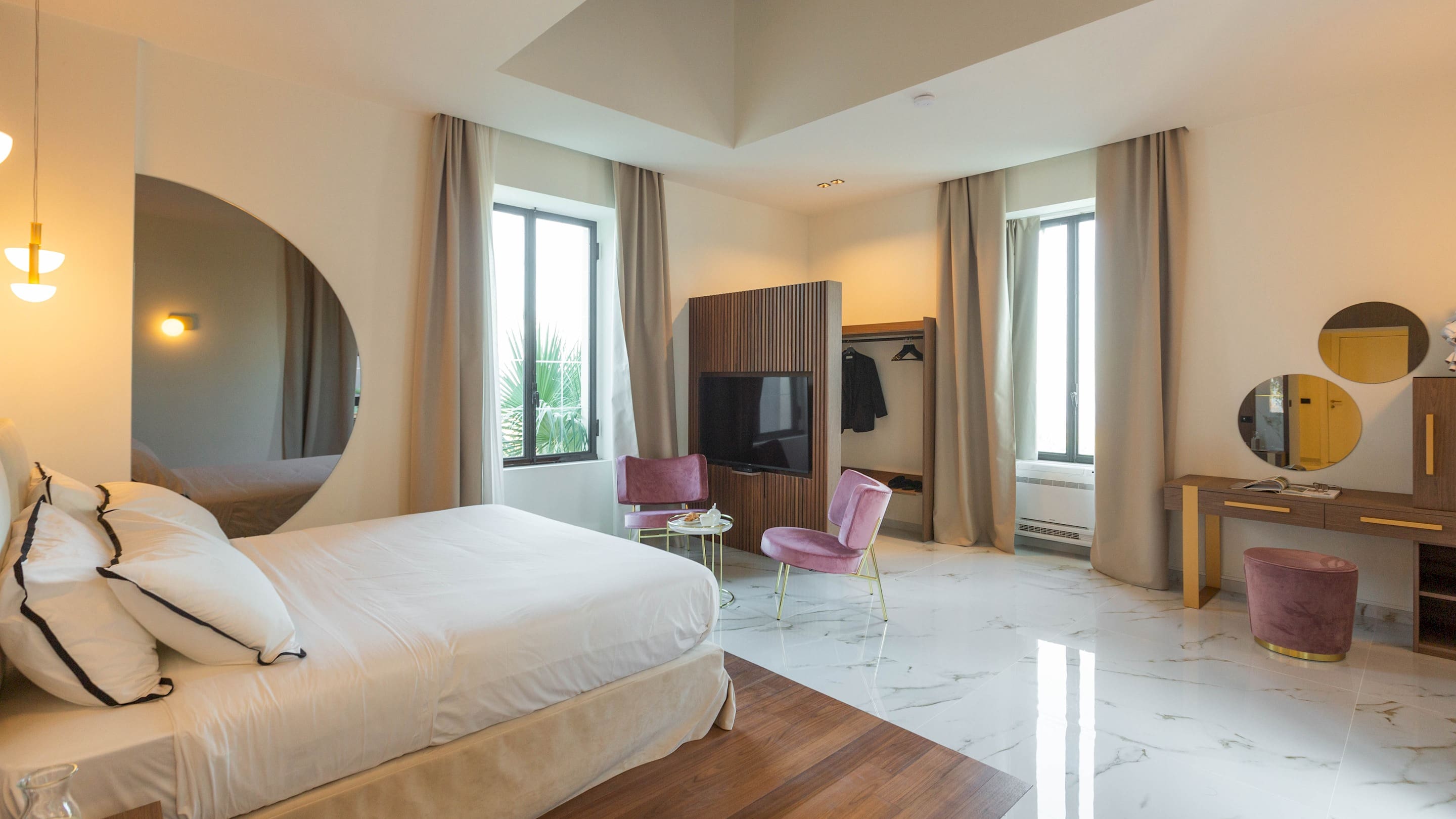 Embrace the Sicilian sun in the apartment’s outdoor oasis. The expansive terrace offers panoramic views of the sea, ideal for sipping Prosecco as the sun sets. The private swimming pool invites you for a refreshing dip, while the ground-floor wellness center, complete with a Jacuzzi and sauna, promises ultimate relaxation. Lush gardens filled with palm trees and potted plants create a tranquil environment for unwinding after a day of exploration.