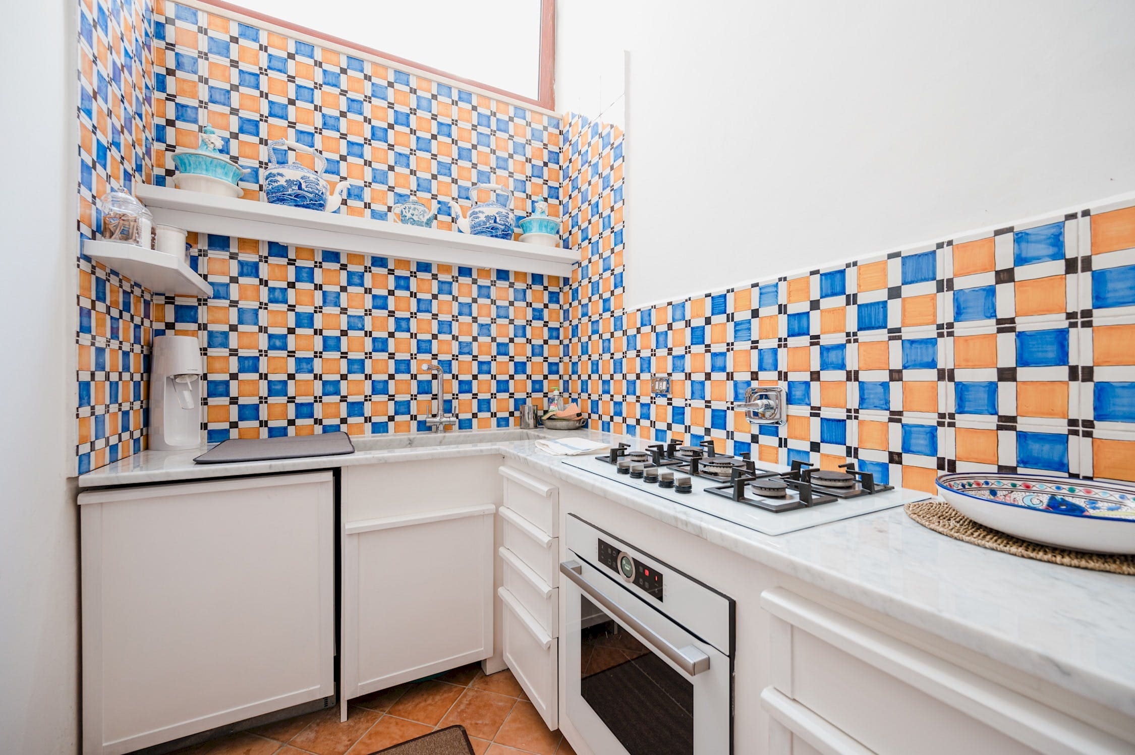 The interior of this Sorrento apartment exudes sophistication, blending traditional Italian charm with modern amenities. Spread across two floors, the apartment features three beautifully styled bedrooms, each with its own en-suite bathroom, providing comfort and privacy for all guests. The fully equipped kitchen invites culinary exploration with fresh local ingredients, while the elegantly furnished living areas offer a perfect setting for relaxation and entertainment. A dedicated desk space is available for those who need to work remotely during their stay.