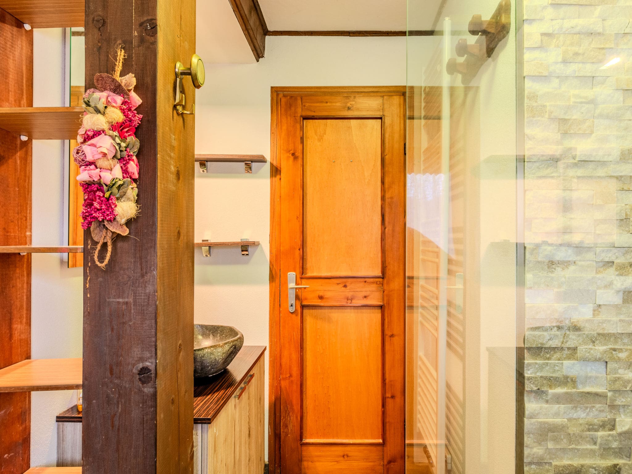 The accommodation comprises three double bedrooms, each featuring television and access to private balconies where you can wake to spectacular mountain vistas. The upper floor houses two additional double bedrooms, both offering peaceful retreats with their own entertainment systems. A modern shower room with bidet serves the property, while practical amenities include WiFi throughout, iron, and hairdryer.