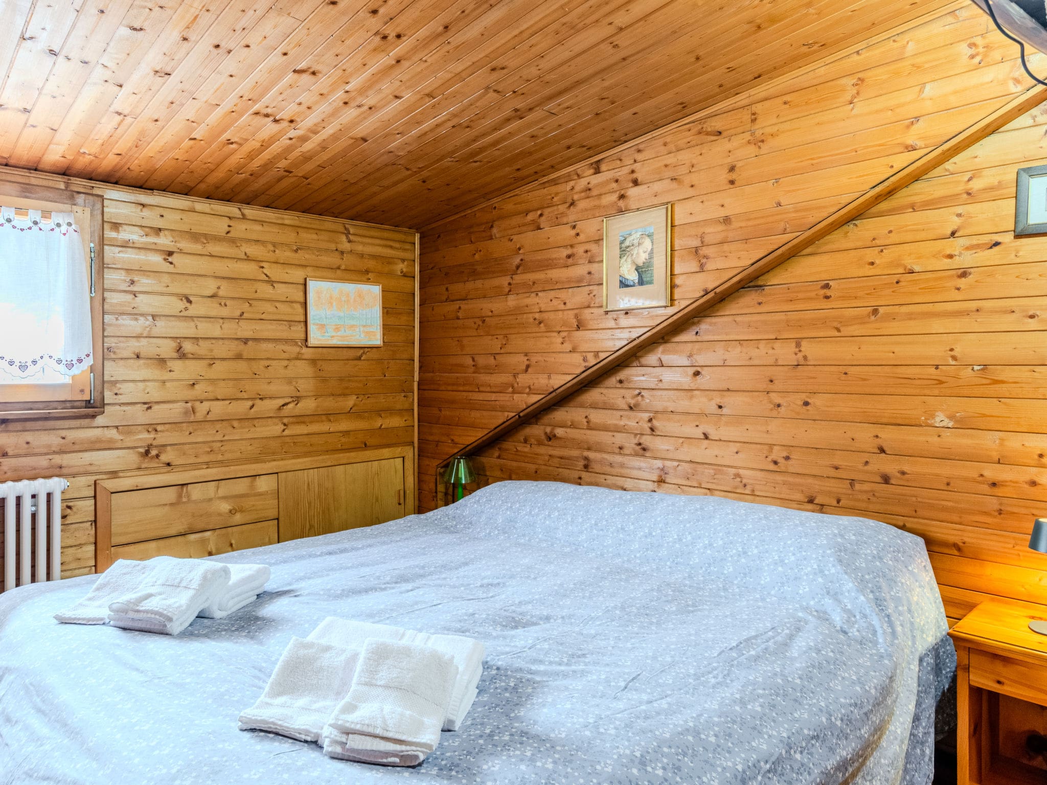 This inviting chalet welcomes guests with its spacious south-facing layout and abundance of natural light throughout. The main level features a comfortable living room complete with a decorative Scandinavian wood stove and dining area, creating the perfect gathering space for family and friends. The well-equipped kitchen includes modern appliances including dishwasher, induction hob, microwave, and all essential amenities for preparing memorable meals.