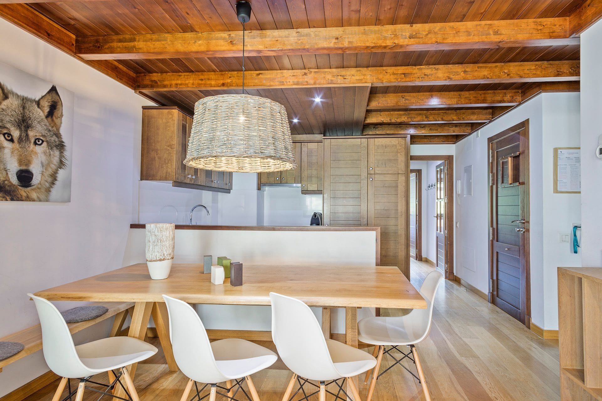 Step inside this charming apartment, and you’ll find a beautifully designed space that combines modern elegance with alpine warmth. The open-plan living area features a sleek, glass-fronted fireplace, perfect for cozy evenings after a day on the slopes. With minimalist furniture and pale wooden floors, the aesthetic is both sophisticated and welcoming. The kitchen, equipped with all essentials, complements the dining area, which offers picturesque views through a striking corner window. The accommodation includes a master bedroom with a plush double bed and a second bedroom featuring two sets of bunk beds, ideal for kids or larger groups.