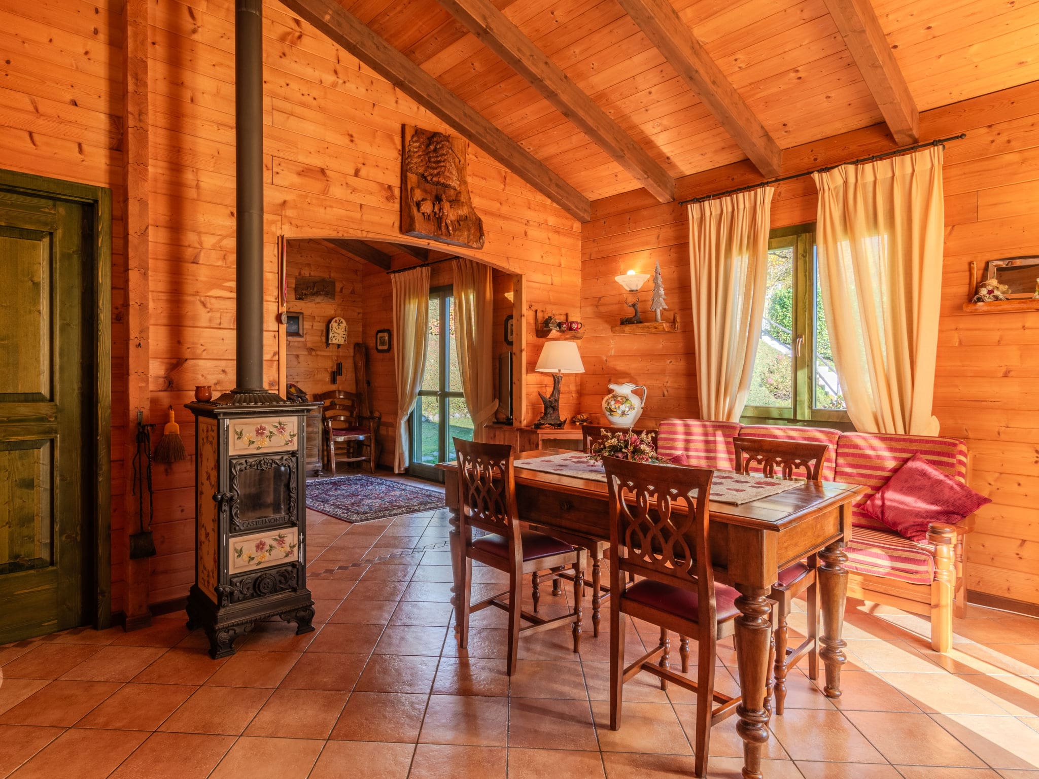 The 65-square-meter chalet unfolds across two levels, featuring warm wooden furnishings and natural stone floors that create an inviting alpine atmosphere. The ground floor hosts a comfortable double bedroom with an ensuite bathroom complete with shower, bidet and WC, plus direct access to the garden and swimming pool area. An exterior staircase leads to the upper level, where a spacious living and sleeping area combines relaxation and dining spaces around a decorative Scandinavian wood stove. This level includes a second double bedroom and a well-equipped kitchen with modern amenities including oven, dishwasher, gas stove, microwave and electric coffee machine. Both levels feature air conditioning and heating, with the upper floor opening onto a large balcony showcasing spectacular mountain vistas.